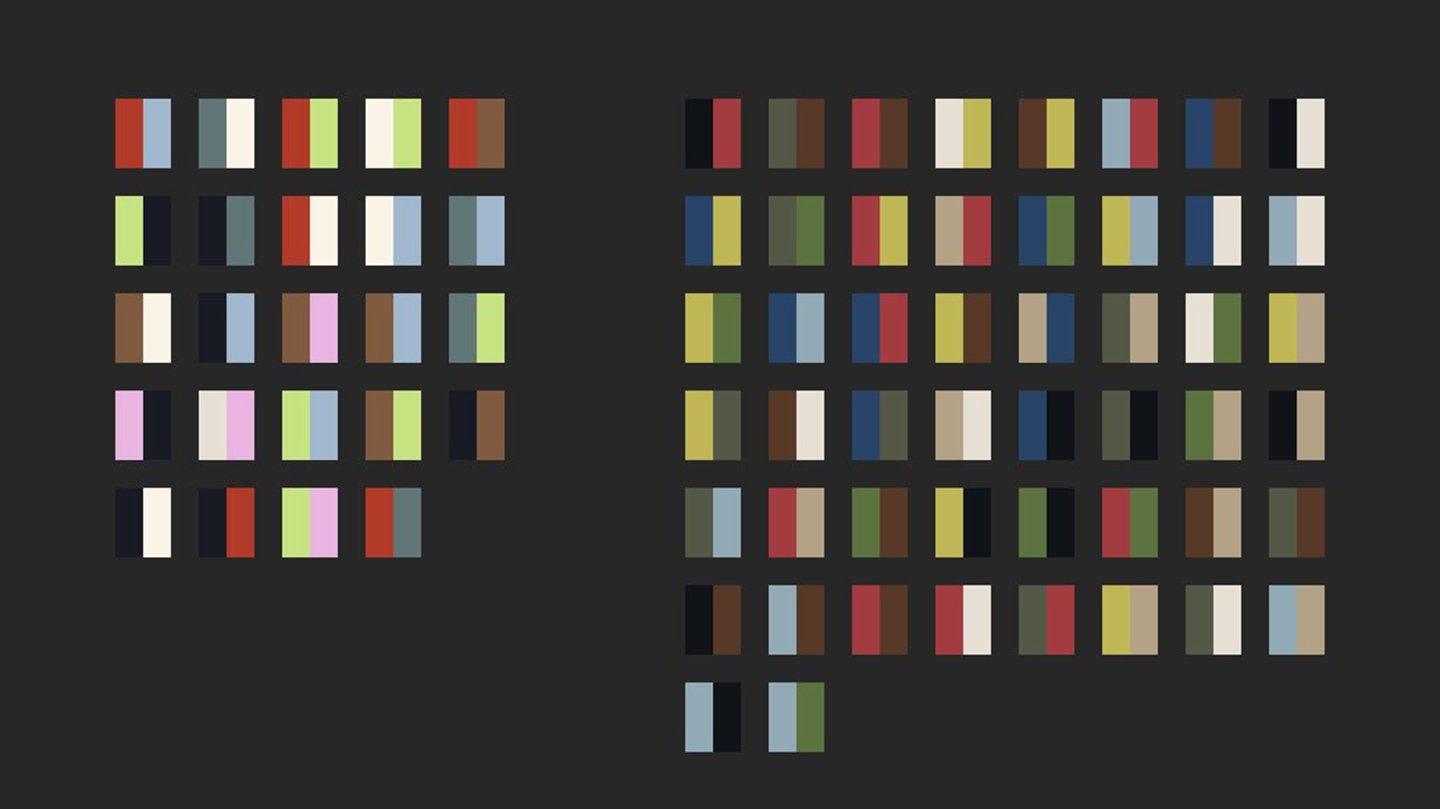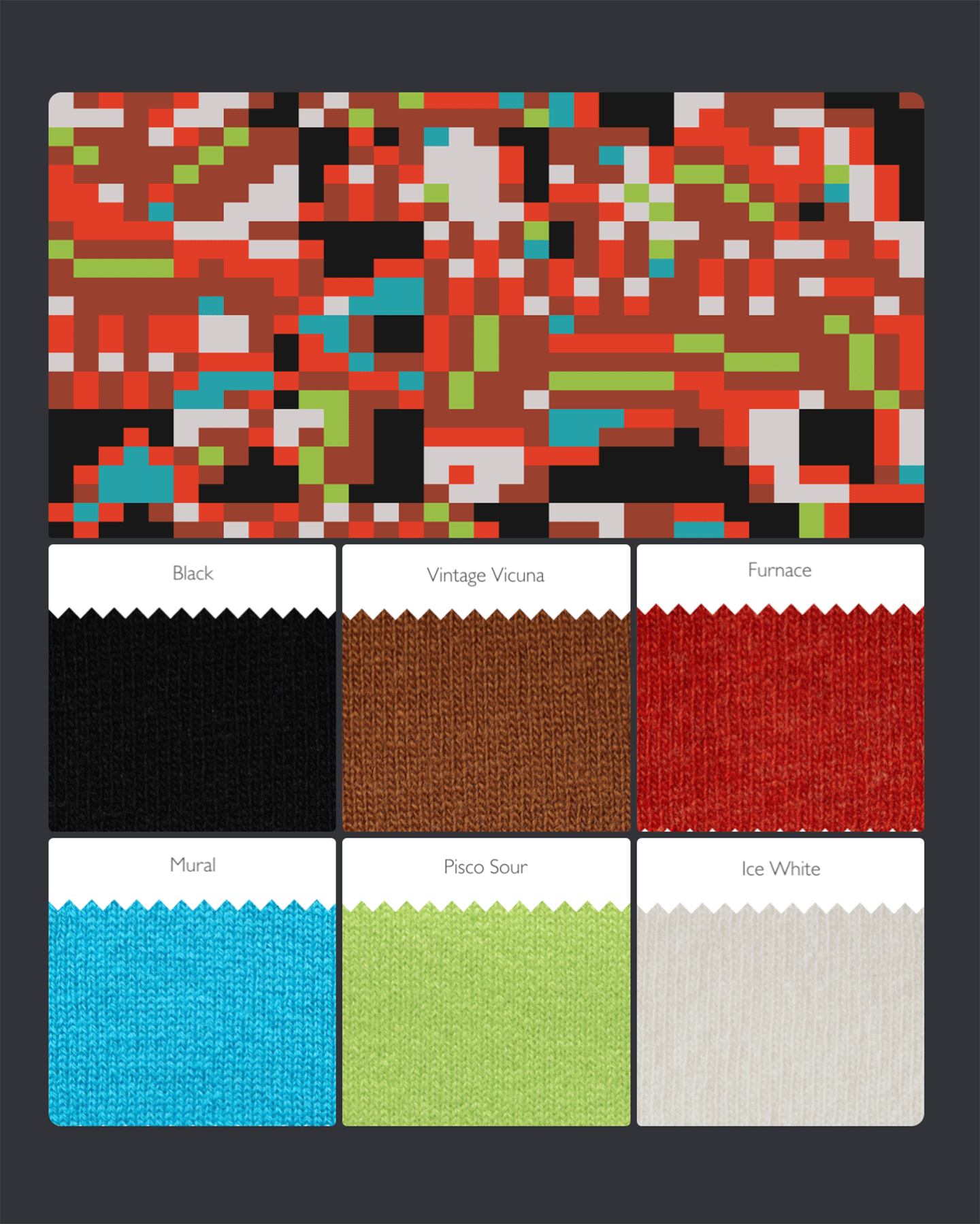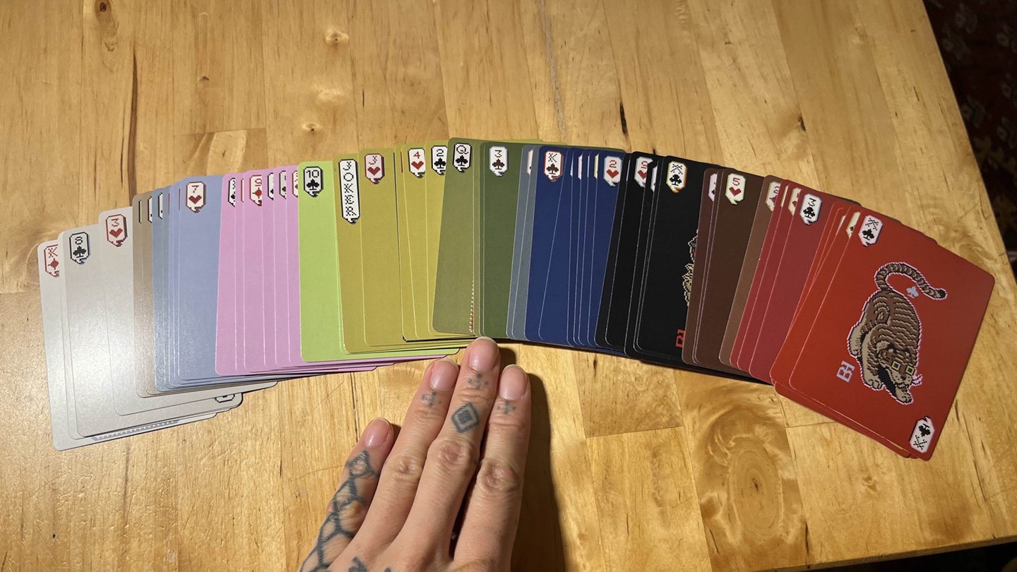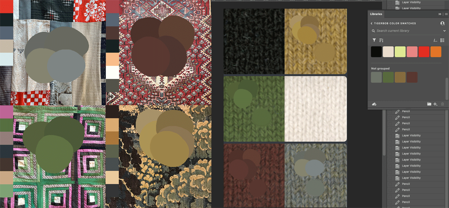 I begin working color alongside drawing and sketching. I use yarn swatches in addition to digital swatches. Colors are often sampled from real-life inspirations like those shown in the section above.Left & right: Colors swatched with cashmere yarn cards from vintage textiles in my collection.Above: Digital swatch process in Adobe Photoshop from photos of vintage textiles in my collection. Below: The same digital swatches placed in pairs to explore color combinations.Left: Balls of yarn organized by color during intarsia knitting planning. Right: Colored pencils selected for drawing.A post-production view of the Tigerbob Playing Cards, showing the palette in a new fashion. Review of color and form in past projects helps solidify brand identity for current and future projects.DESIGN: TEXTILES & APPAREL