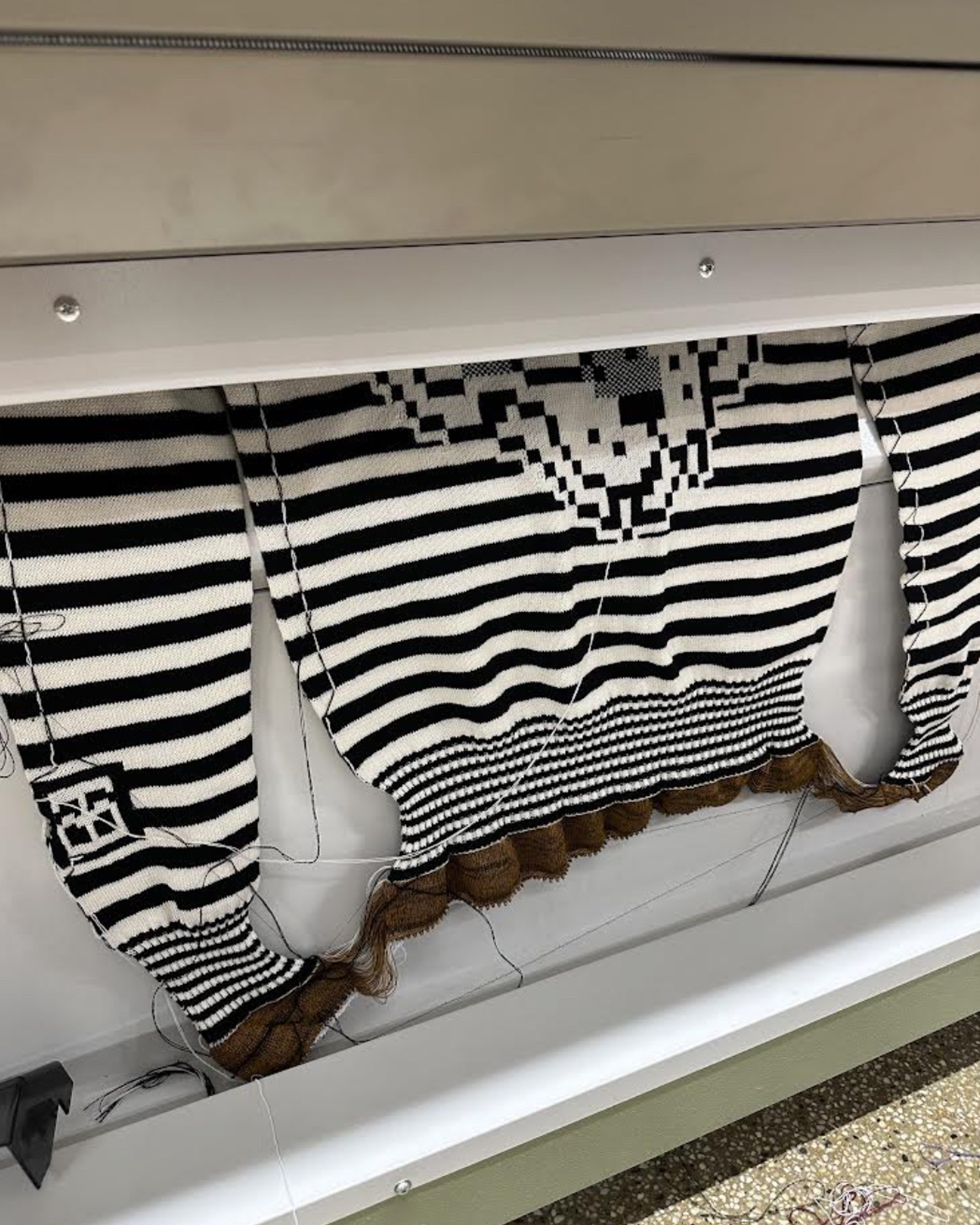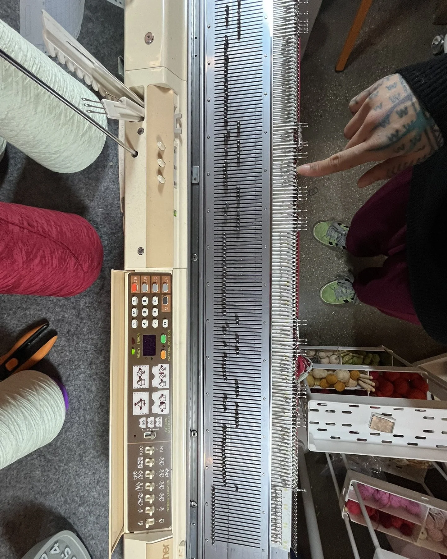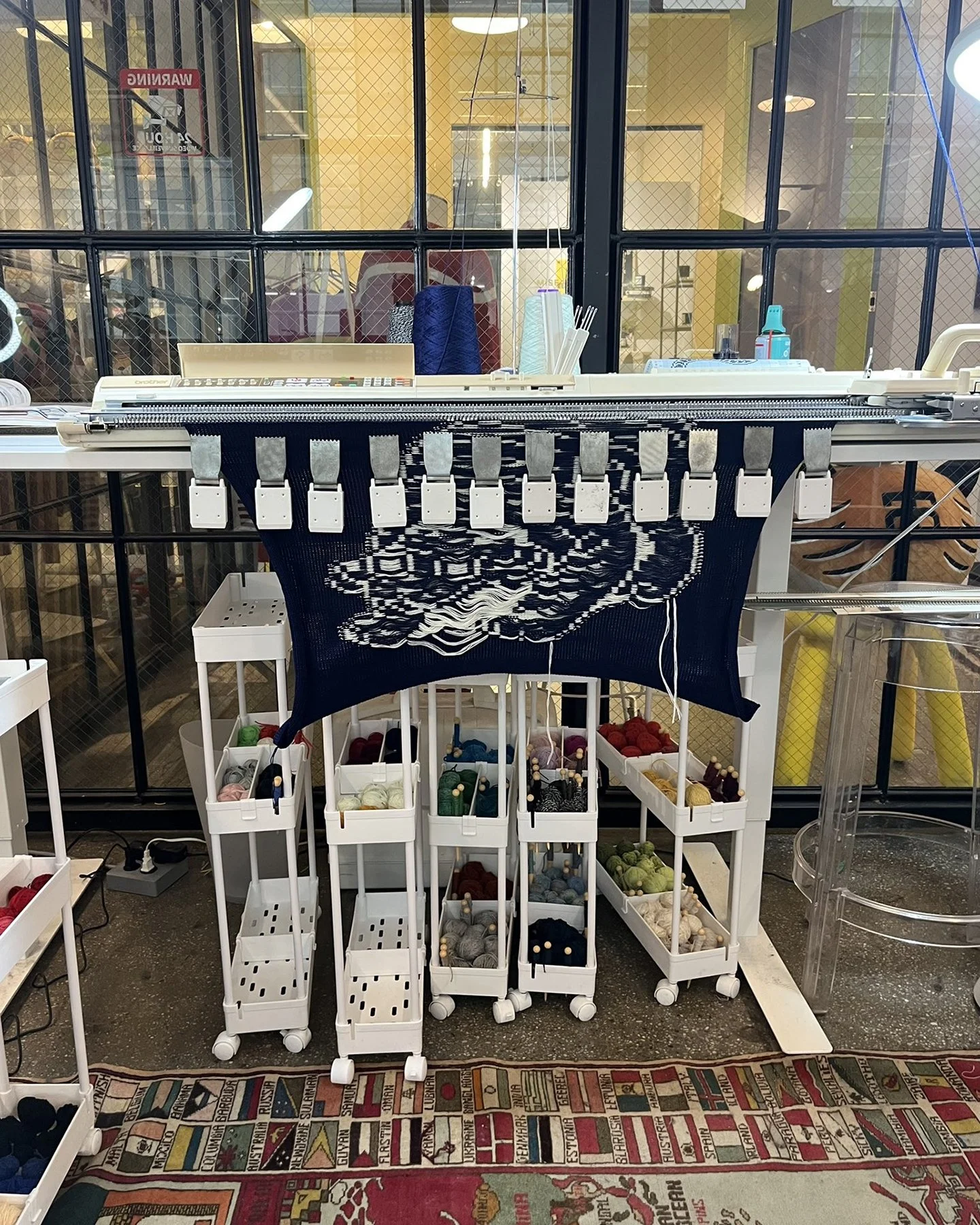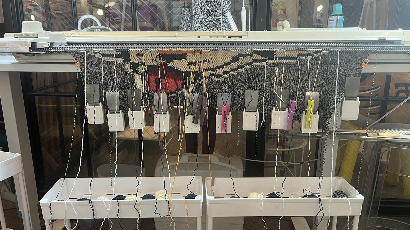 A behind-the-scenes look at work made on my vintage knitting machines, including finishing processes completed off the loom. Learn more about my work produced on the knitting machine here.A portrait of me using the intarsia knitting technique on one of my vintage knitting machines.Left: A top-down view of the bed of the vintage knitting machine, showing computerized inputs controlling the bed of needles. Right: A view of the underside of the knitting carriage, which uses a complex set of levers to manipulate the positions of the needles on the knitting bed according to mechanical settings.Modern knitting machines have similar parts and functions, except the machine is completely computerized and motorized.Left: In-progress view of the front of a garment knit on my vintage knitting machine with a mylar card input. Right: In contrast, in-progress view of a garment knitting on a Shima Seiki WHOLEGARMENT machine at Tailored Industry. Learn more about the made-to-order fashion line here.Above: An example of the knitting machine used for the intarsia knitting technique. In contrast with knitting produced by inputs directly into the machine (punched card, mylar card, or computerized), intarsia knitting is done mostly by hand by placing yarns across the needles. The carriage shown here is specially designed for this technique by knitting in the yarn for you only after yarns have been placed across needles. (This process can be done manually by hand.)Learn more about my intarsia knitting projects here.Left & right: Off-loom techniques. Once knitted, cut yarns on the back of the fabric must be woven in. The more colors are used, the more yarns must be tidied. This work is more evident for intarsia knitting.Finishing techniques. Left: Sewing. In this photo I am sewing the finished, washed fabric onto a frame. When completing a garment or object, the fabric must be sewn together before washing. Right: Once washed, the fabric is blocked, or stretched, with pins to dry. This assists in creating the final, finished shape of the fabric.