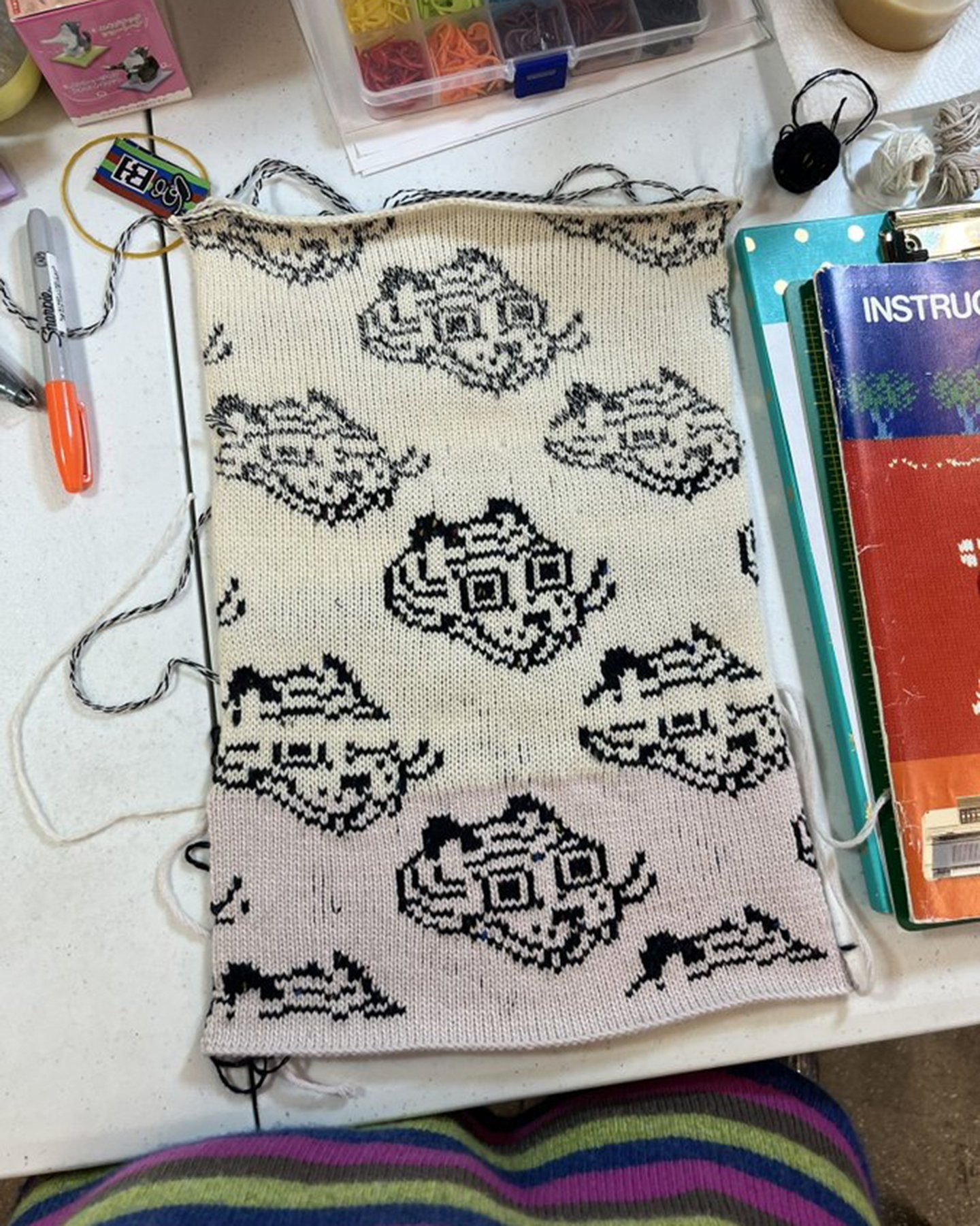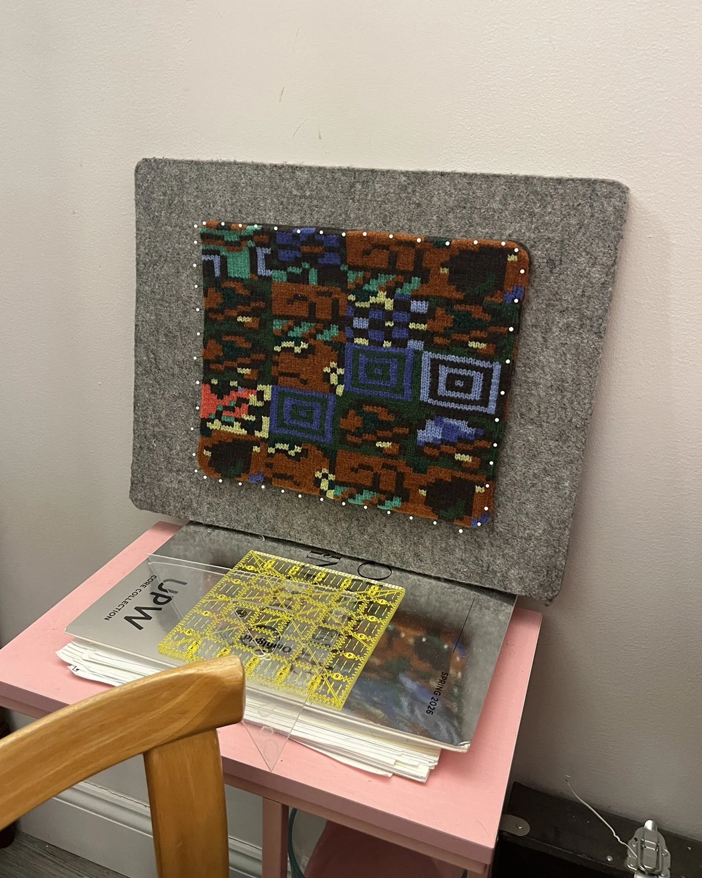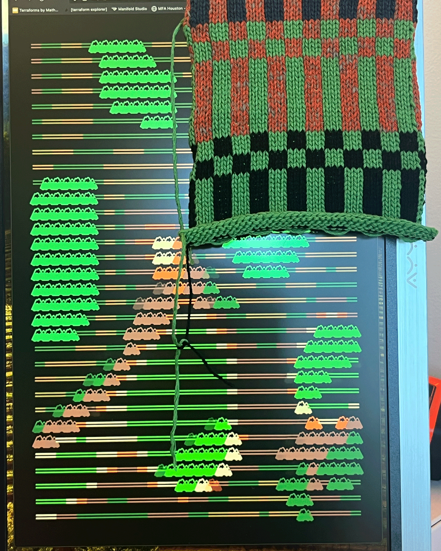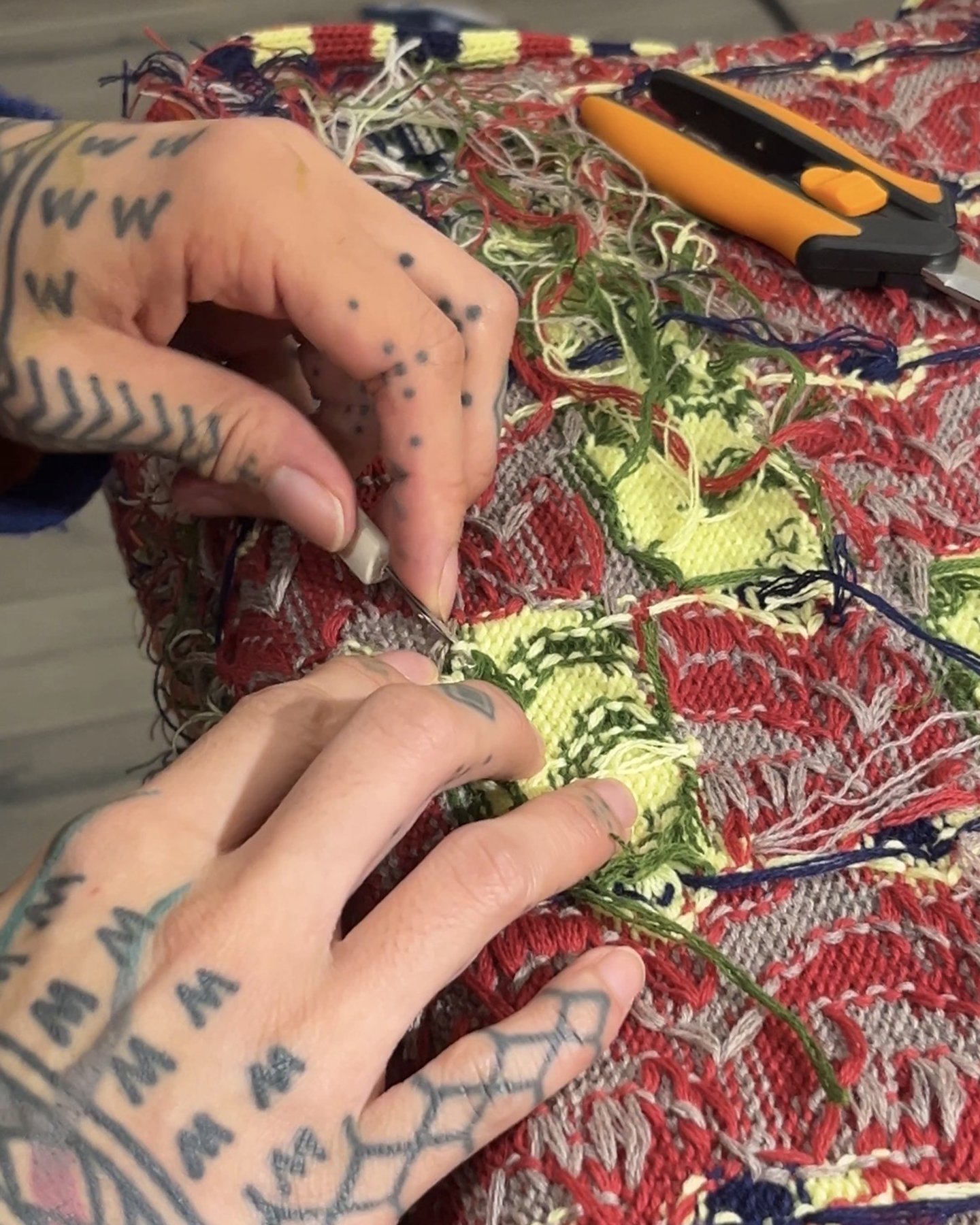 A behind-the-scenes look at work made on my vintage knitting machines, including finishing processes completed off the loom. Learn more about my work produced on the knitting machine here.A portrait of me using the intarsia knitting technique on one of my vintage knitting machines.Left: A top-down view of the bed of the vintage knitting machine, showing computerized inputs controlling the bed of needles. Right: A view of the underside of the knitting carriage, which uses a complex set of levers to manipulate the positions of the needles on the knitting bed according to mechanical settings.Modern knitting machines have similar parts and functions, except the machine is completely computerized and motorized.Left: In-progress view of the front of a garment knit on my vintage knitting machine with a mylar card input. Right: In contrast, in-progress view of a garment knitting on a Shima Seiki WHOLEGARMENT machine at Tailored Industry. Learn more about the made-to-order fashion line here.Above: An example of the knitting machine used for the intarsia knitting technique. In contrast with knitting produced by inputs directly into the machine (punched card, mylar card, or computerized), intarsia knitting is done mostly by hand by placing yarns across the needles. The carriage shown here is specially designed for this technique by knitting in the yarn for you only after yarns have been placed across needles. (This process can be done manually by hand.)Learn more about my intarsia knitting projects here.Left & right: Off-loom techniques. Once knitted, cut yarns on the back of the fabric must be woven in. The more colors are used, the more yarns must be tidied. This work is more evident for intarsia knitting.Finishing techniques. Left: Sewing. In this photo I am sewing the finished, washed fabric onto a frame. When completing a garment or object, the fabric must be sewn together before washing. Right: Once washed, the fabric is blocked, or stretched, with pins to dry. This assists in creating the final, finished shape of the fabric.