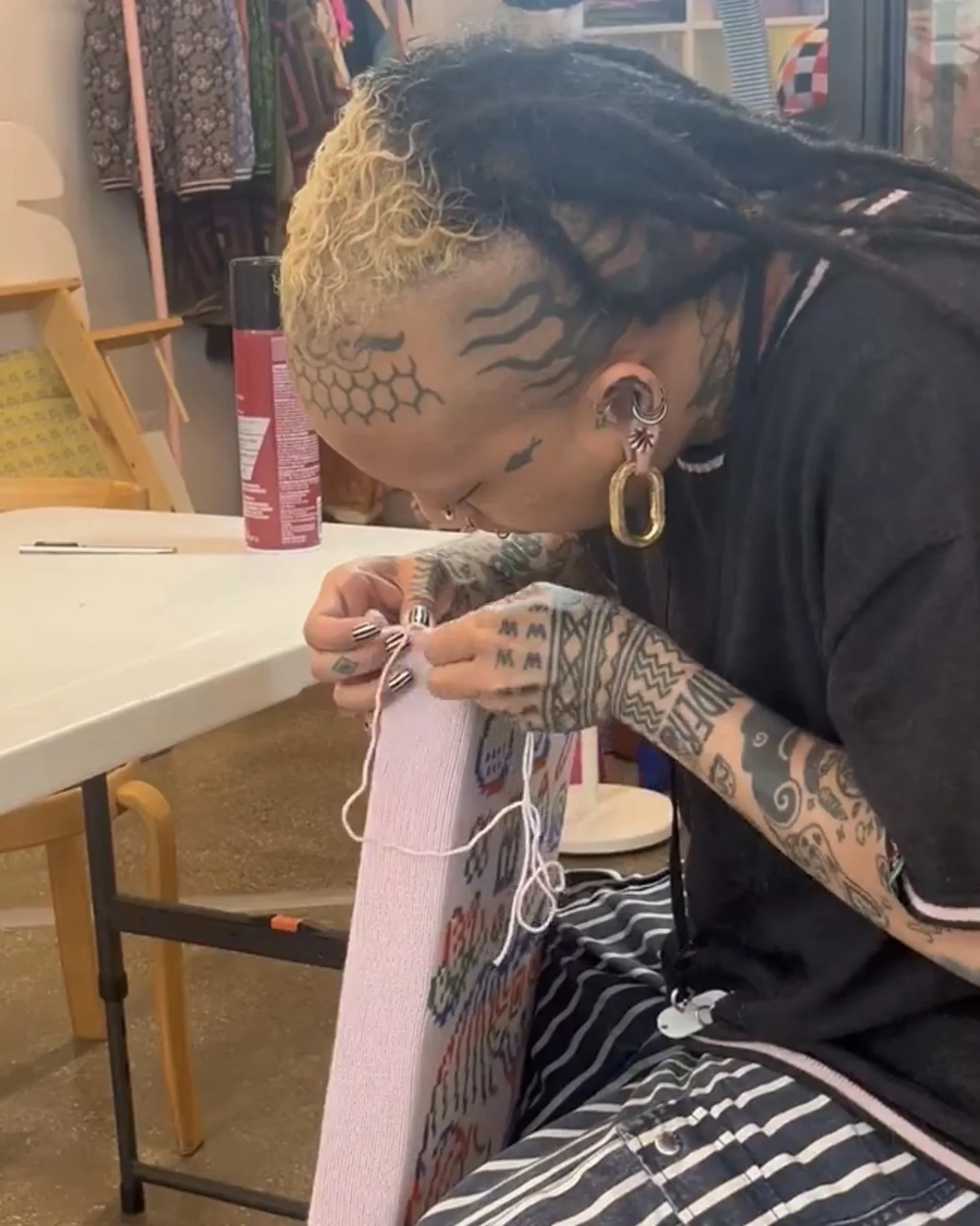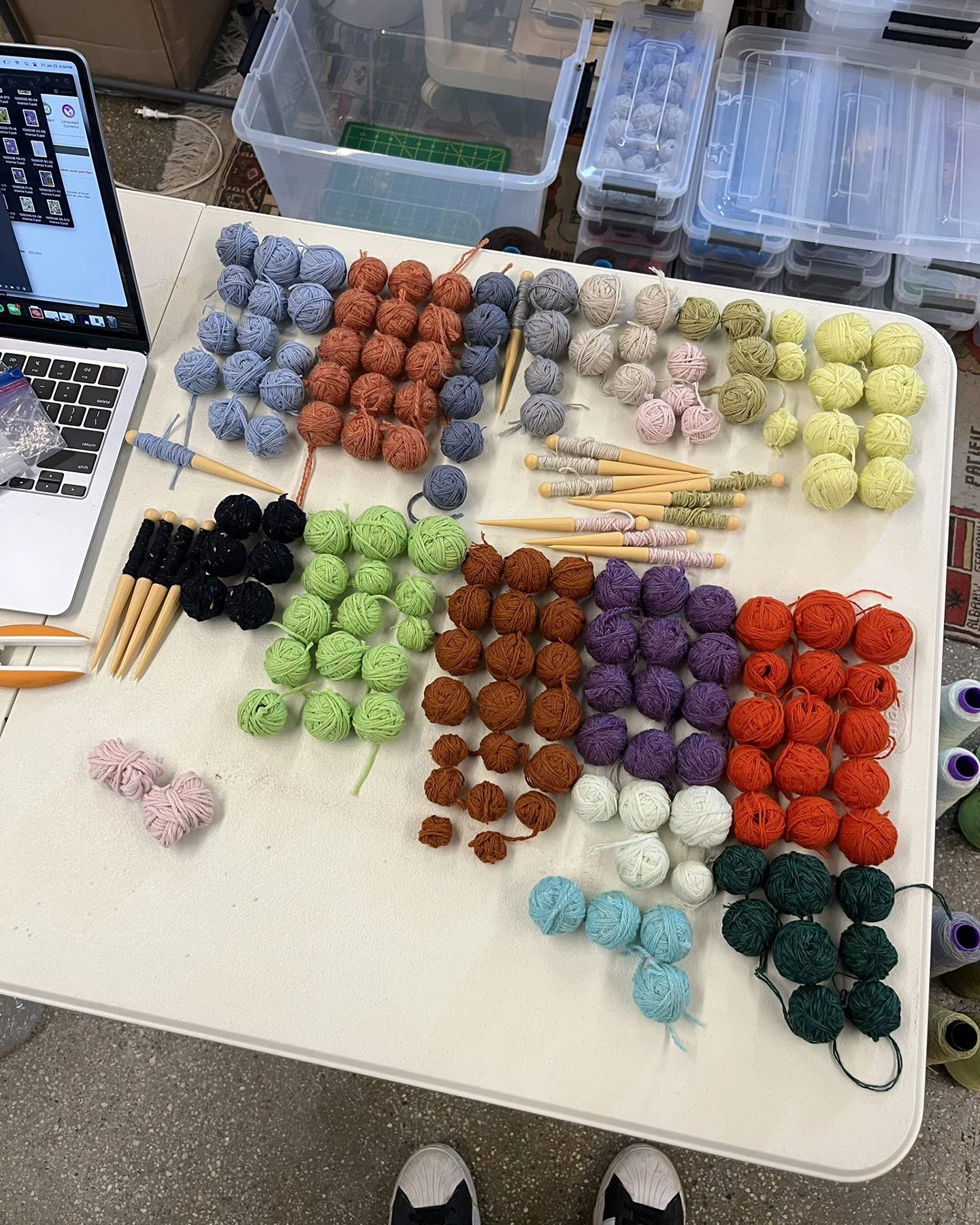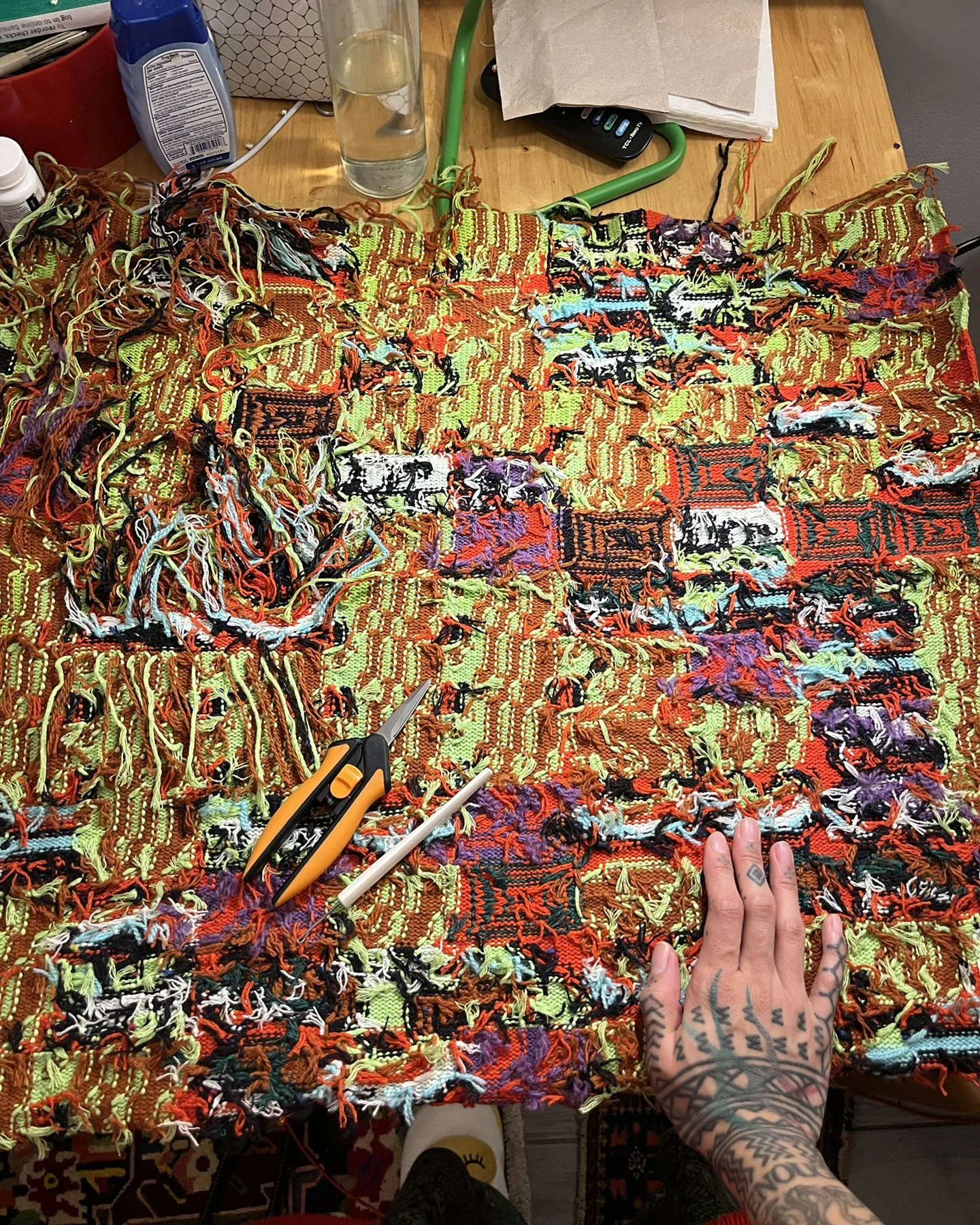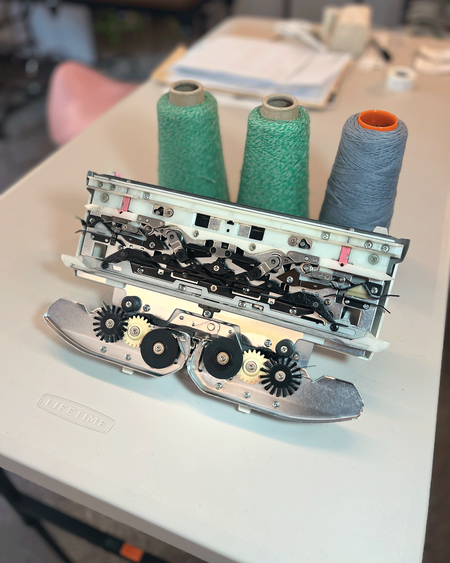 A behind-the-scenes look at work made on my vintage knitting machines, including finishing processes completed off the loom. Learn more about my work produced on the knitting machine here.A portrait of me using the intarsia knitting technique on one of my vintage knitting machines.Left: A top-down view of the bed of the vintage knitting machine, showing computerized inputs controlling the bed of needles. Right: A view of the underside of the knitting carriage, which uses a complex set of levers to manipulate the positions of the needles on the knitting bed according to mechanical settings.Modern knitting machines have similar parts and functions, except the machine is completely computerized and motorized.Left: In-progress view of the front of a garment knit on my vintage knitting machine with a mylar card input. Right: In contrast, in-progress view of a garment knitting on a Shima Seiki WHOLEGARMENT machine at Tailored Industry. Learn more about the made-to-order fashion line here.Above: An example of the knitting machine used for the intarsia knitting technique. In contrast with knitting produced by inputs directly into the machine (punched card, mylar card, or computerized), intarsia knitting is done mostly by hand by placing yarns across the needles. The carriage shown here is specially designed for this technique by knitting in the yarn for you only after yarns have been placed across needles. (This process can be done manually by hand.)Learn more about my intarsia knitting projects here.Left & right: Off-loom techniques. Once knitted, cut yarns on the back of the fabric must be woven in. The more colors are used, the more yarns must be tidied. This work is more evident for intarsia knitting.Finishing techniques. Left: Sewing. In this photo I am sewing the finished, washed fabric onto a frame. When completing a garment or object, the fabric must be sewn together before washing. Right: Once washed, the fabric is blocked, or stretched, with pins to dry. This assists in creating the final, finished shape of the fabric.