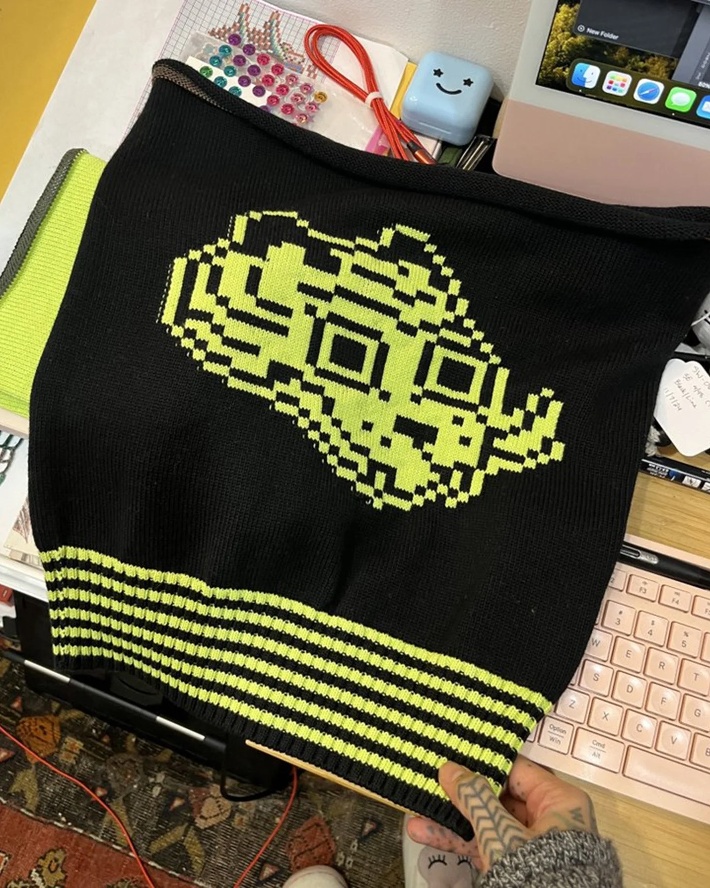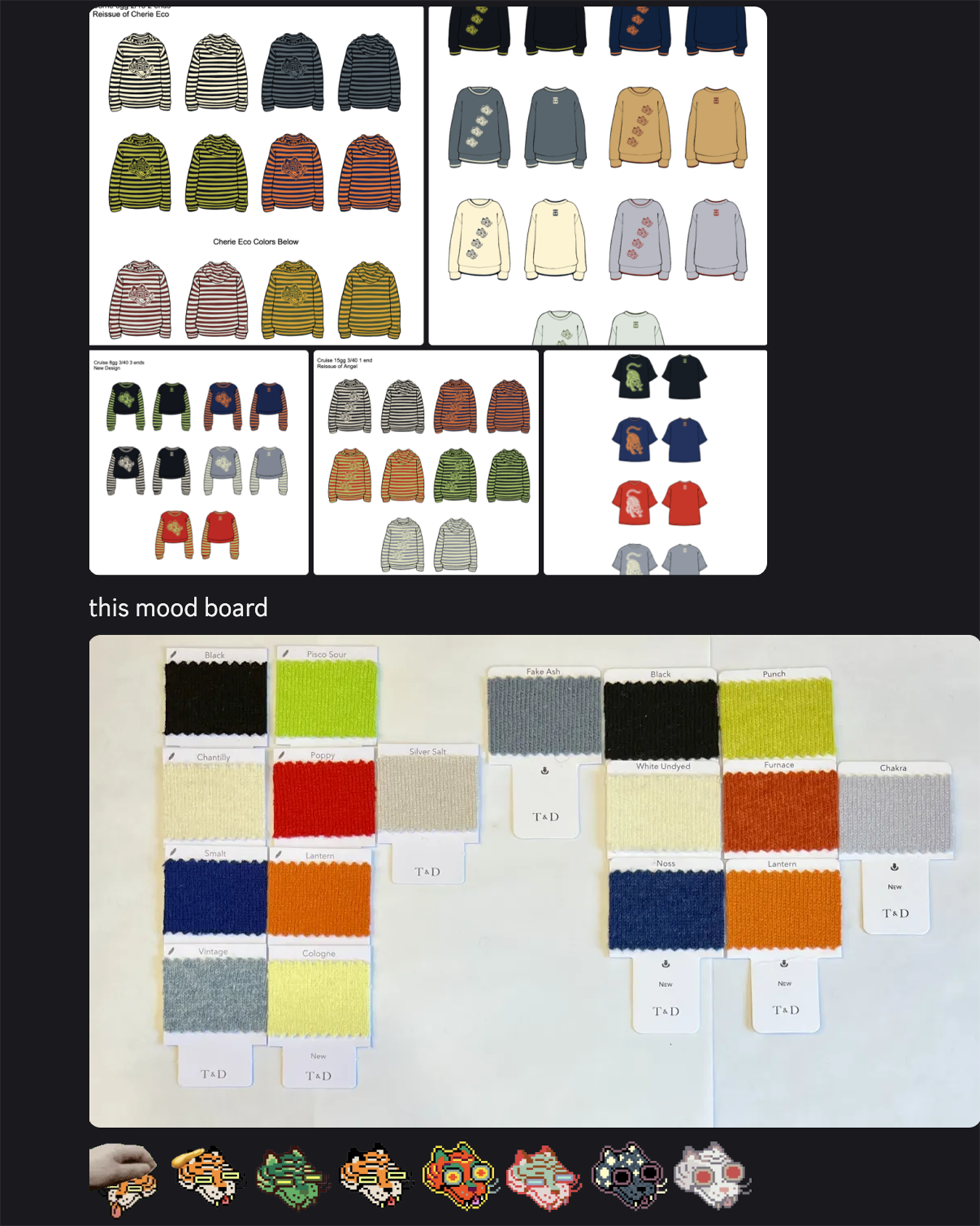 Design processes for knitted textiles, apparel, and accessories on my knitting machine or for Shima Seiki made-to-order production.Above: Sketches for fashion illustrations made in 2023. Sketches are digitized and included in tech packs with instructions similar to what is shown here.Above & below: A collection of digital fashion illustrations for the 2023 made-to-order apparel collection.Left: Swatching a six-color textile sketch created in p5js (JavaScript). Right: New fashion illustrations (2024-2025), a collection of yarn swatches, and pixel Tigerbob illustrations (2022) side-by-side during exploration for the 2025 made-to-order apparel collection.Left: A machine-knitted swatch by me based on colors sampled from a digital art piece called Terraforms by Mathcastles. Right: A machine-knitted swatch by me testing a repeating design input via mylar card.I knit samples of apparel and fabric myself before sampling a design for the made-to-order line.Above: Two swatches showing development of knit fabric. Left: Stranded-yarn repeating motif machine-knit by me. Right: Stranded-yarn repeating motif designed by me and produced by Tailored Industry for the made-to-order line.Left & right: Two swatches designed by me and produced by Tailored Industry during development.DESIGN: PIXEL ILLUSTRATIONS