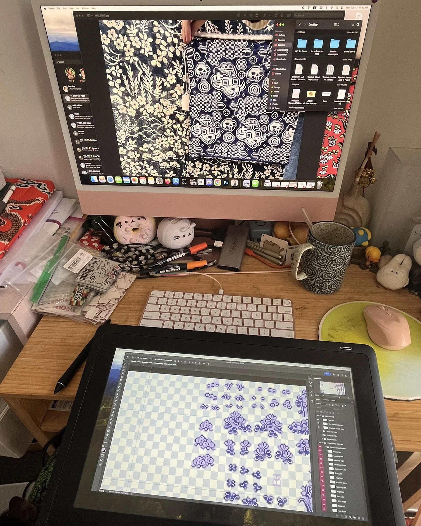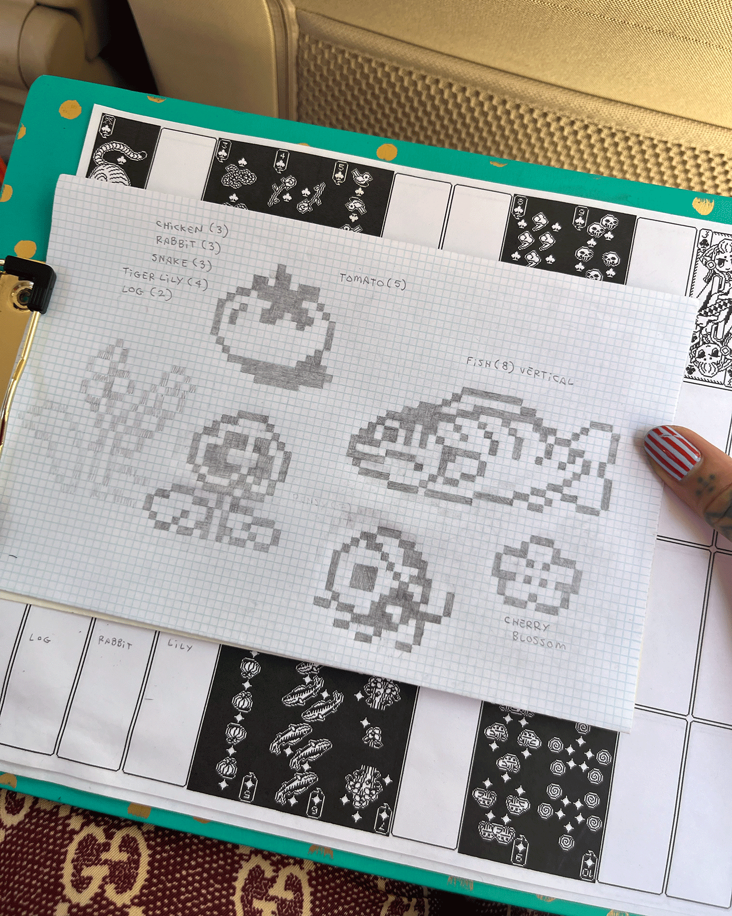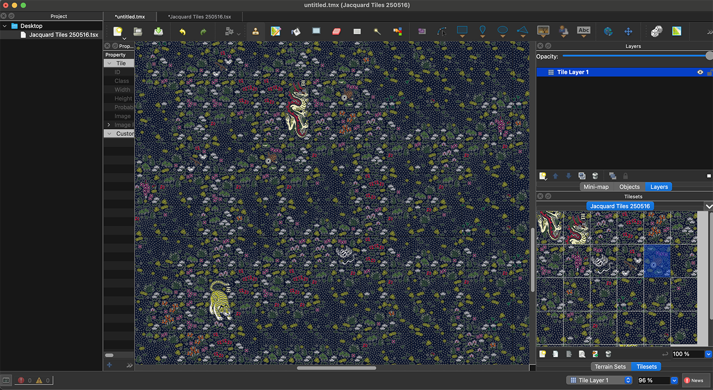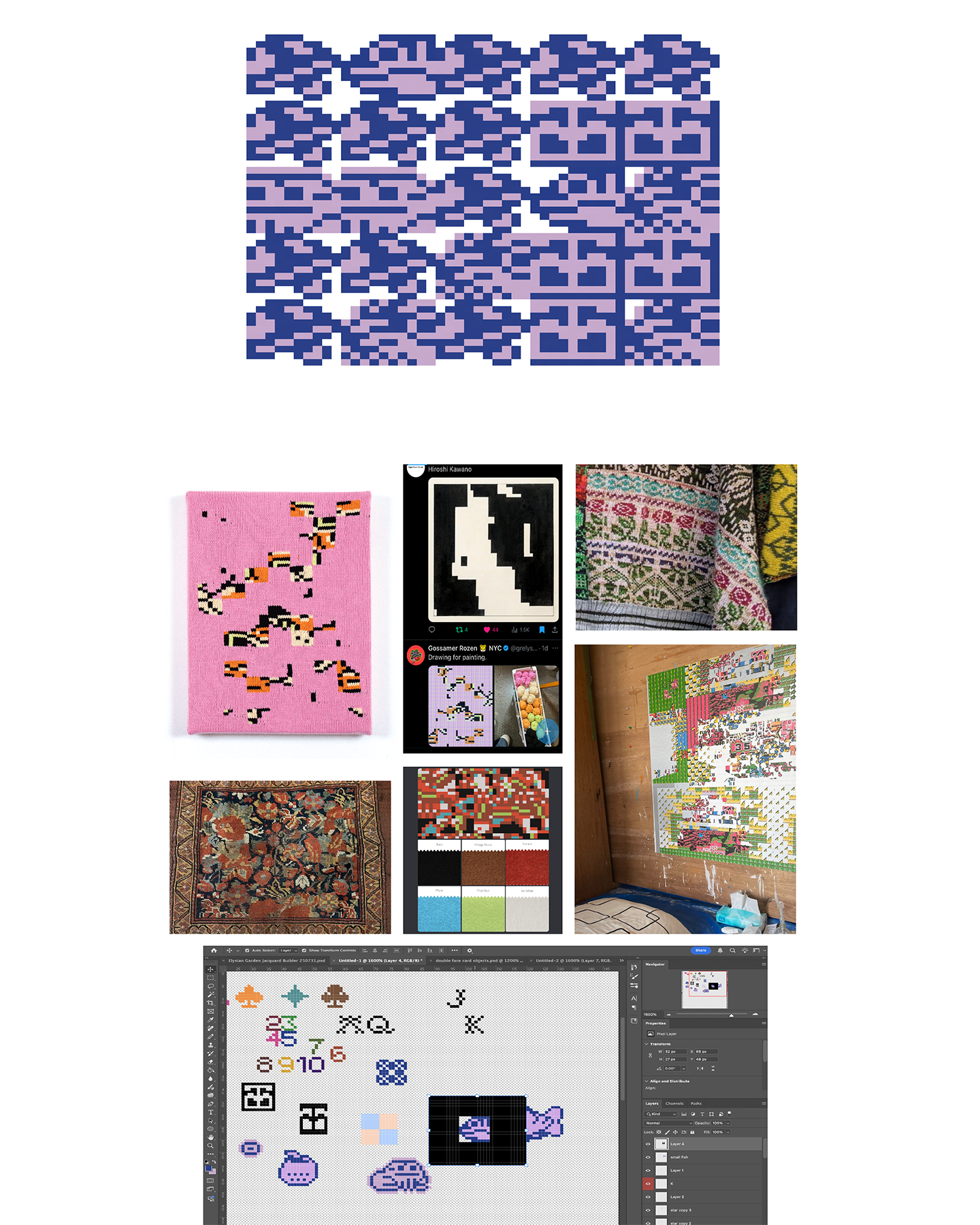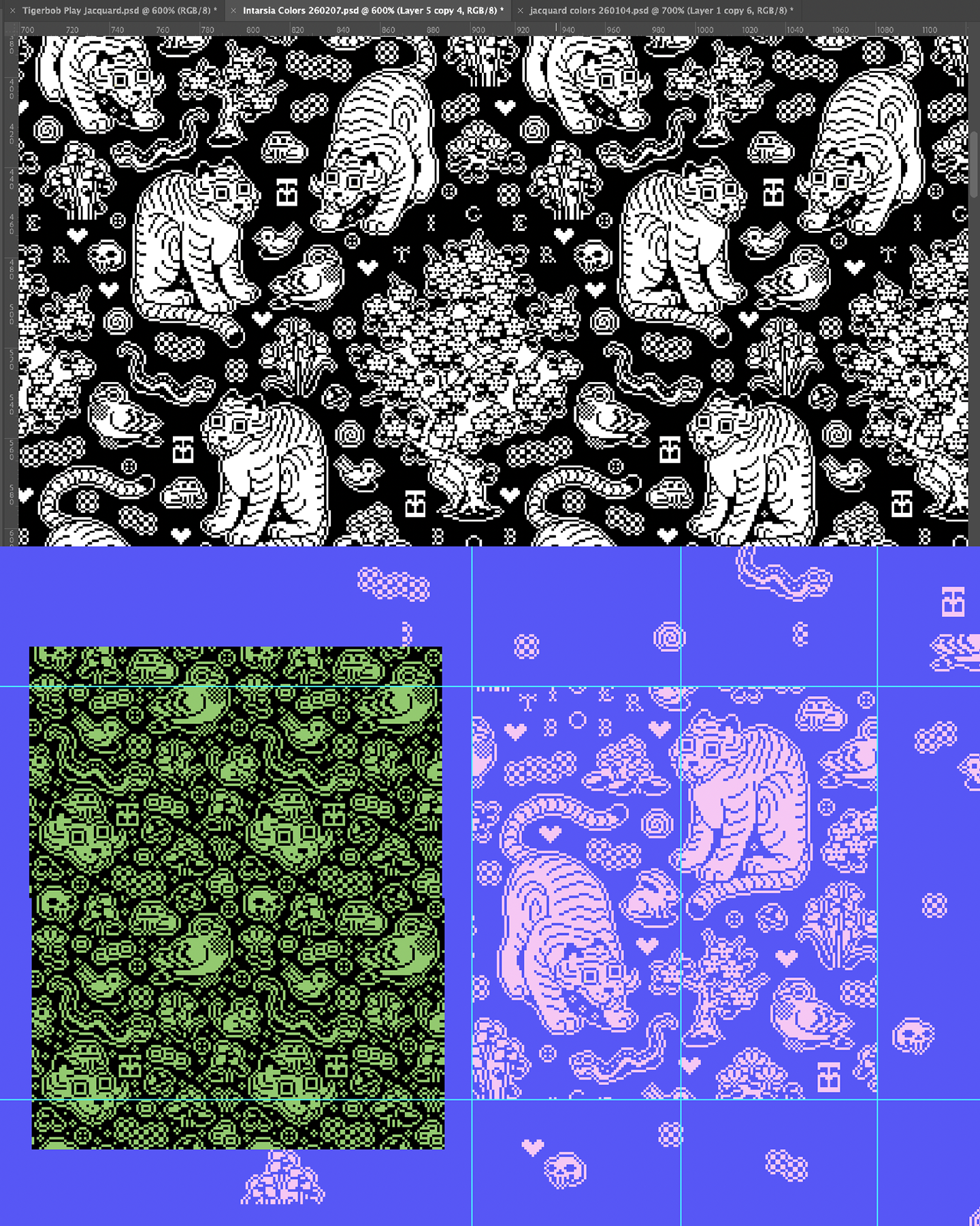 Pixel art drawings are useful interpretations of my visual language before they are translated into gridded formats for machine knitting, knit garment programming (Shima Seiki), and digital art (JavaScript). I also use this process to develop seamless, repeating tiles for digital and physical outputs.Learn more about the grid inputs derived from my pixel art here.Analog and digital pixel art design. Left: Hand-drawn sketches on graph paper for Tigerbob Playing Cards. Right: Digital sketching in Adobe Photoshop, referencing knit swatches and vintage textiles.Above: Digital drawing process for Undulation and Tigerbob Mystery Garden. Designed in Adobe Photoshop, I created a system of character and foliage “stamps” that encompass all the pre-drawn art. The PSD file includes a complex system for organizing the tiles needed for the work.Above: A sketch made from a selection of pixel tiles organized with rules in the Tiled game development software, to aid in writing rules for tile generation and for designing additional tiles. Left: Mood board and sketch for Tigerbob Charm Packs. Right: Design process for a repeating jacquard tile for a knitted swatch.PROCESS: MACHINE KNITTING
