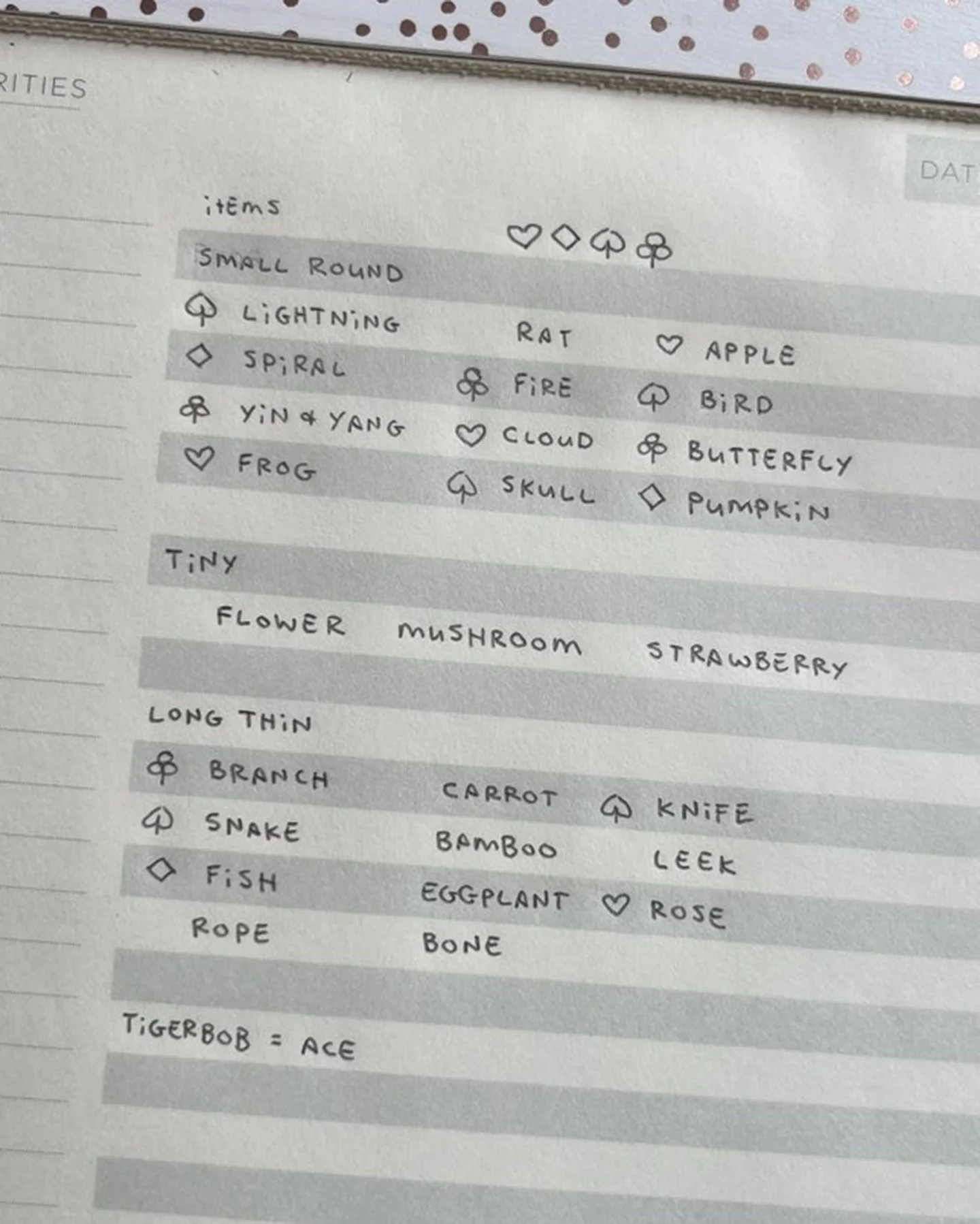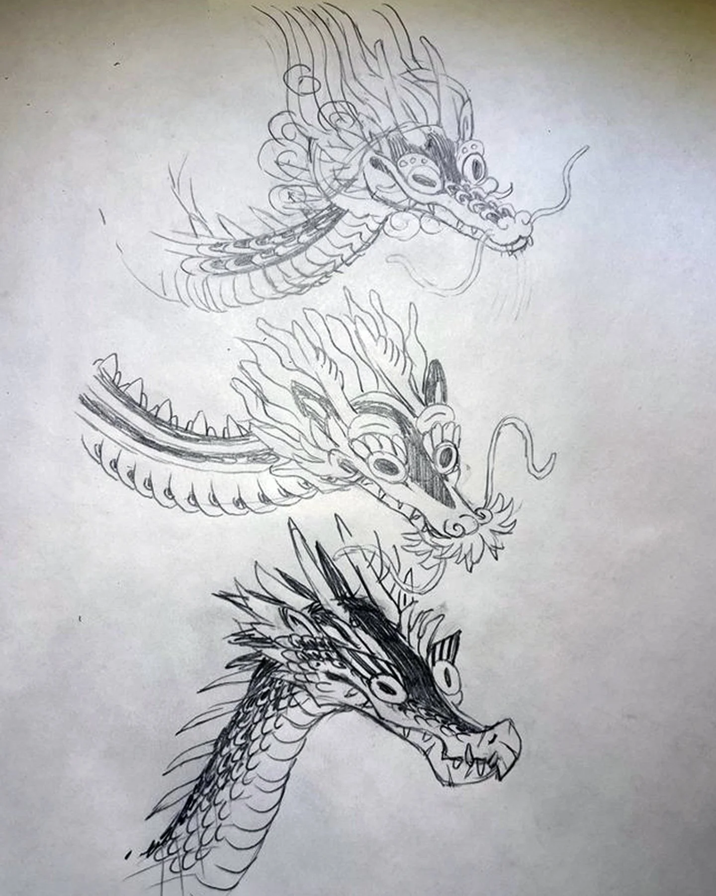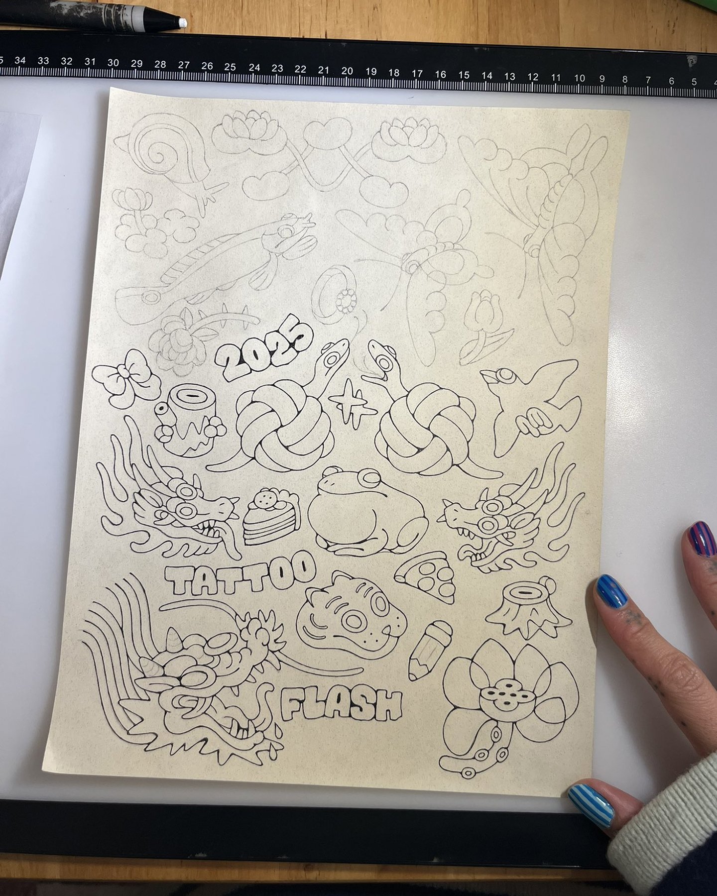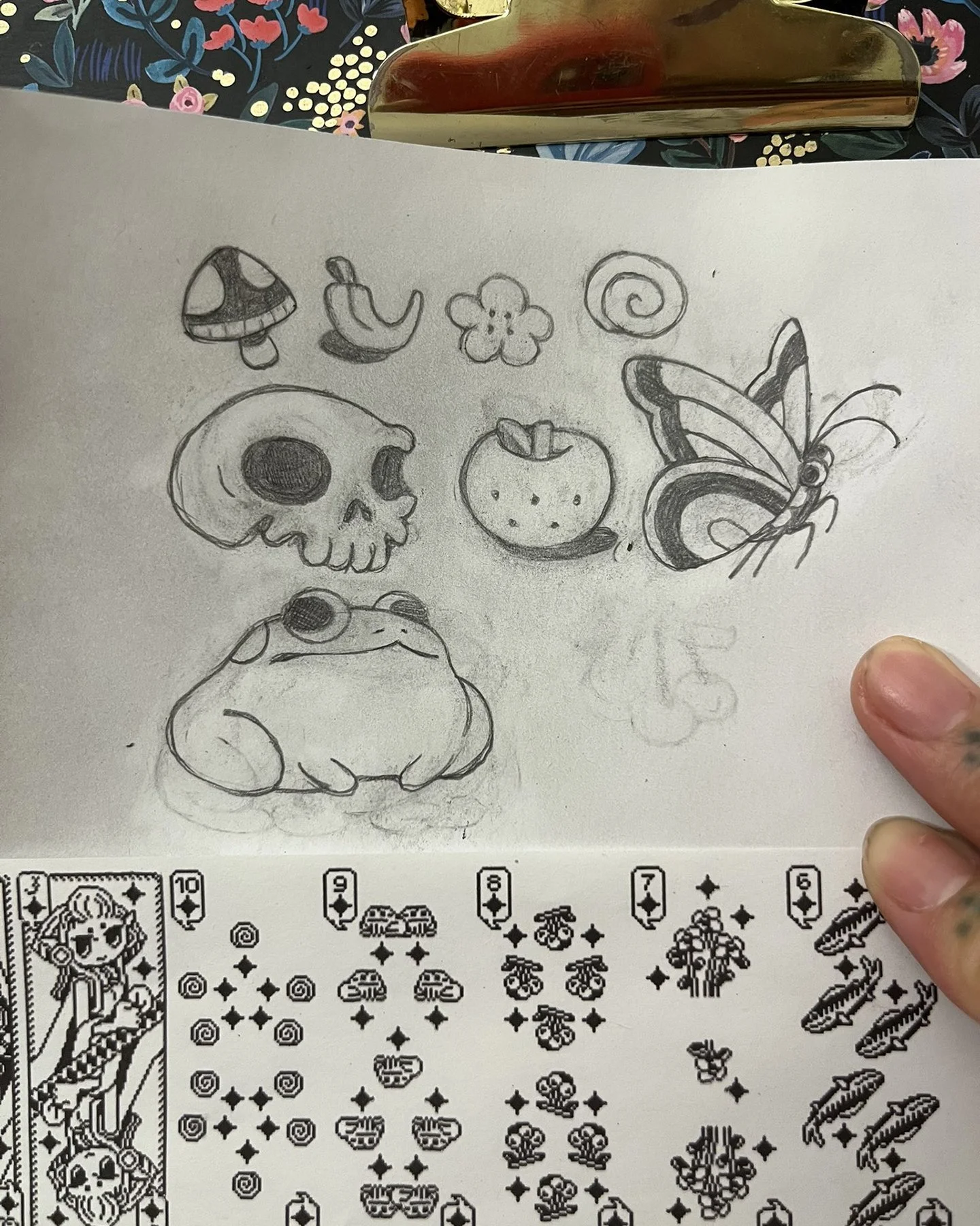 Drawing remains the base of my design processes. Everything begins with a hand-drawn sketch. The oldest technique I know, included are some in-progress shots of illustration and tattoo design work. See DESIGN: COLOR & MOOD below for information on how I choose colors for my illustrations.Drawing and writing are hand-in-hand in all stages of production. Left: Handwritten list of drawing prompts organizing objects to design and draw for Tigerbob Playing Cards. Right: Sketches of dragon heads.Left: Early composition sketch for an illustration in Tigerbob Bestiary. Right: Hand-drawn illustrations based on pixel art from Tigerbob Playing Cards. I often move in and out of mediums and art styles to further refine the visual language across products over time.DRAWING TO COMPLETION