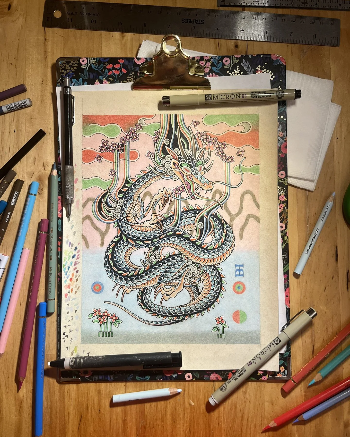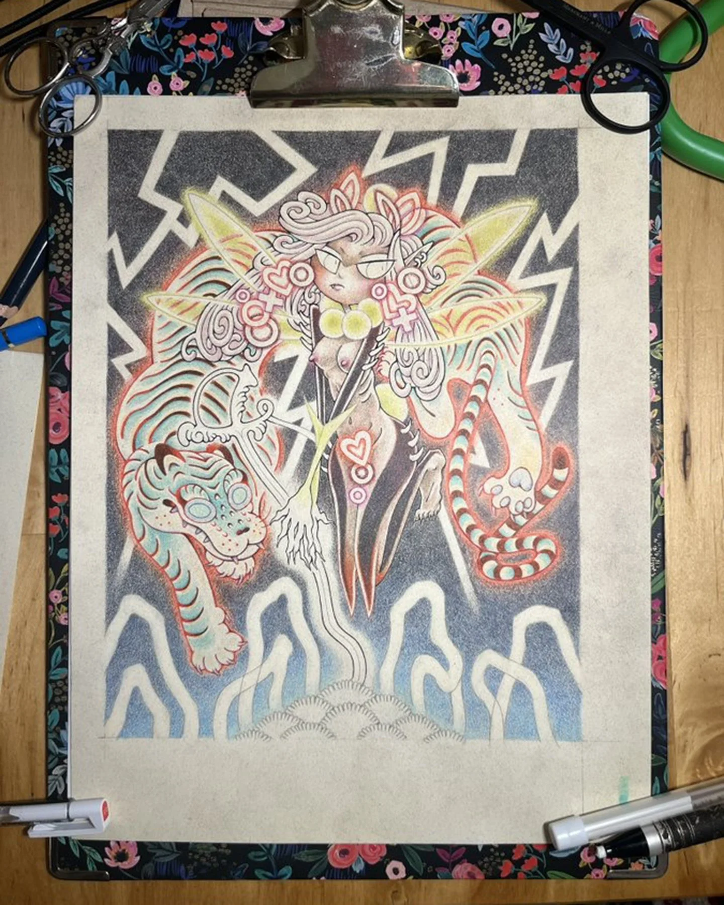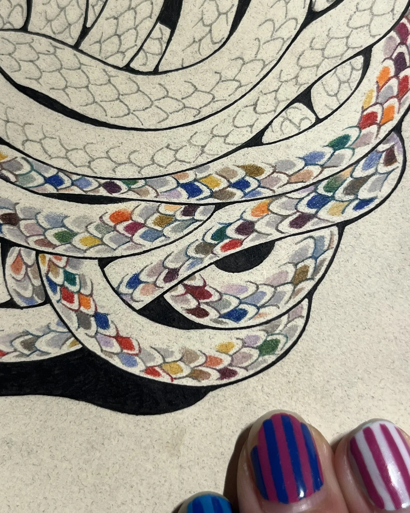 If my goal is to sketch for another product, I take my drawing into the design phase for that medium. For finished illustrations, sketches move into the inking and coloring phases, below.Above: Inking process. Once I have finalized the sketch, I trace the sketch onto the finishing paper with a light box. I use ink pens to outline the drawing.My favorite drawing techniques are analog. I use digital drawing tools, like Adobe Photoshop and a Wacom tablet or Procreate on my iPad with an Apple Pencil to assist with sketching or the tattoo process. I have made many finished works with digital drawing tools, but I prefer to use traditional media.Above: Coloring process with colored pencils. I’ve been using colored pencils almost as long as I have been drawing, perfecting my technique since I was in my early teens. This process involves careful layering of the wax crayons in very small, even strokes. This process has carried over to my handpoke tattoo technique (one dot of ink at a time) and textile techniques (one knit row at a time, one stitch at a time) etc. Processes I find affinity with tend to have something in common with this mindful, one-at-a-time, intentional mark-making.Above: Close-up of minute details produced with colored pencils on an illustration.Above: View of a completed illustration. If the illustration does not go all the way to the edge of the paper, I cut it out at this stage. I sometimes use the edge of the paper to test colors and pressure for layering.DESIGN: COLOR & MOOD