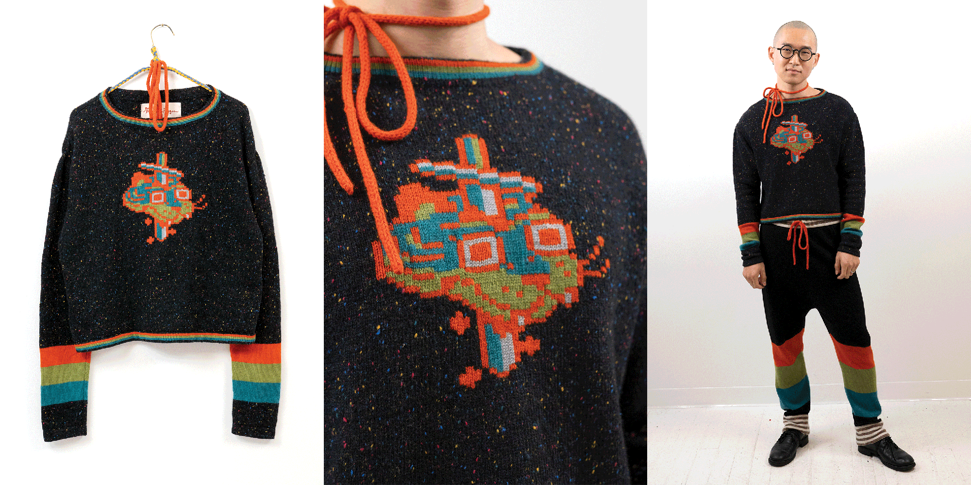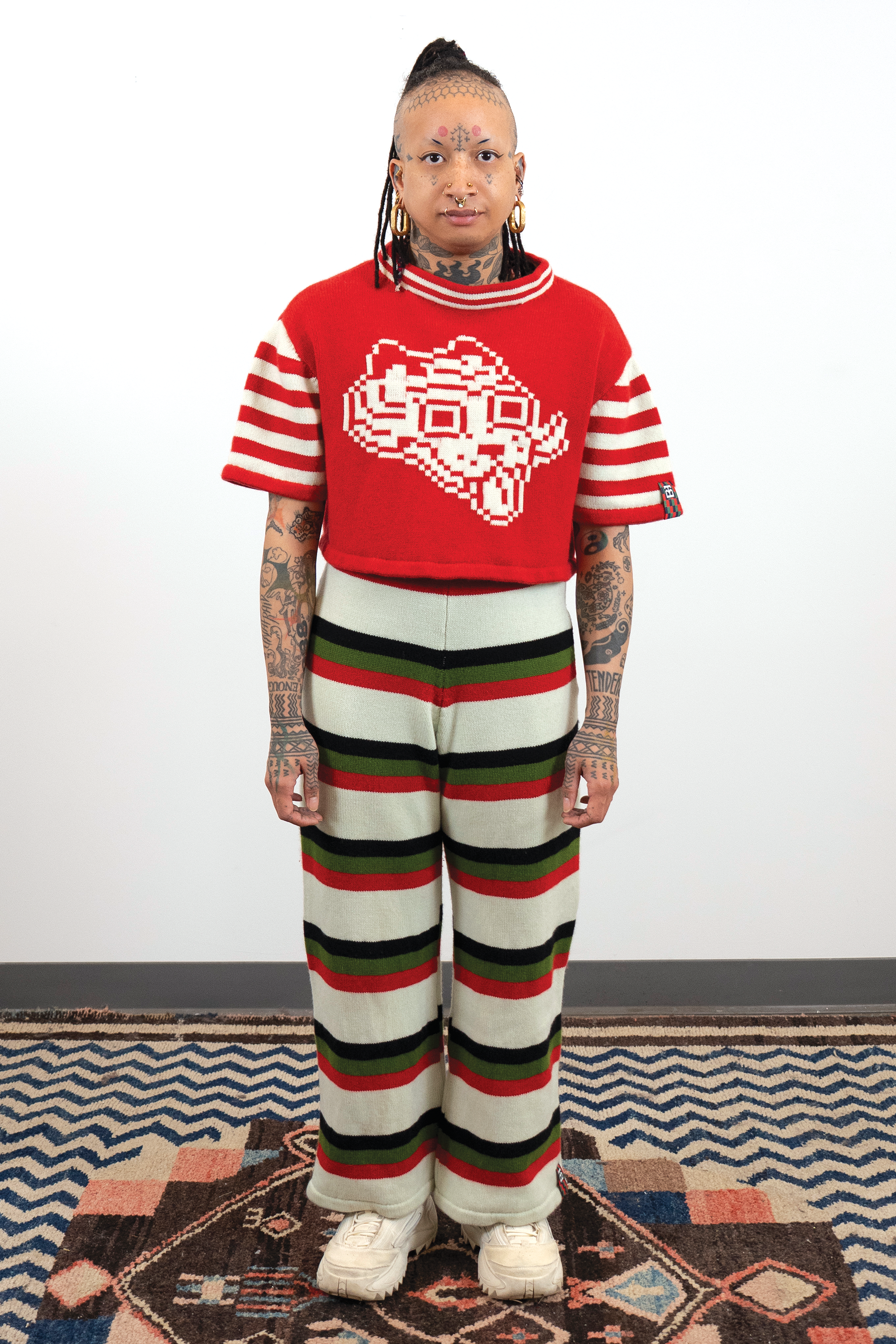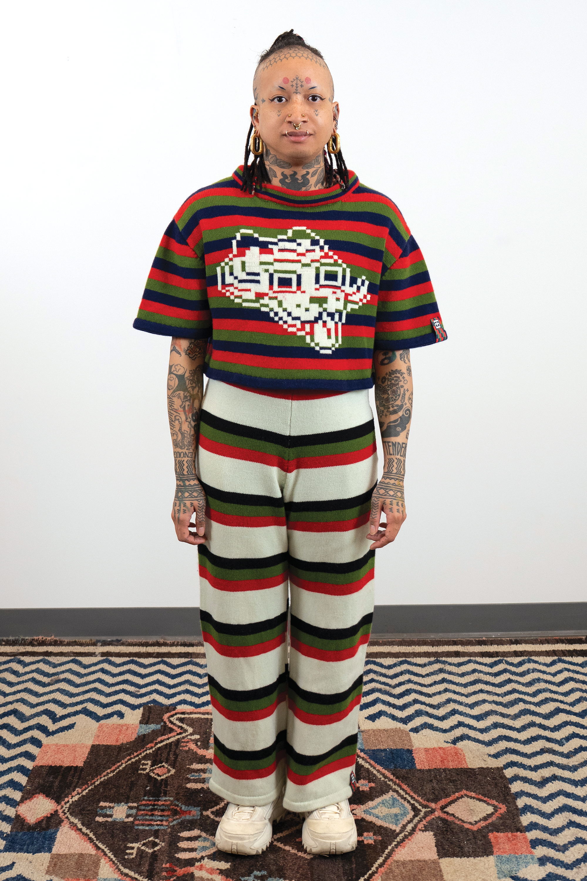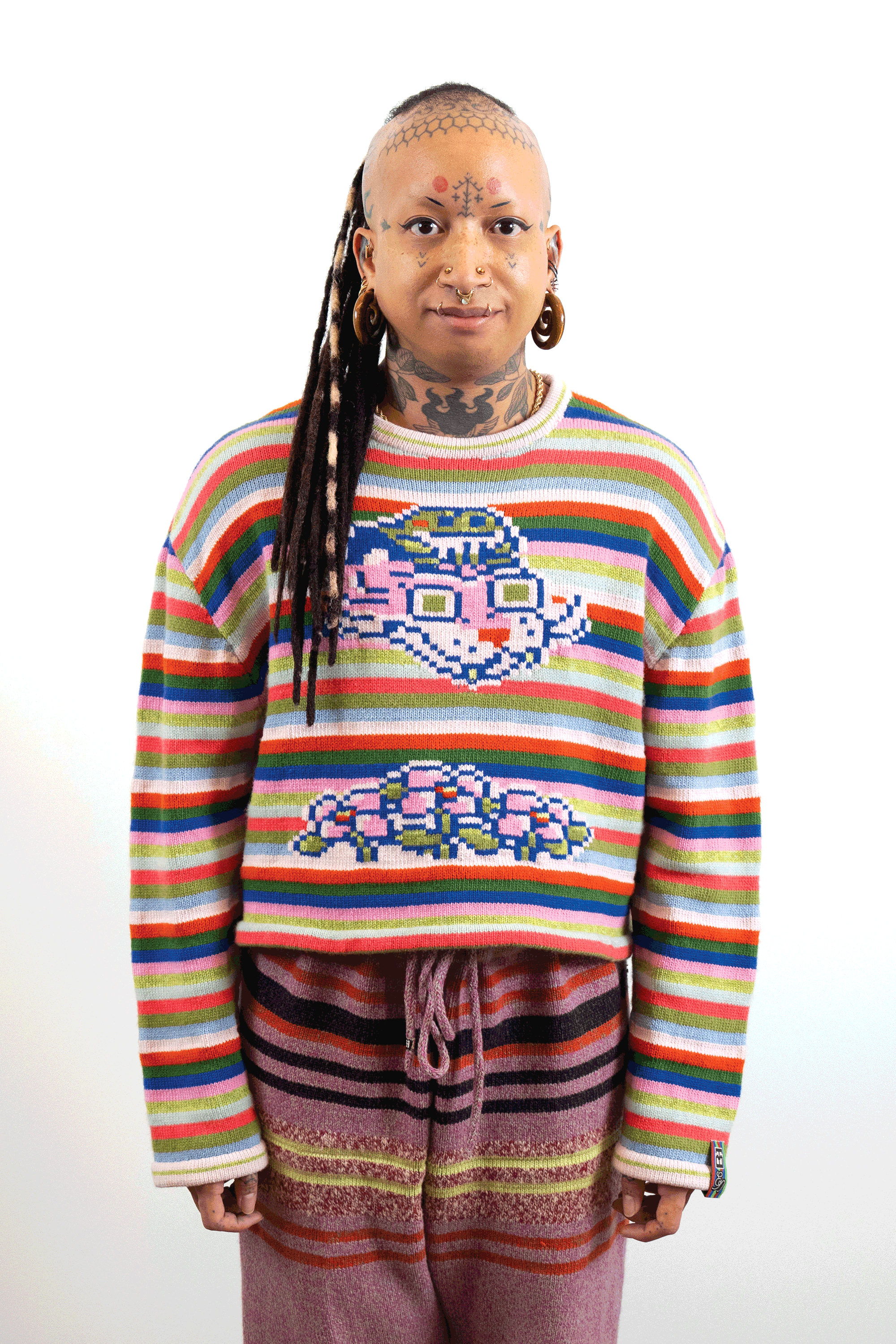 Check out this blog post for more context & background about the work.INTARSIACORE - My current body of work with the intarsia color work technique.GRID INPUTS - A detailed description of the invisible charts necessary to construct the artwork.FASHION - Information about the made-to-order fashion line produced by Tailored Industry.VISUAL LANGUAGE - A mostly complete description and history about the style of the artwork.DESIGN & PROCESS: Review the PROCESS: MACHINE KNITTING section of this page for a behind-the-scenes look.2025