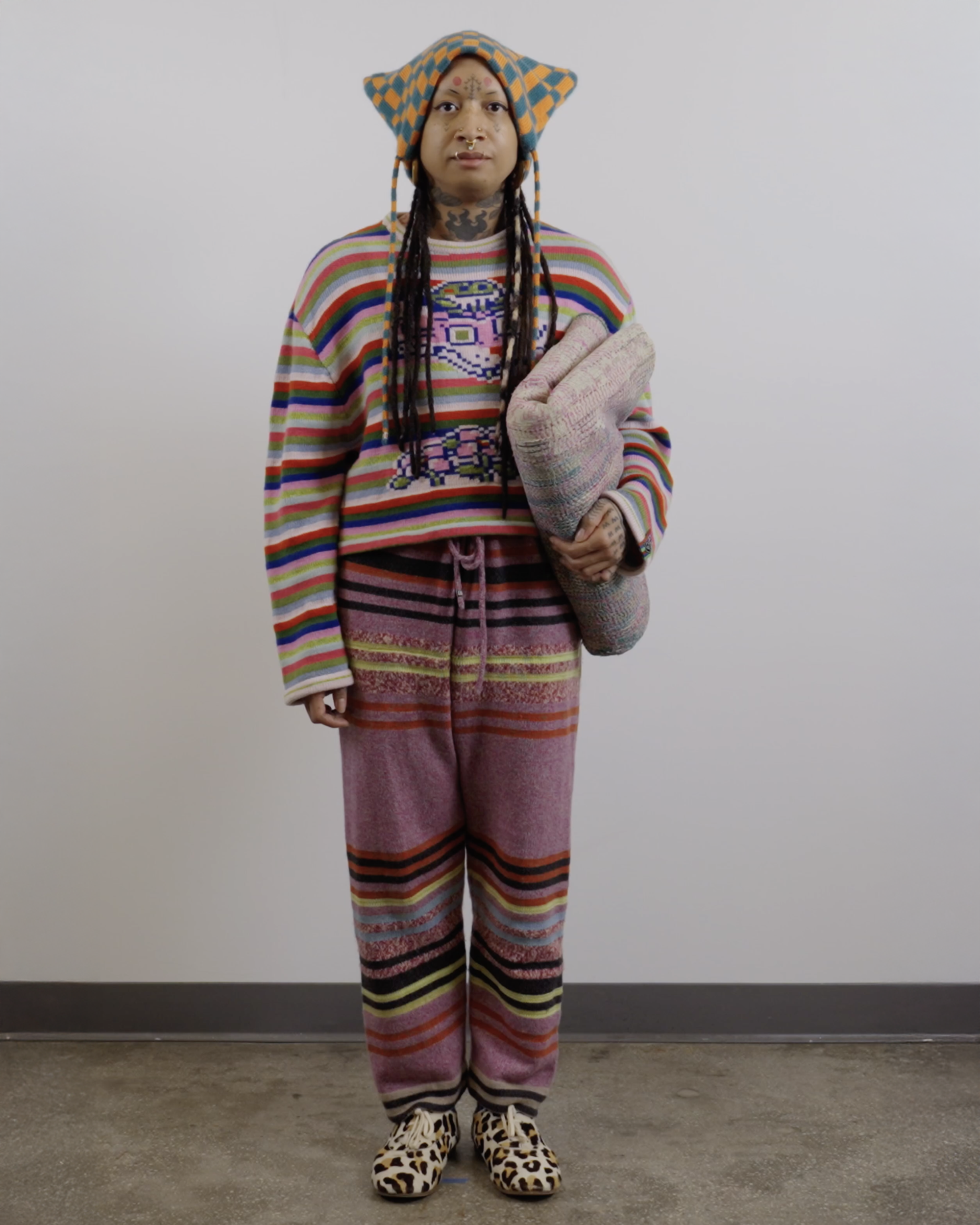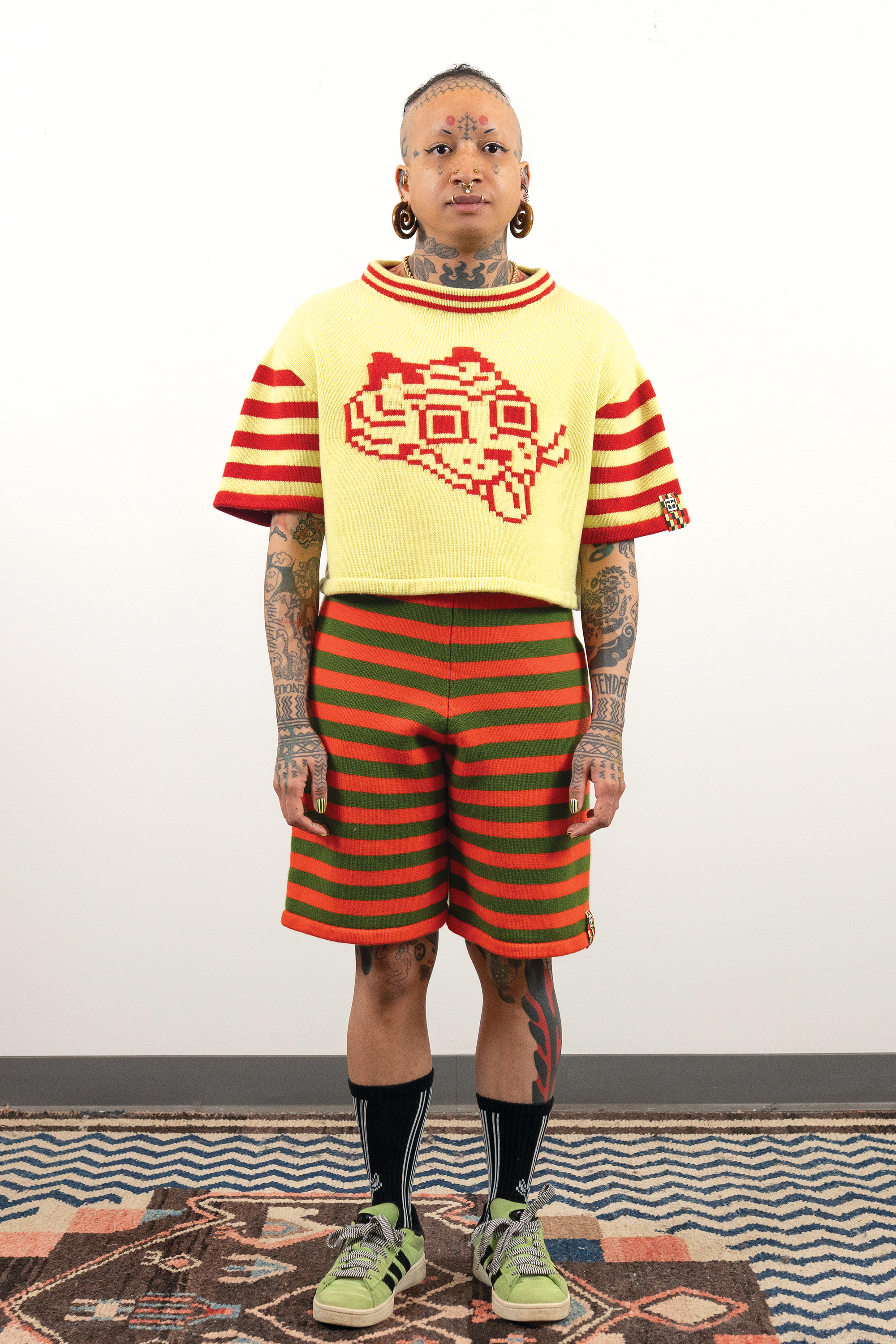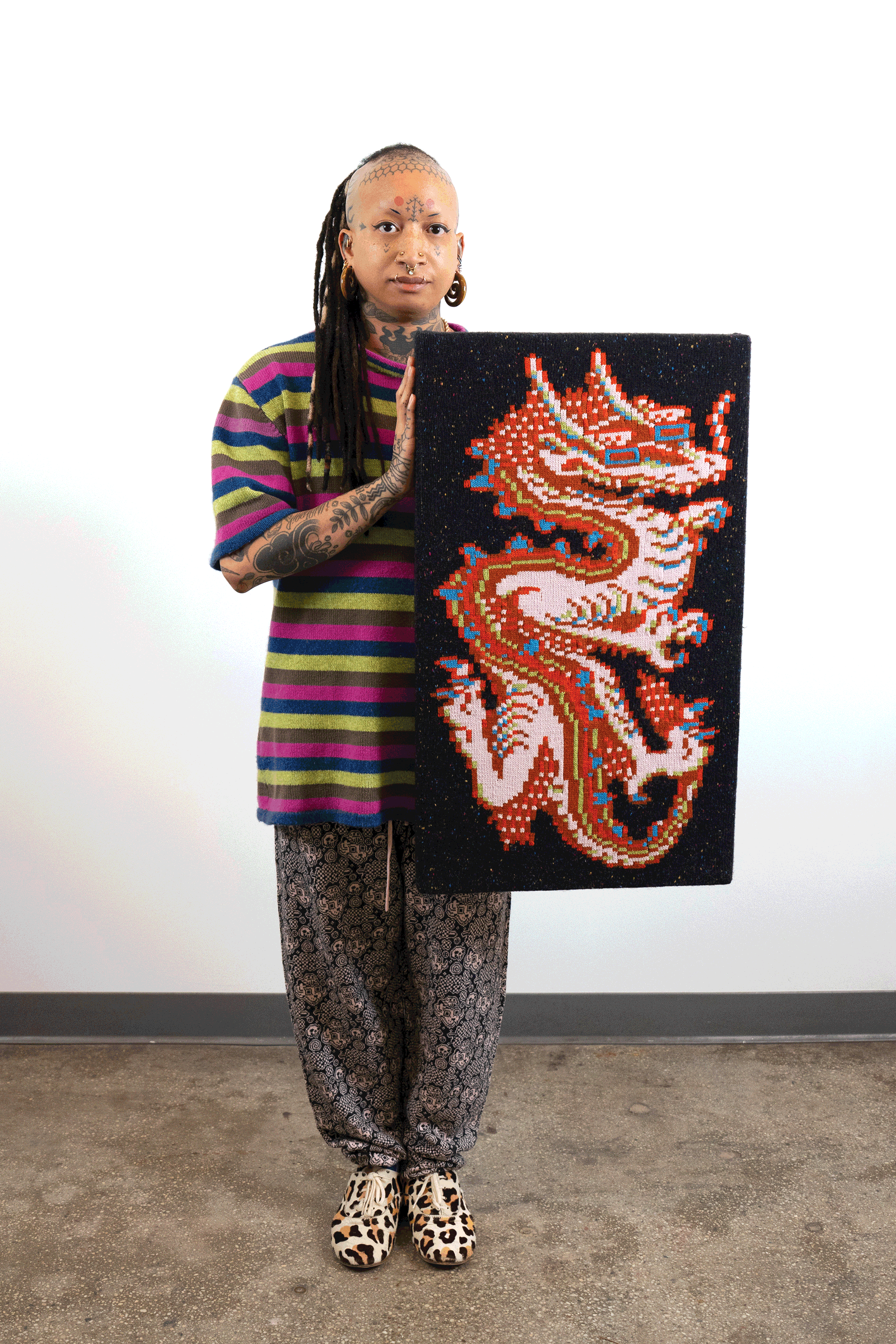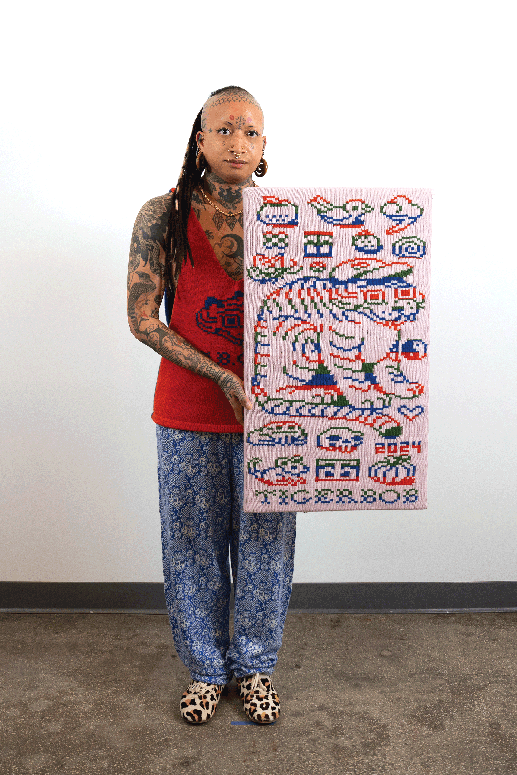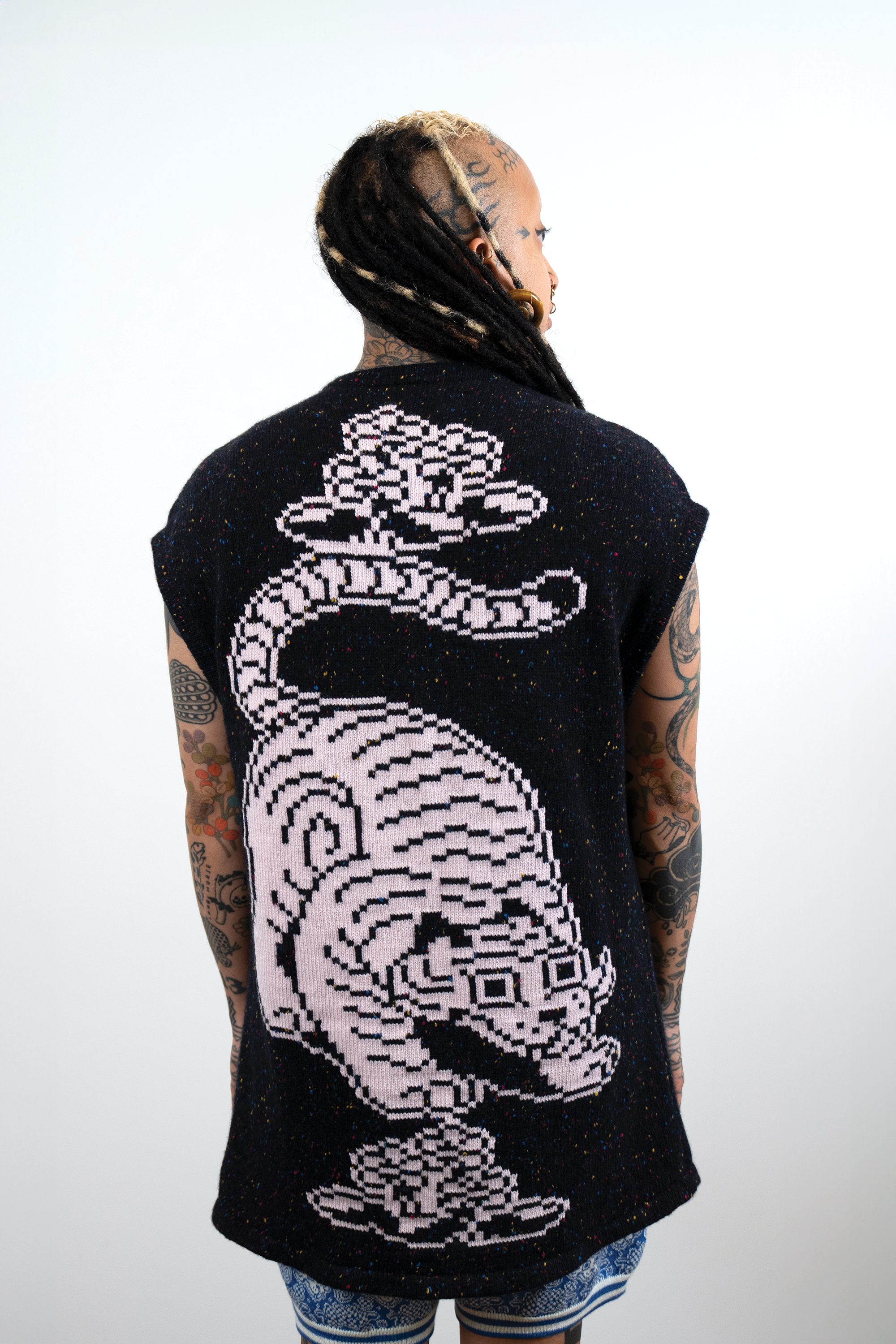 Check out this blog post for more context & background about the work.INTARSIACORE - My current body of work with the intarsia color work technique.GRID INPUTS - A detailed description of the invisible charts necessary to construct the artwork.FASHION - Information about the made-to-order fashion line produced by Tailored Industry.VISUAL LANGUAGE - A mostly complete description and history about the style of the artwork.DESIGN & PROCESS: Review the PROCESS: MACHINE KNITTING section of this page for a behind-the-scenes look.2025