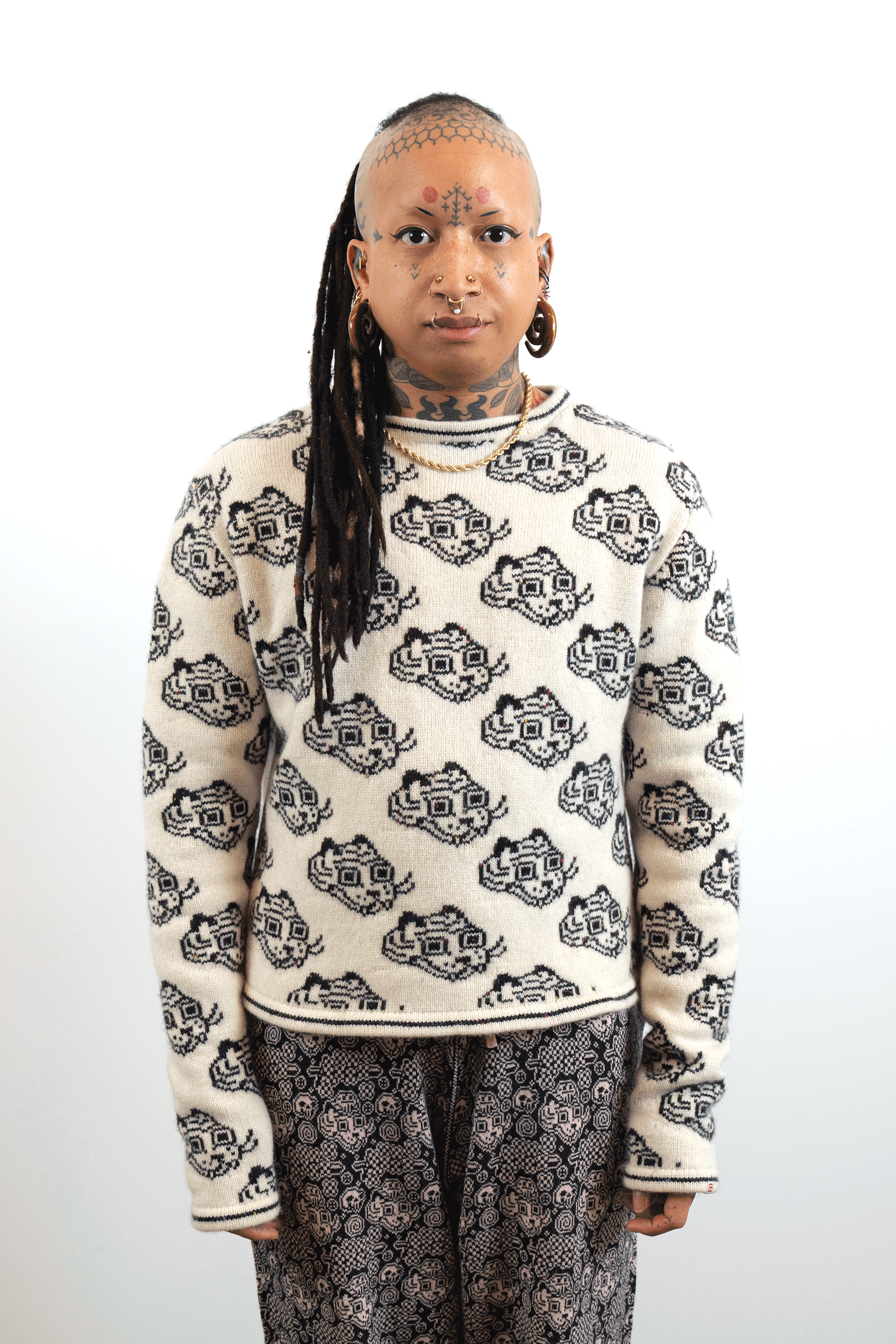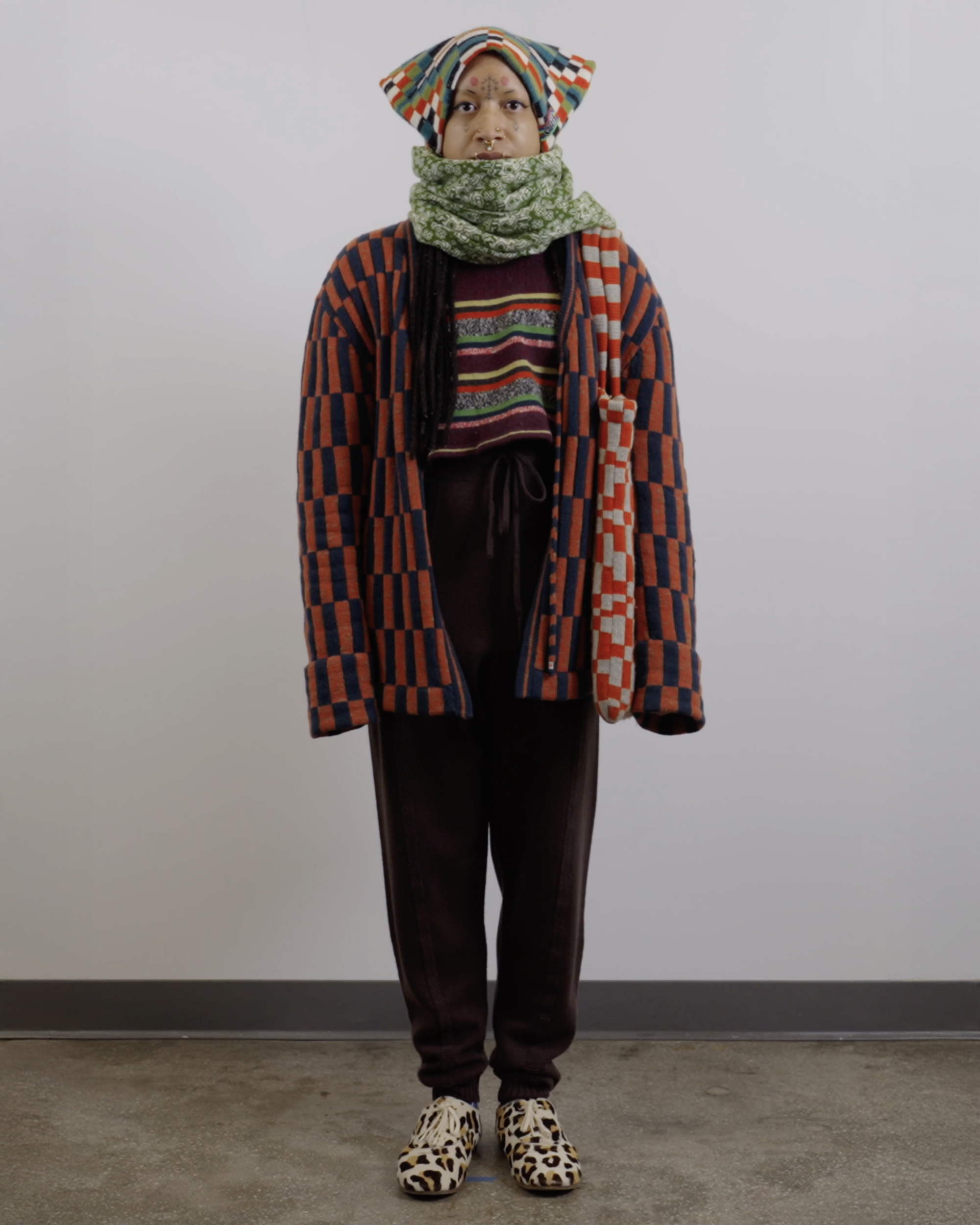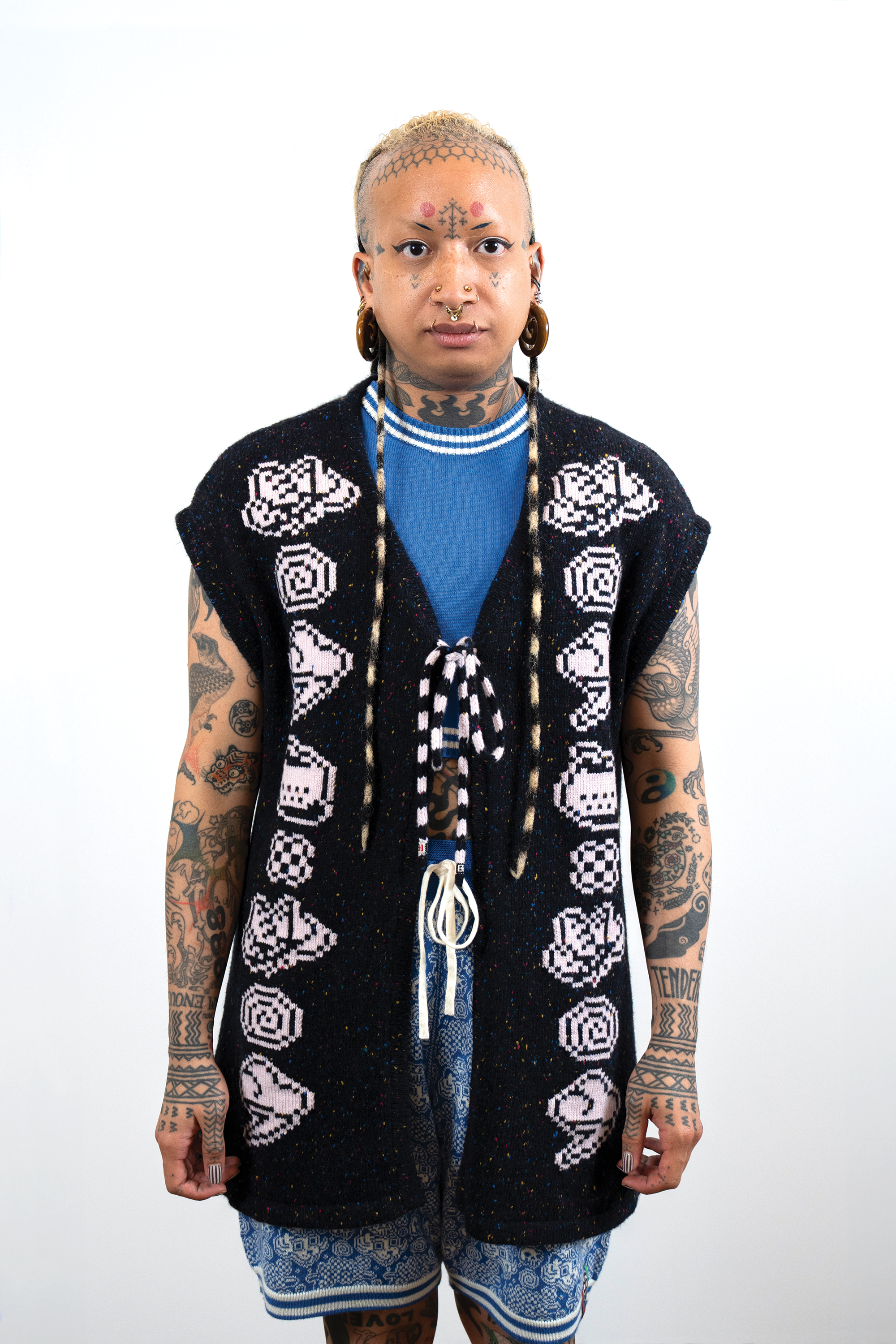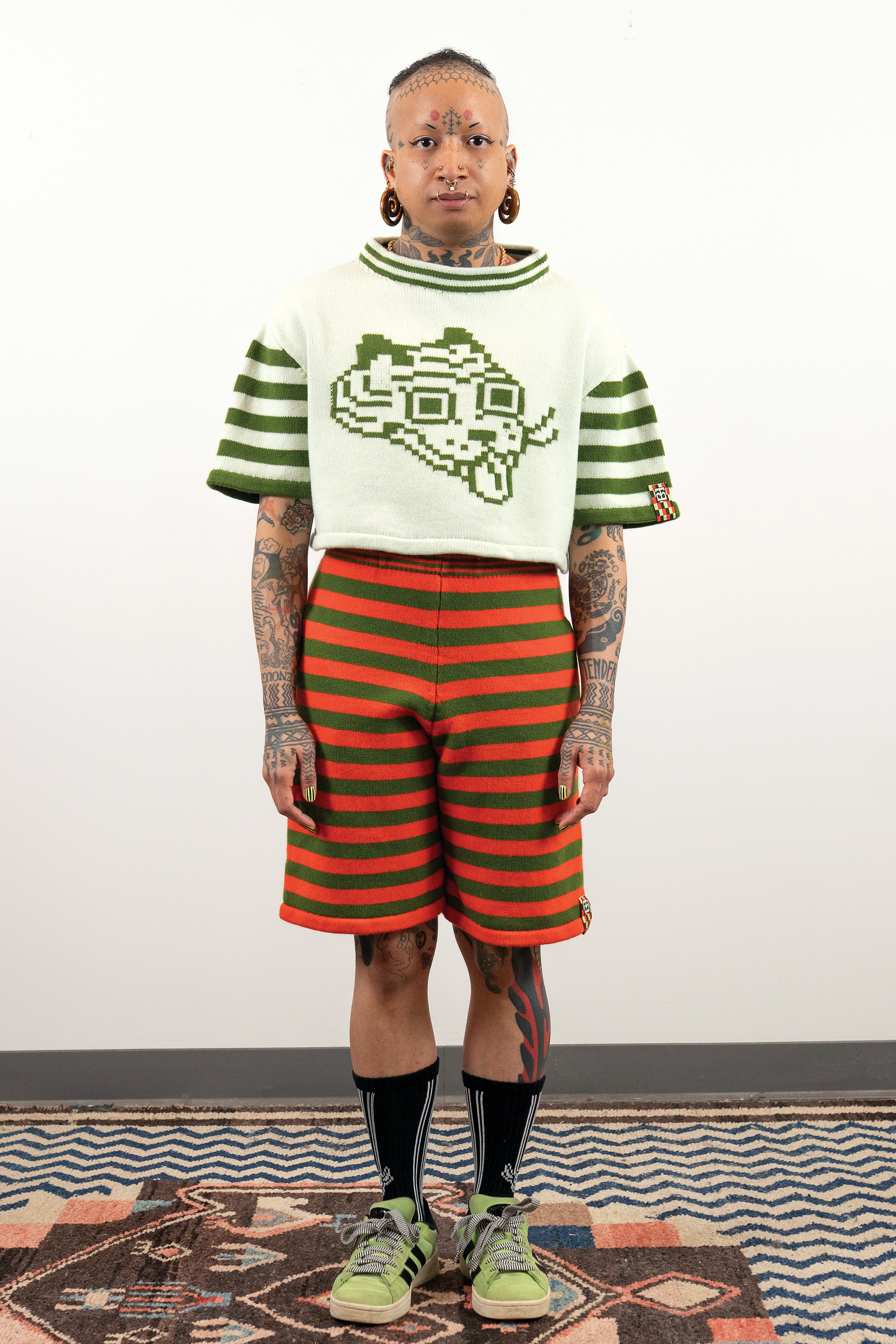 Check out this blog post for more context & background about the work.INTARSIACORE - My current body of work with the intarsia color work technique.GRID INPUTS - A detailed description of the invisible charts necessary to construct the artwork.FASHION - Information about the made-to-order fashion line produced by Tailored Industry.VISUAL LANGUAGE - A mostly complete description and history about the style of the artwork.DESIGN & PROCESS: Review the PROCESS: MACHINE KNITTING section of this page for a behind-the-scenes look.2025