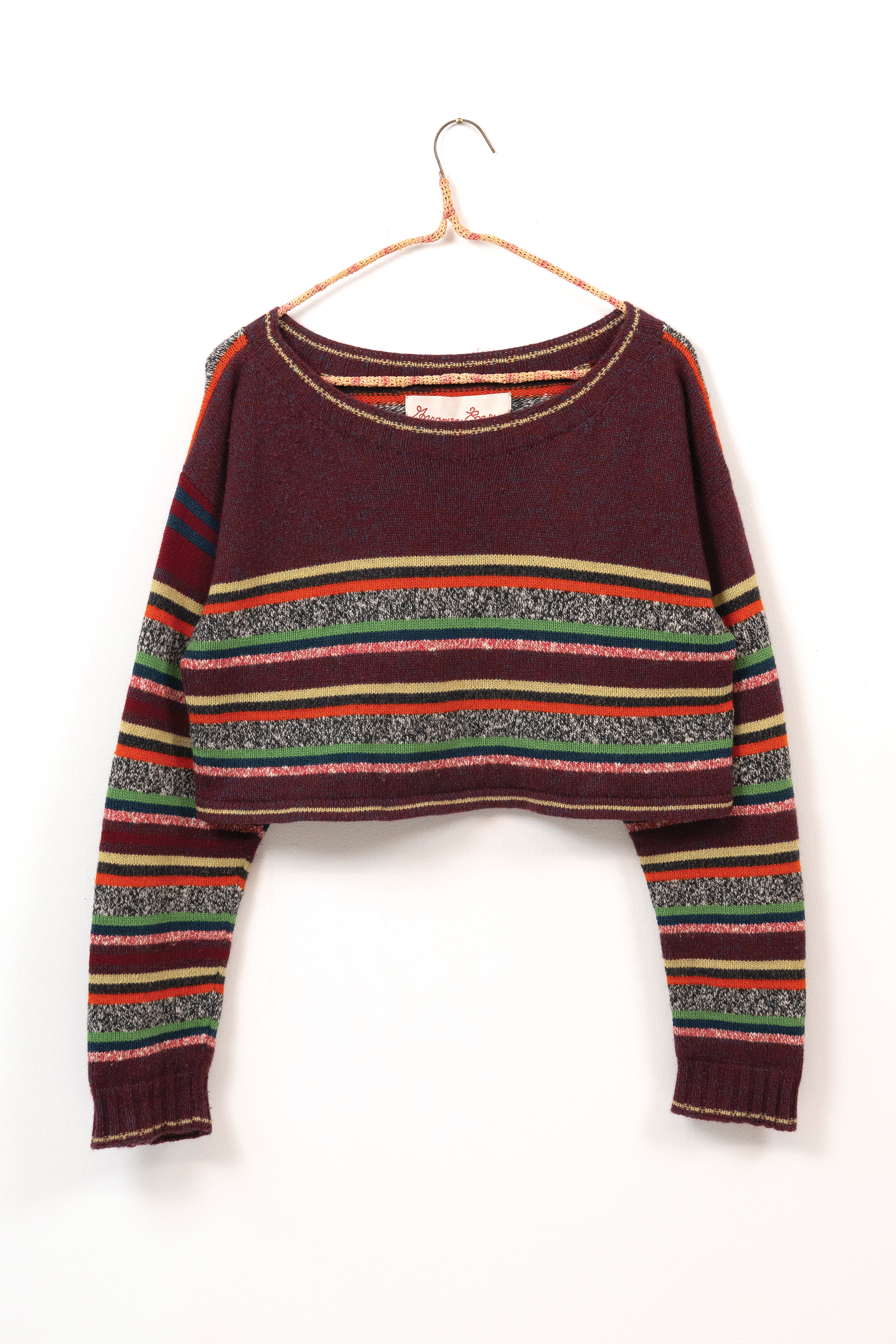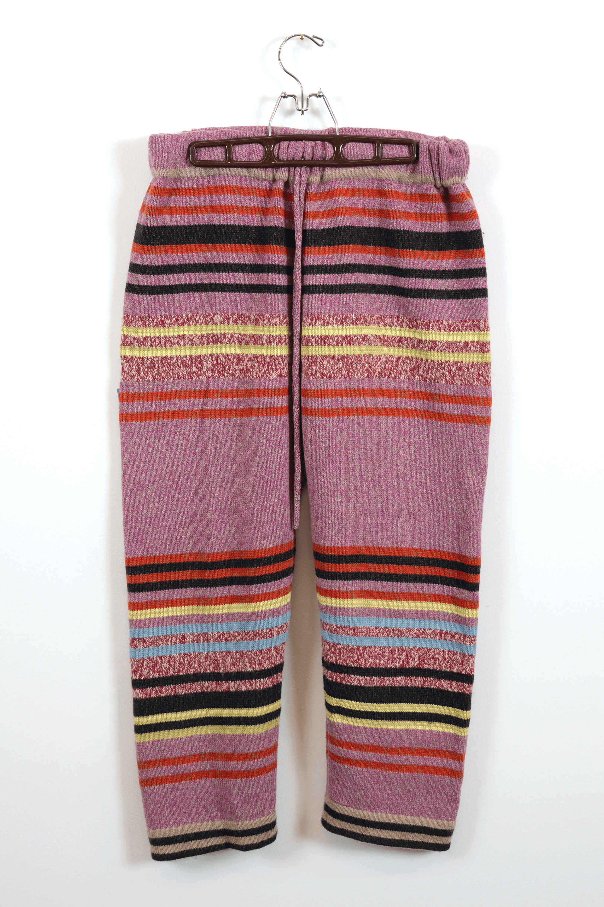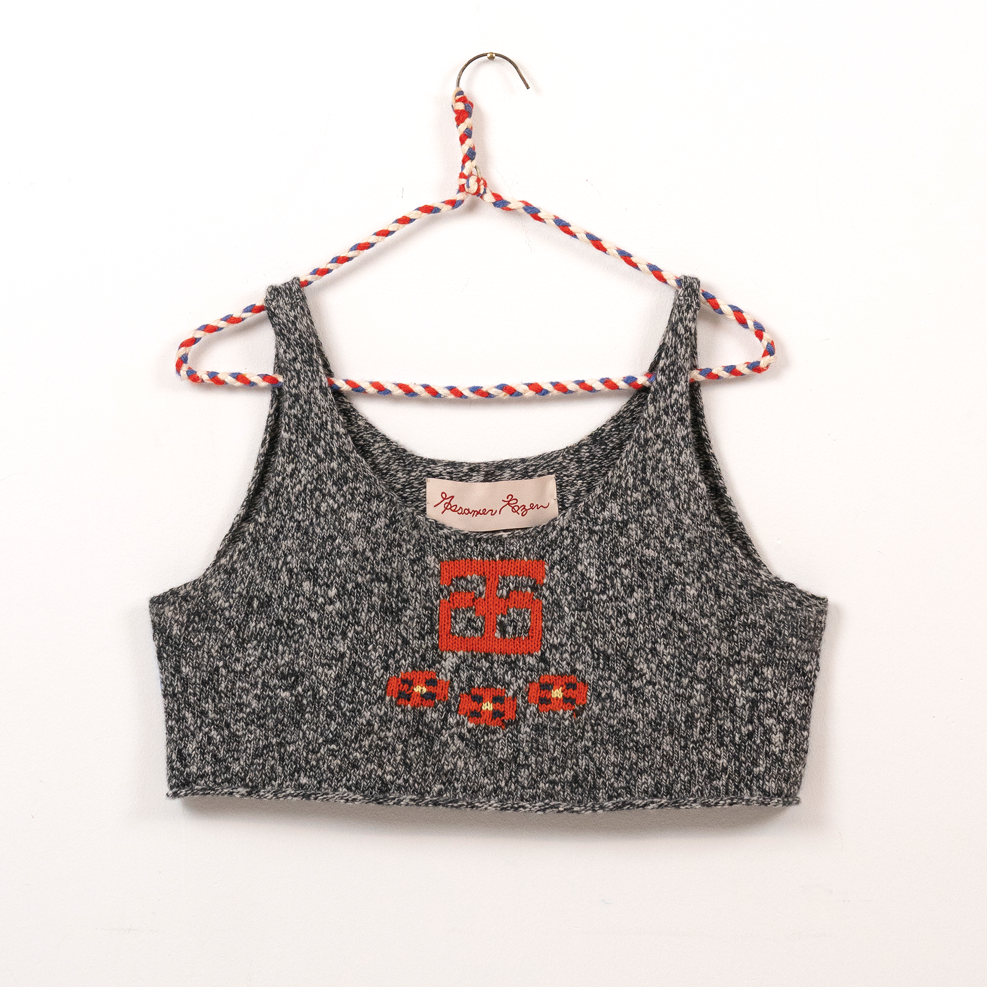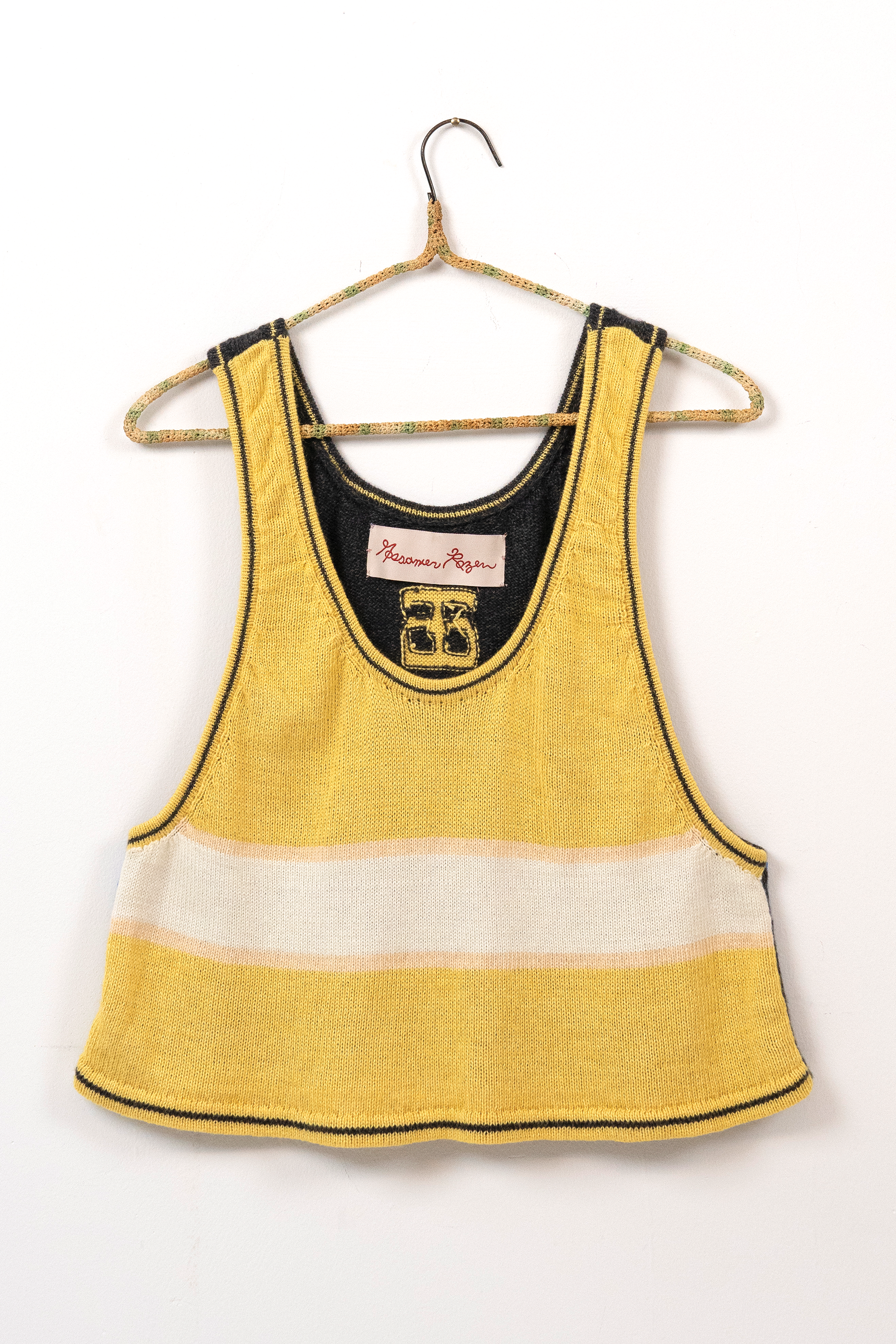 I discovered the knitting machine as early as 2010. Something about this instrument - its bed of needles, tension rods and rolling carriage - reminded me of my experience as a classically trained cellist. Tools become the voice of the artist, and I chose the knitting machine as my voice in the same way a weaver chooses their loom.I am self-taught in fashion design, pattern making and garment construction. I took one class in 2022 at the Textile Arts Center in Brooklyn, New York to learn the basics of the knitting machine, and after that my knowledge comes from online tutorials, books, and trial and error. I worked on tech packs for the made-to-order fashion line with Tailored Industry while I tinkered with my own machine, and both avenues helped me translate my visual language into knitwear. By 2025 I could finish handmade samples of pieces eventually produced by the factory.In 2024 I began stretching my knitted pieces over frames, with the purpose of elevating the work beyond a domestic textile and into the realm of fine art. I often asked myself why weaving has more presence in a gallery and museum compared to knitting. For this reason I continue to produce work in the context of non-functional, decorative art.I use intarsia, stranded yarn (fair isle), and plain jersey knit techniques in my work.Machine knitting is preceded by my first collection of handmade textiles cut and sewn from vintage quilts in 2020.Material