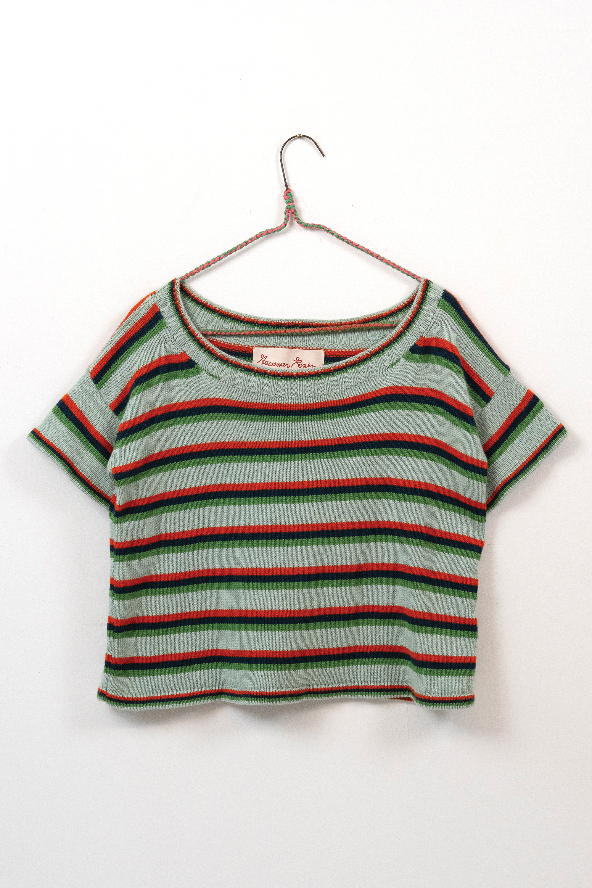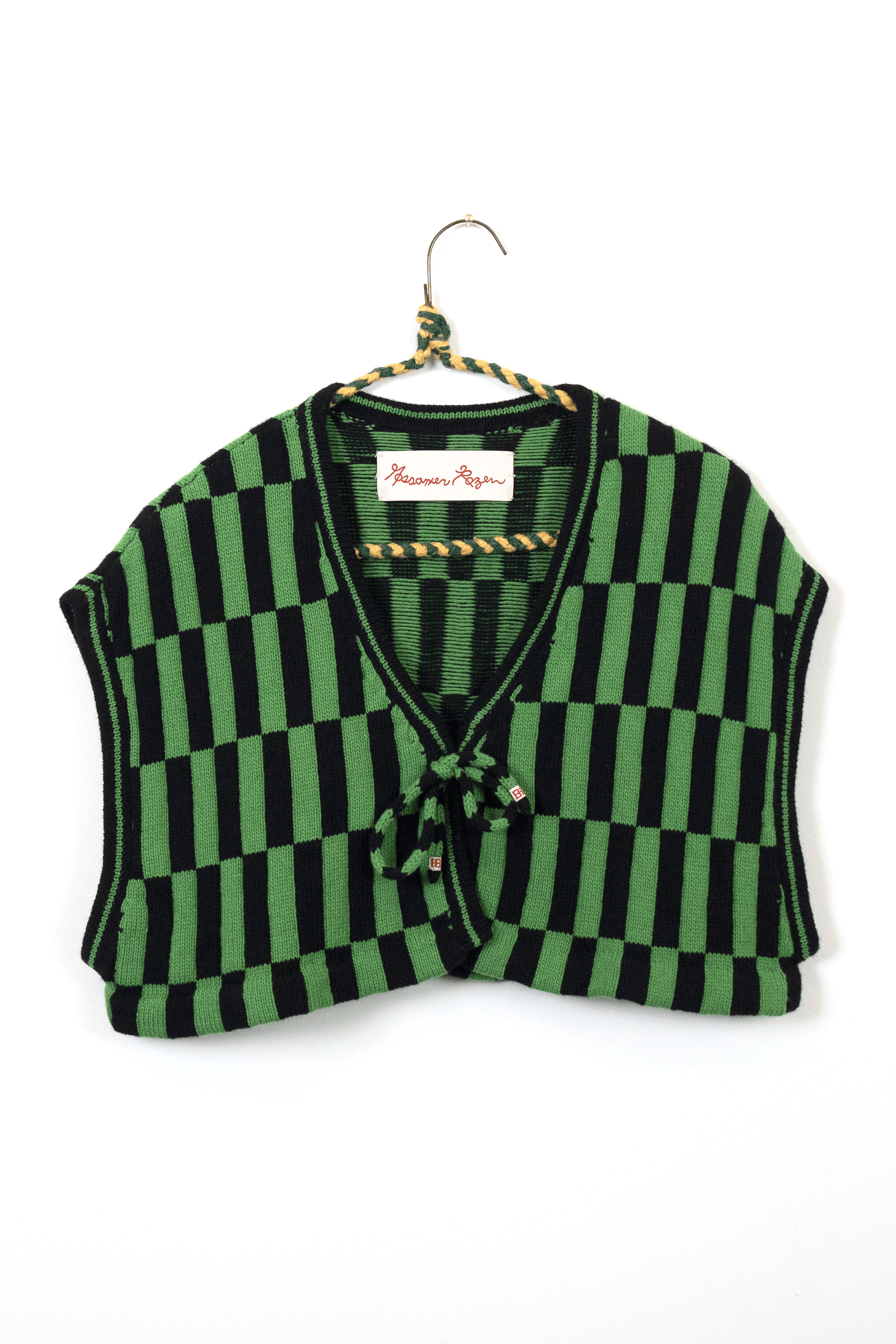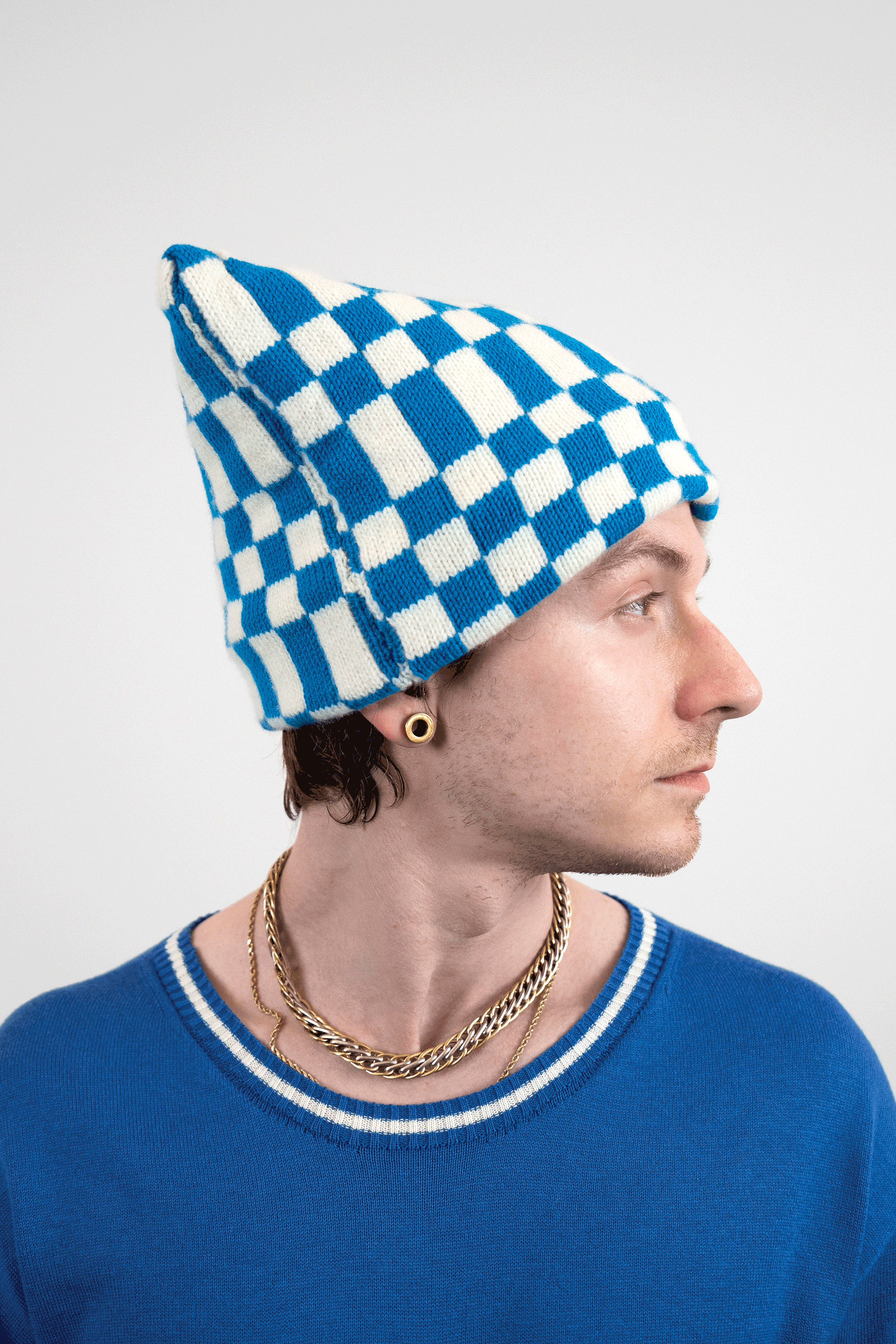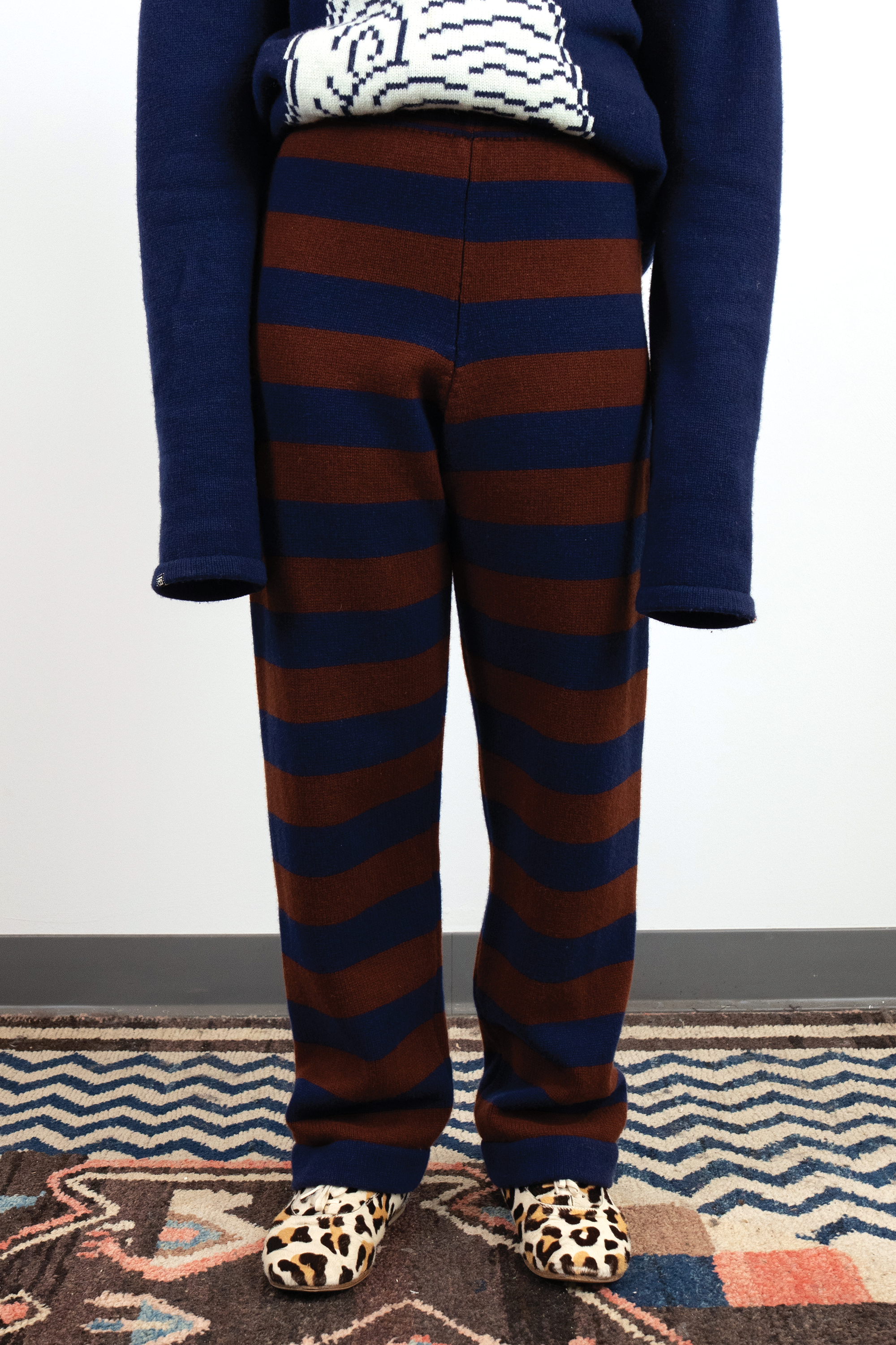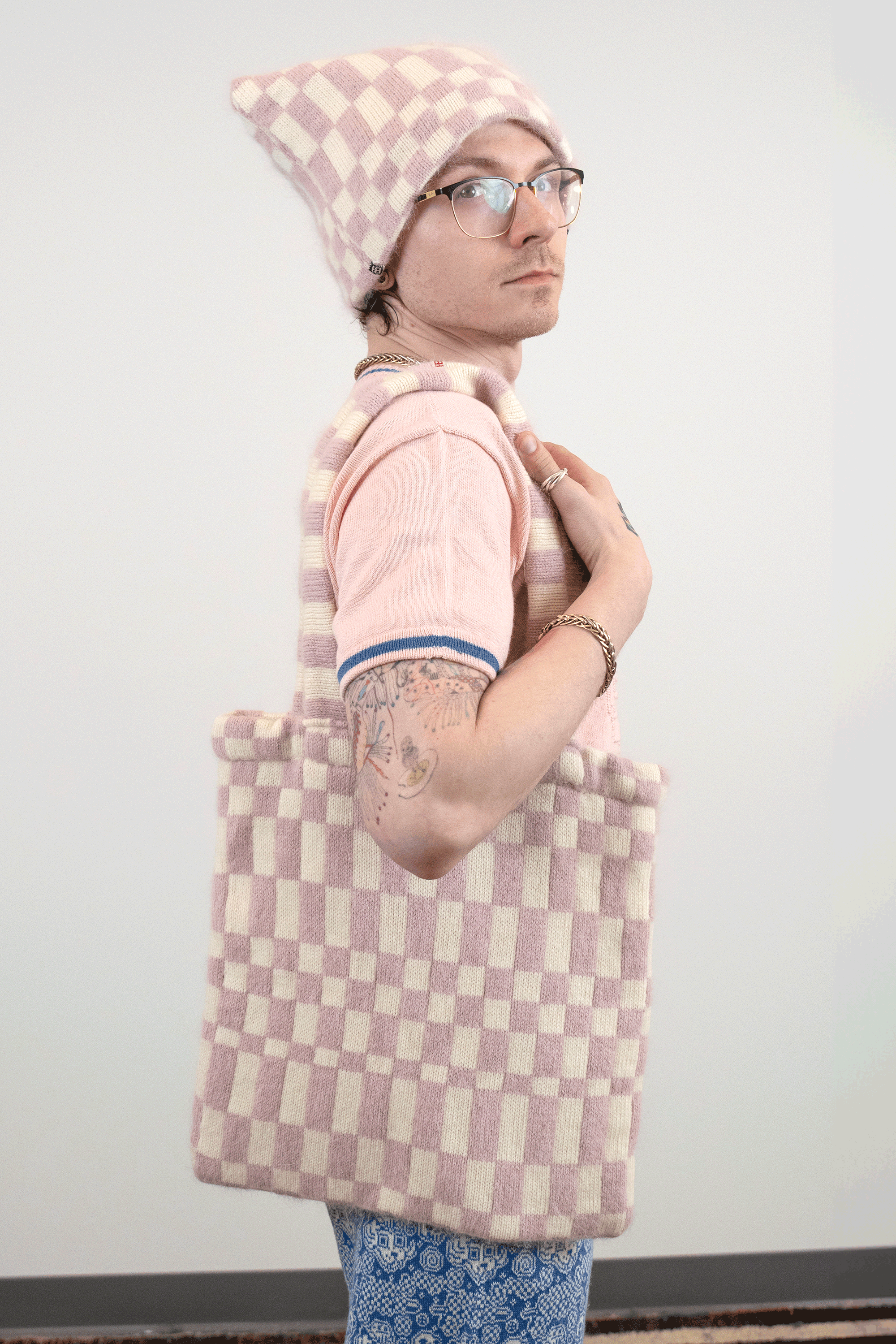 I discovered the knitting machine as early as 2010. Something about this instrument - its bed of needles, tension rods and rolling carriage - reminded me of my experience as a classically trained cellist. Tools become the voice of the artist, and I chose the knitting machine as my voice in the same way a weaver chooses their loom.I am self-taught in fashion design, pattern making and garment construction. I took one class in 2022 at the Textile Arts Center in Brooklyn, New York to learn the basics of the knitting machine, and after that my knowledge comes from online tutorials, books, and trial and error. I worked on tech packs for the made-to-order fashion line with Tailored Industry while I tinkered with my own machine, and both avenues helped me translate my visual language into knitwear. By 2025 I could finish handmade samples of pieces eventually produced by the factory.In 2024 I began stretching my knitted pieces over frames, with the purpose of elevating the work beyond a domestic textile and into the realm of fine art. I often asked myself why weaving has more presence in a gallery and museum compared to knitting. For this reason I continue to produce work in the context of non-functional, decorative art.I use intarsia, stranded yarn (fair isle), and plain jersey knit techniques in my work.Machine knitting is preceded by my first collection of handmade textiles cut and sewn from vintage quilts in 2020.Material