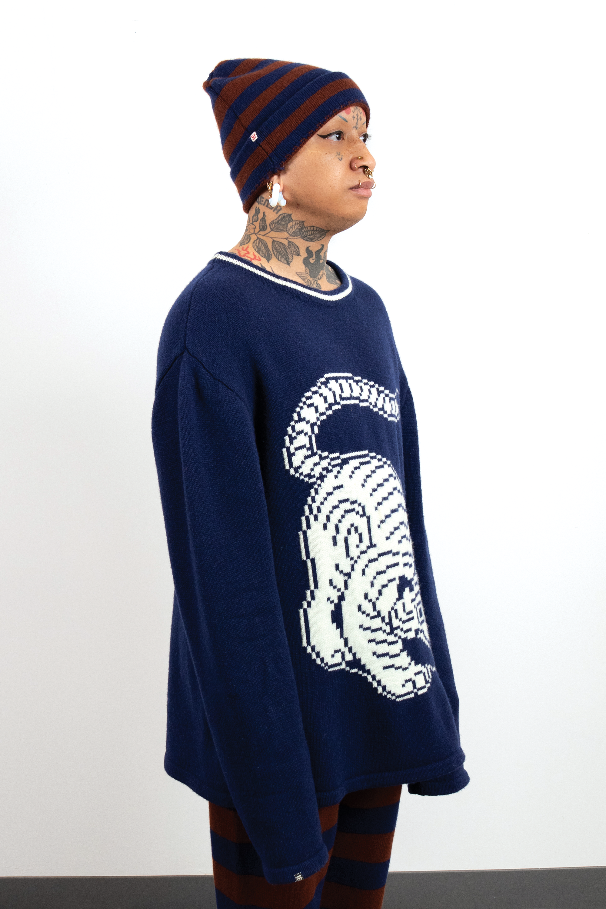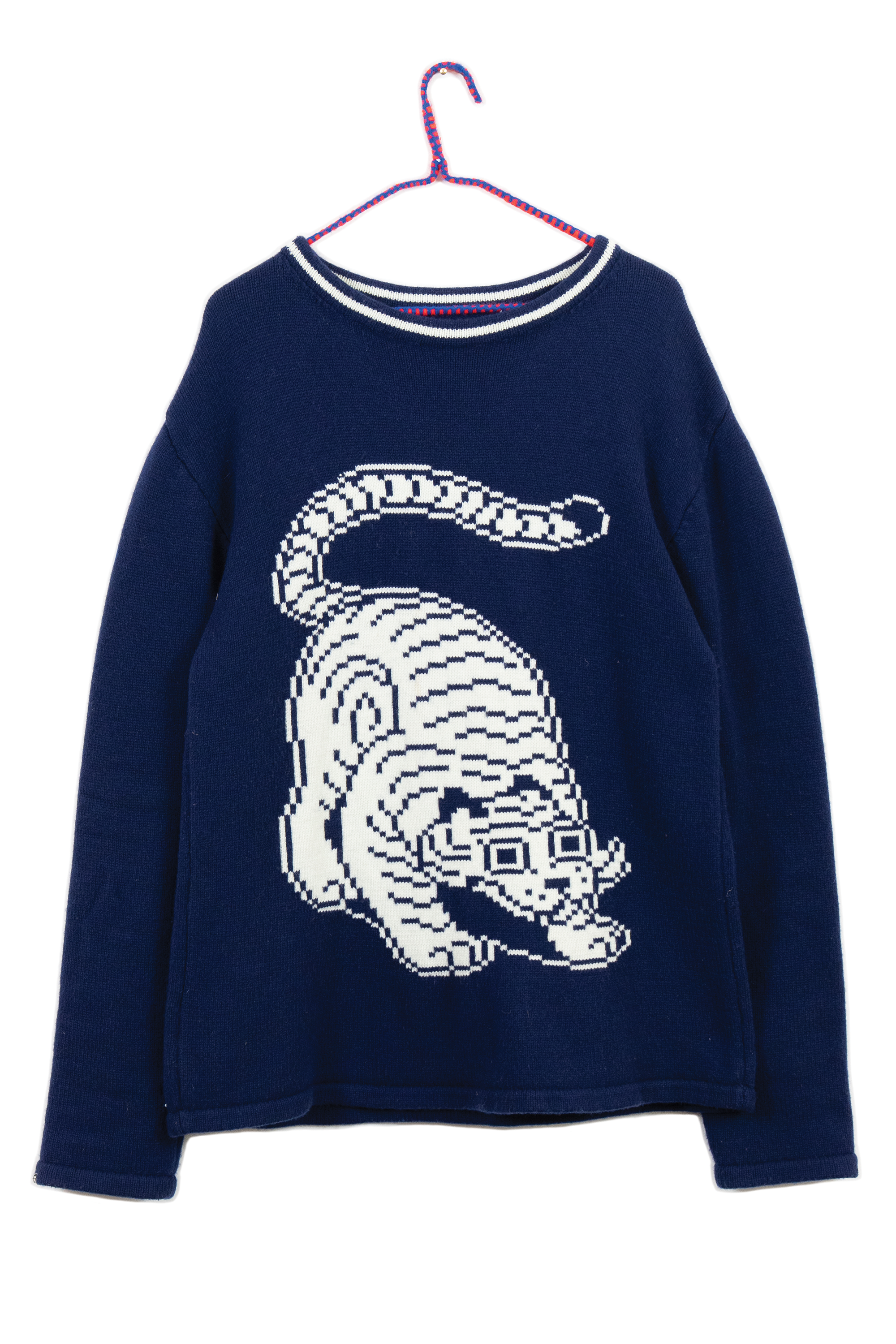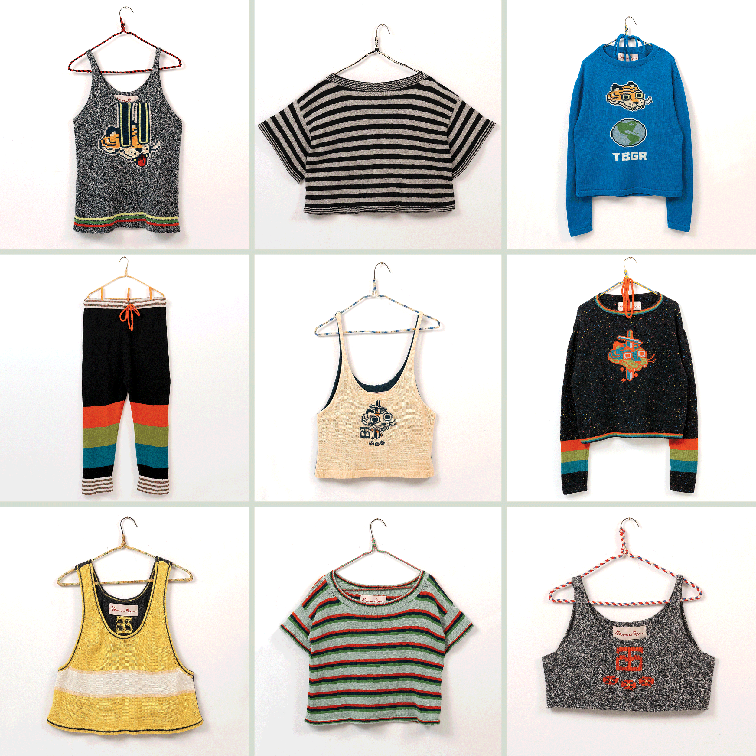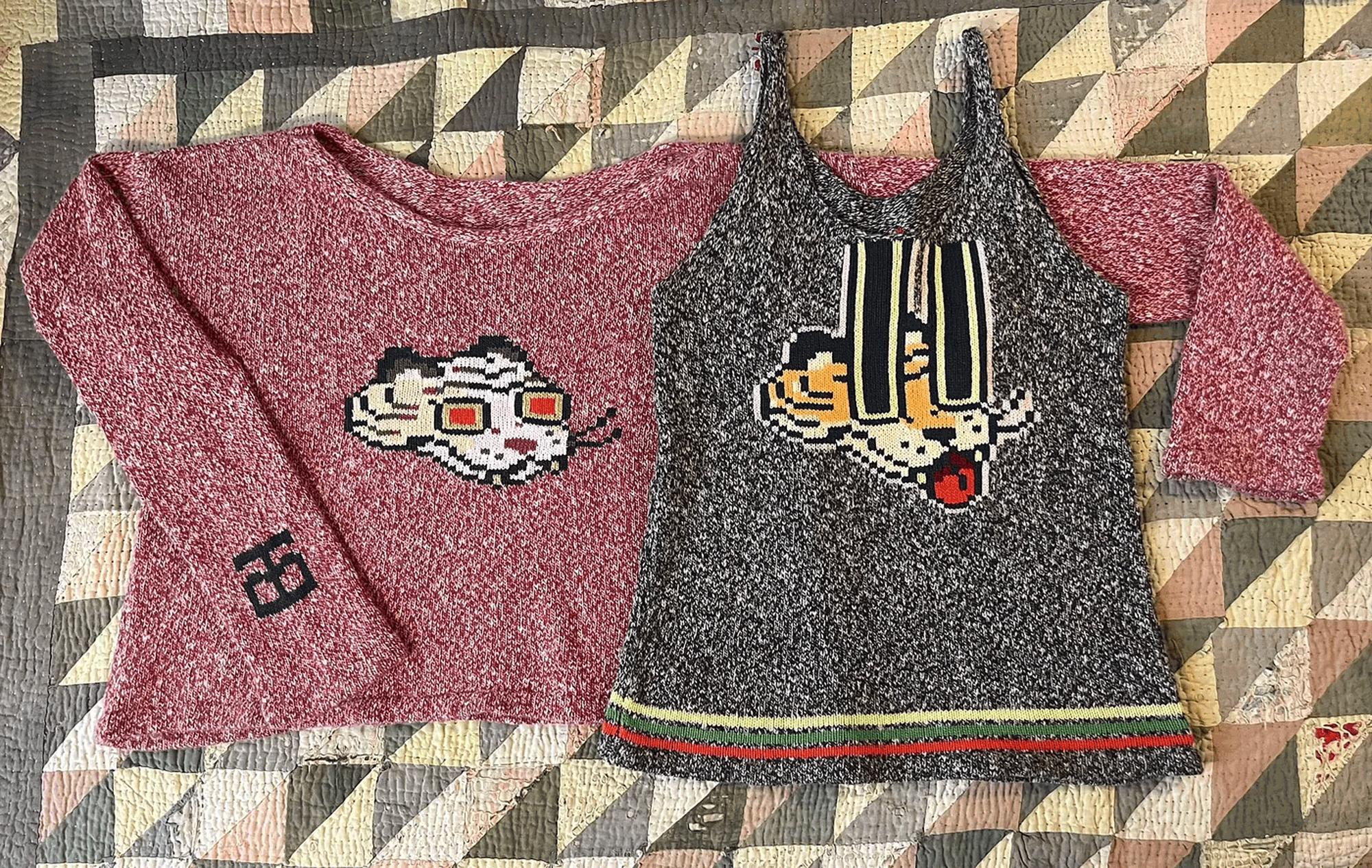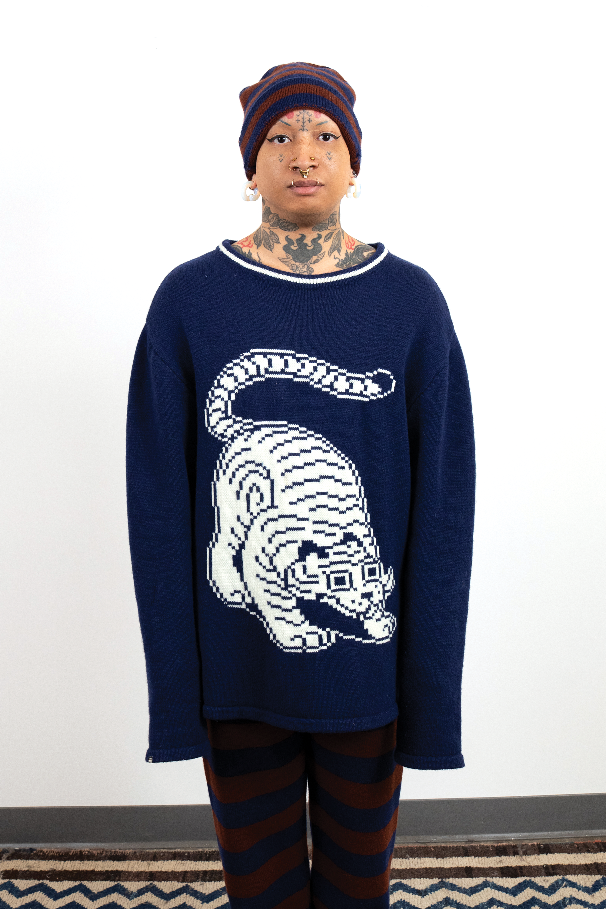 I chose knitting to produce garments and objects because the process allows me to design not only the garment but also the fabric itself. I choose to use the knitting machine, instead of hand knitting, because the process to design and work one row of stitches at a time is interesting to me. The visual pattern on the garment is architectural and becomes a helpful constraint for the body of work. The grid input scales my hand-drawn visual language into a digestible format that works with multiple mediums in my repertoire. The Tigerbob pixel tiger motif was designed with knit outputs in mind.Background