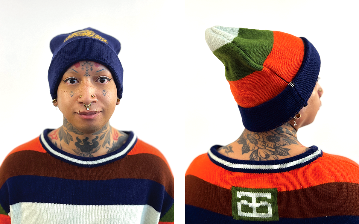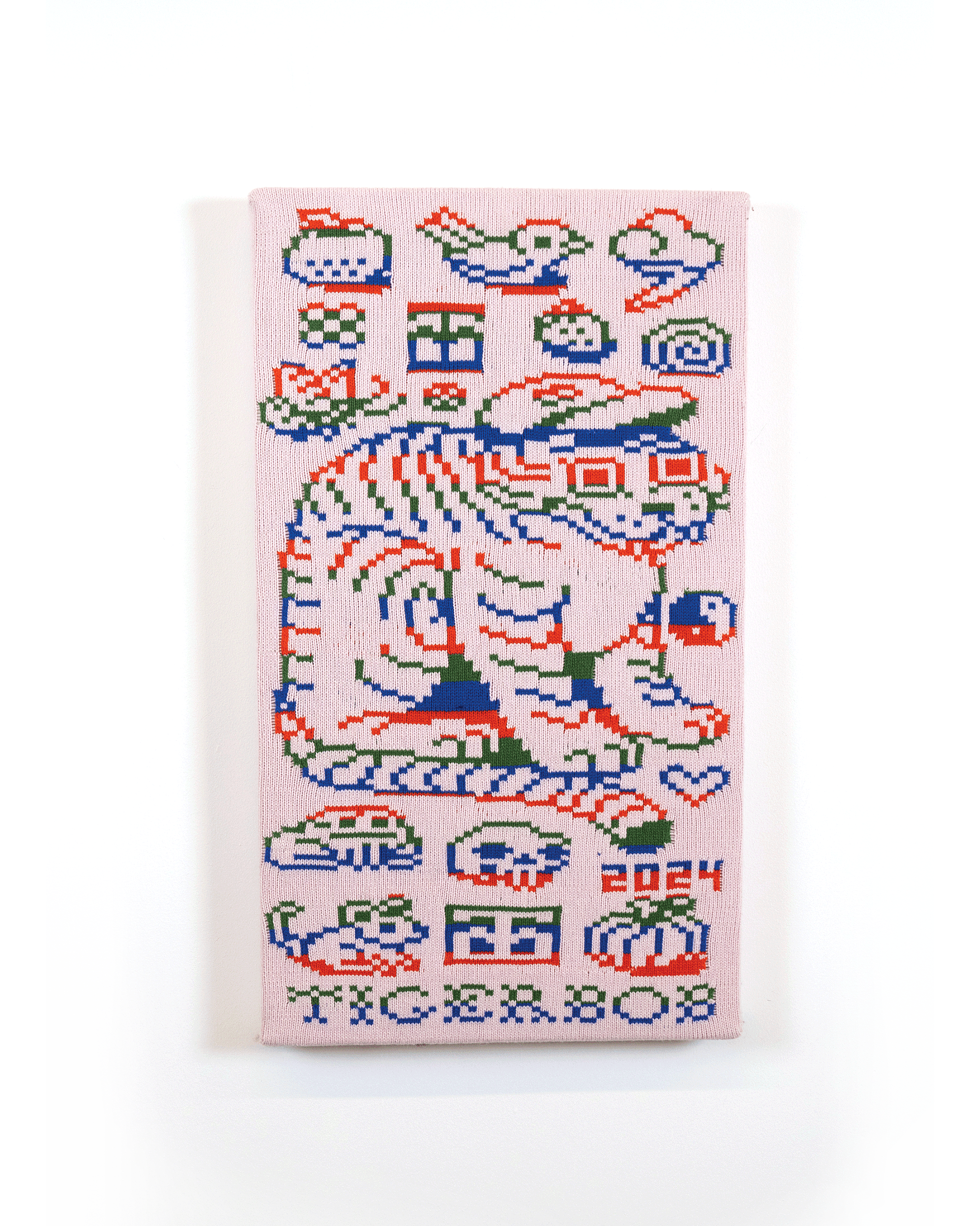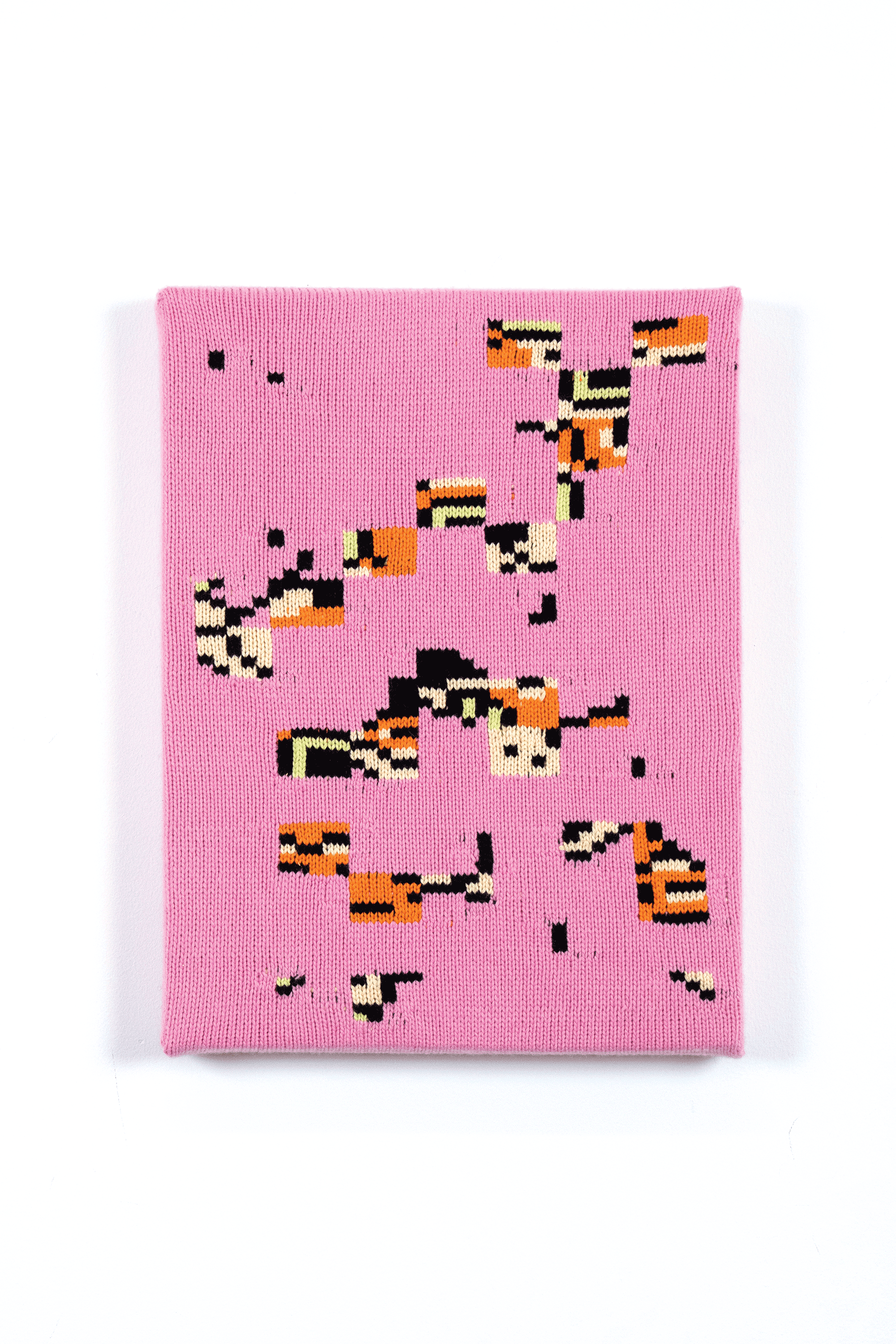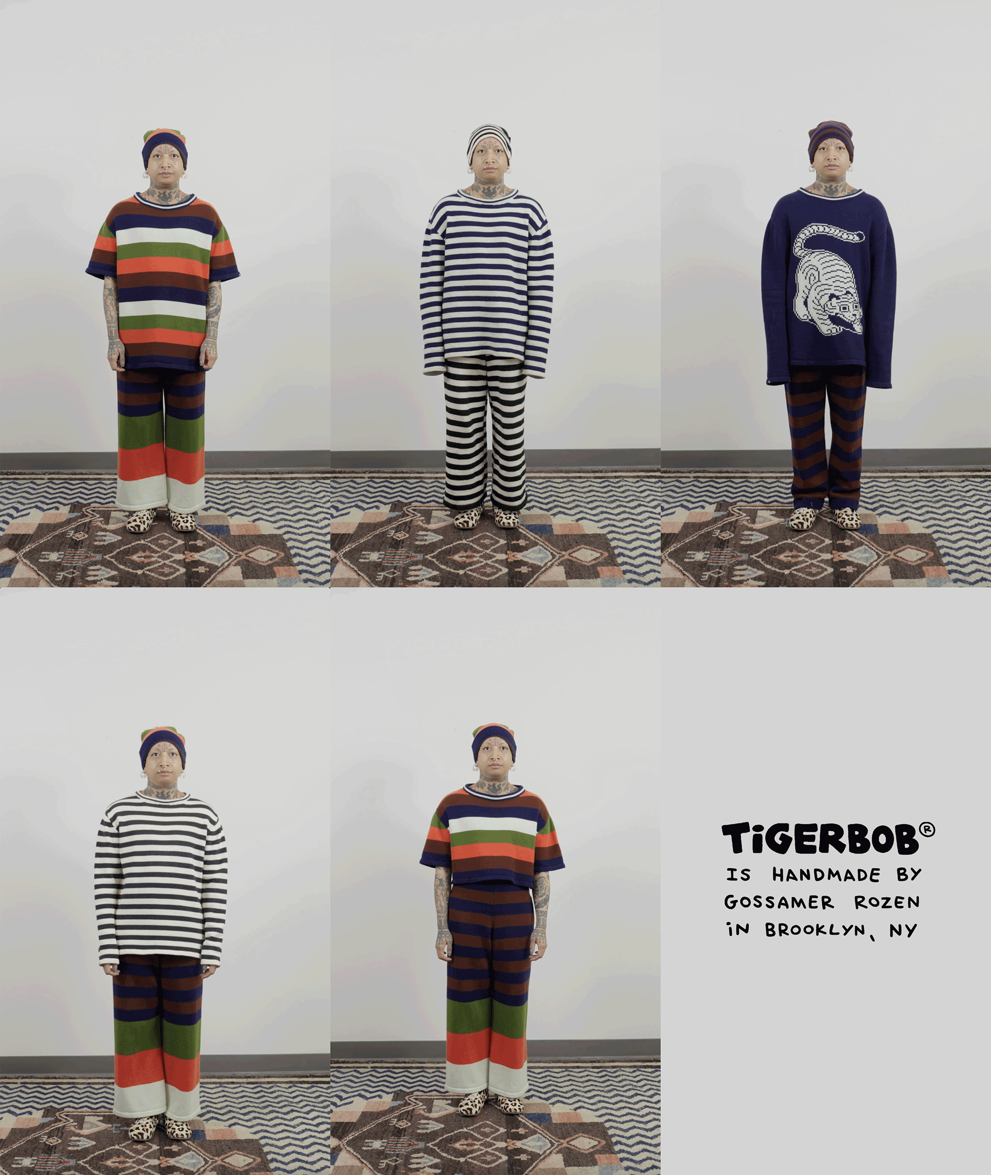 I chose knitting to produce garments and objects because the process allows me to design not only the garment but also the fabric itself. I choose to use the knitting machine, instead of hand knitting, because the process to design and work one row of stitches at a time is interesting to me. The visual pattern on the garment is architectural and becomes a helpful constraint for the body of work. The grid input scales my hand-drawn visual language into a digestible format that works with multiple mediums in my repertoire. The Tigerbob pixel tiger motif was designed with knit outputs in mind.Background