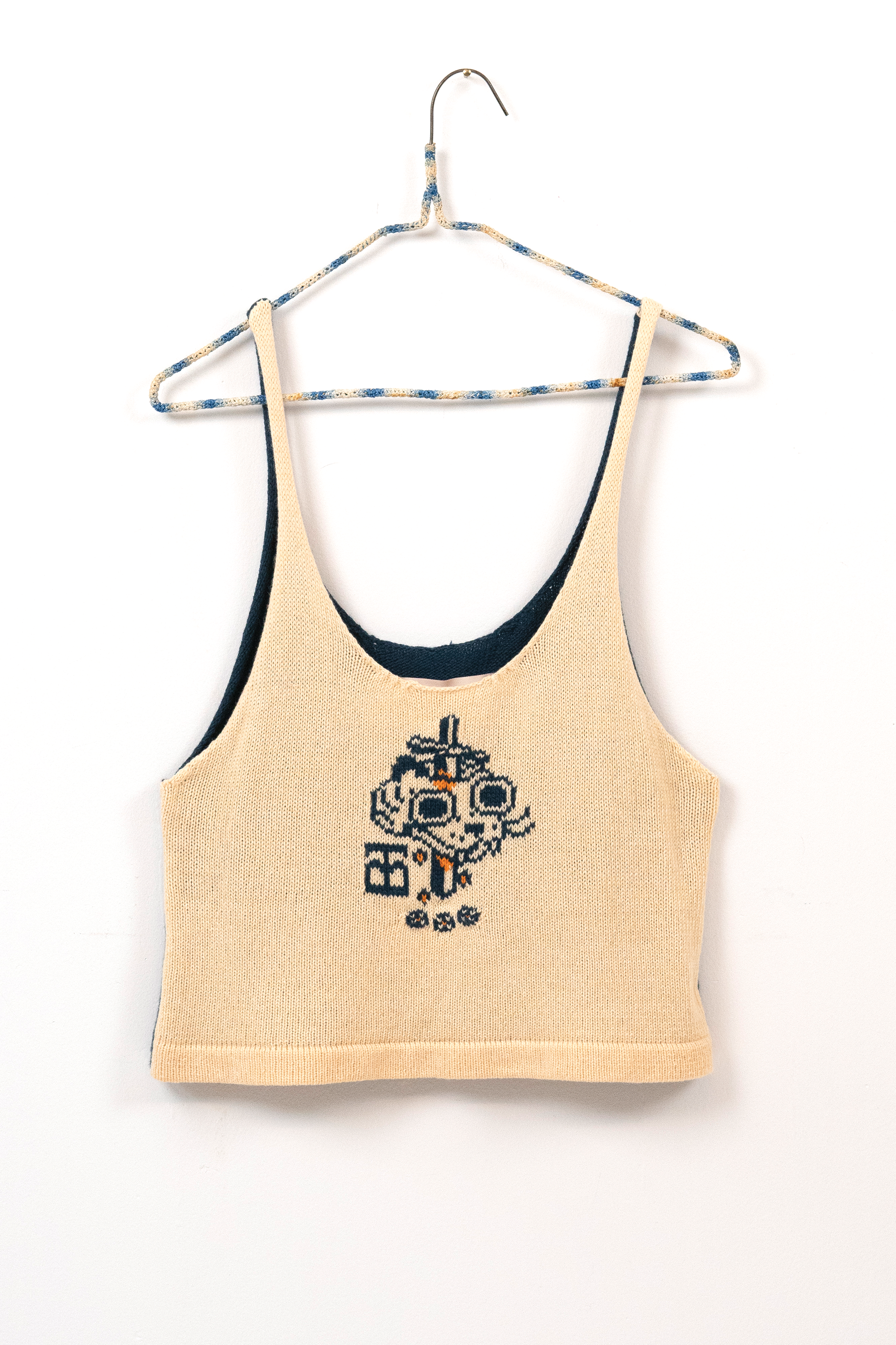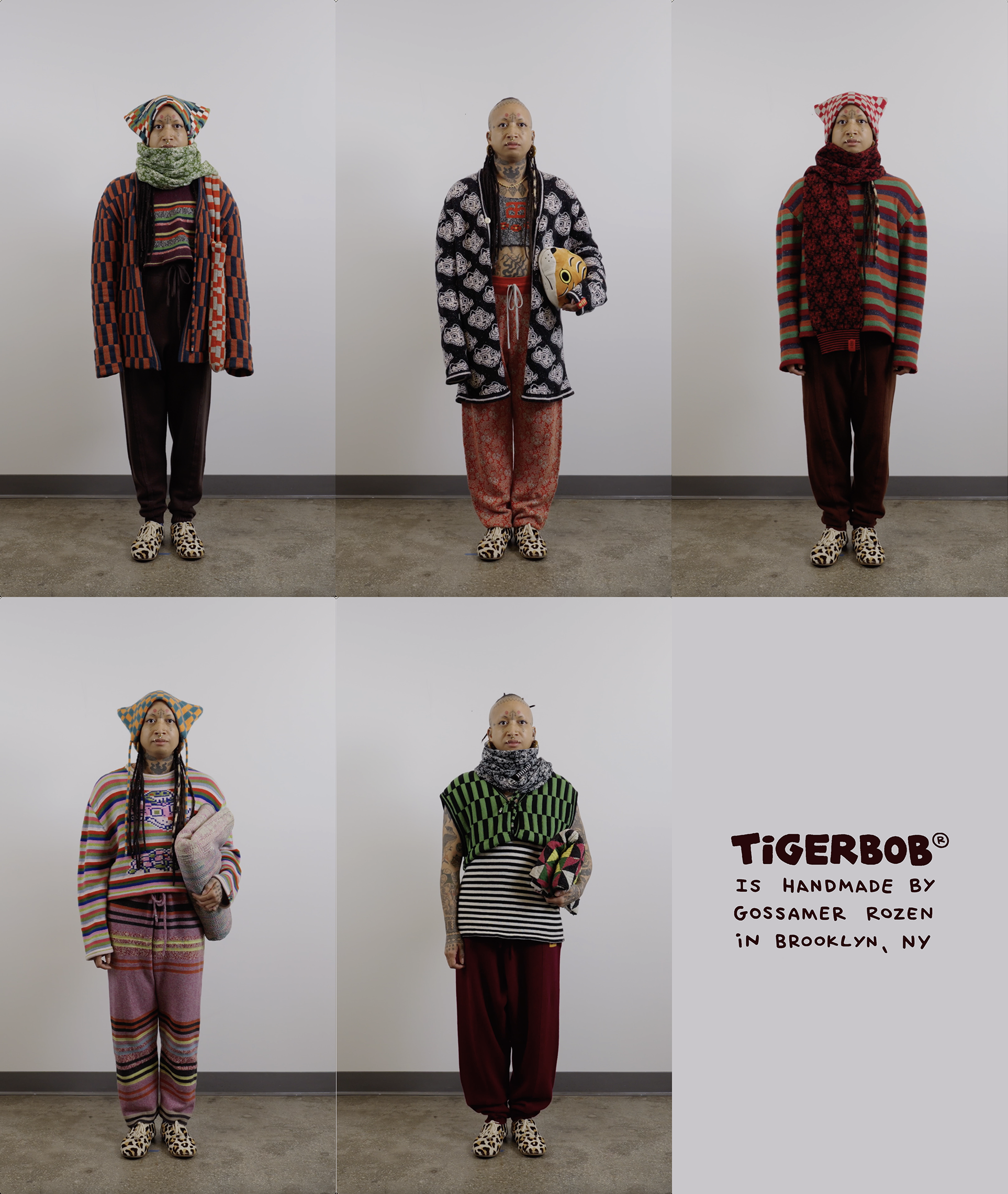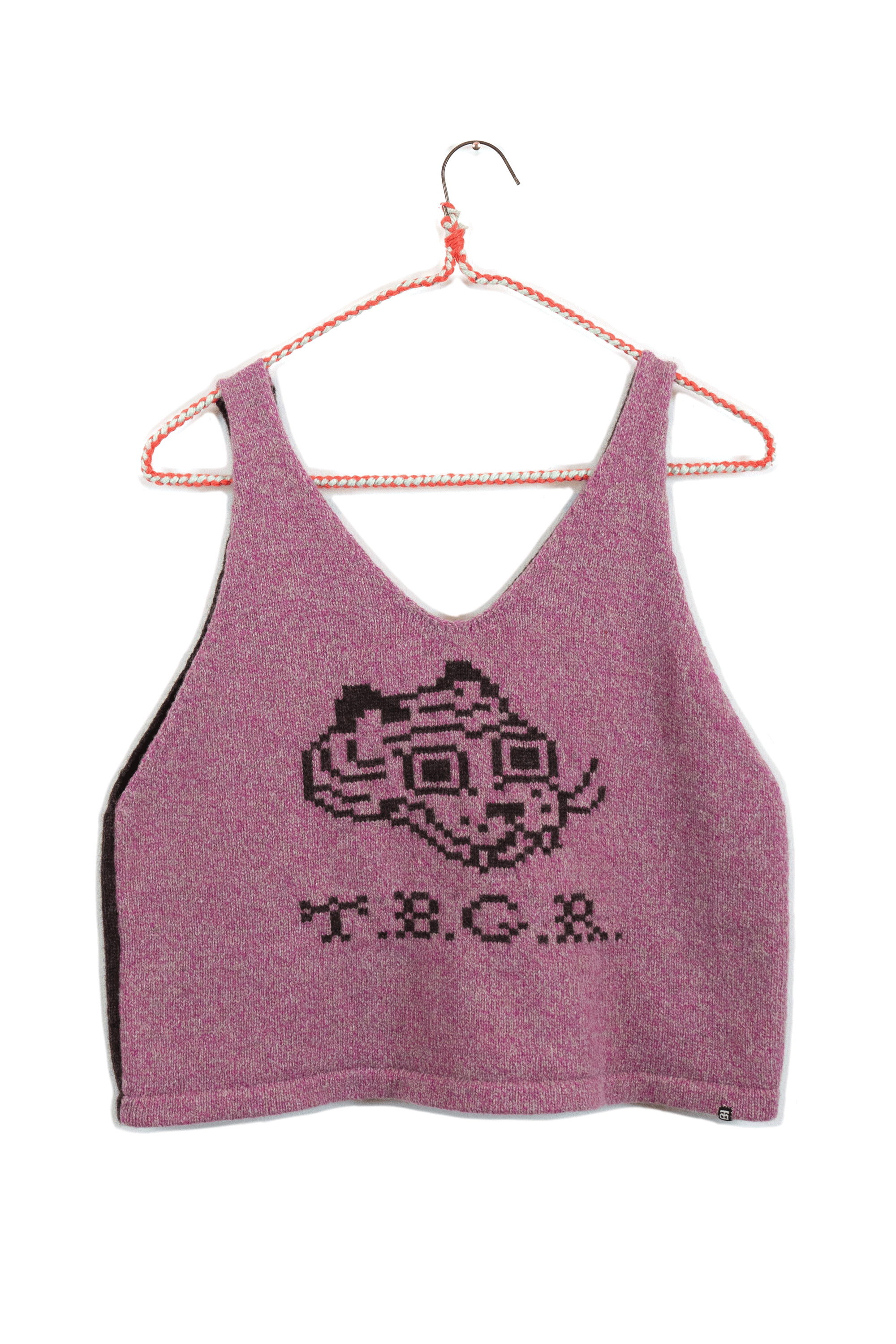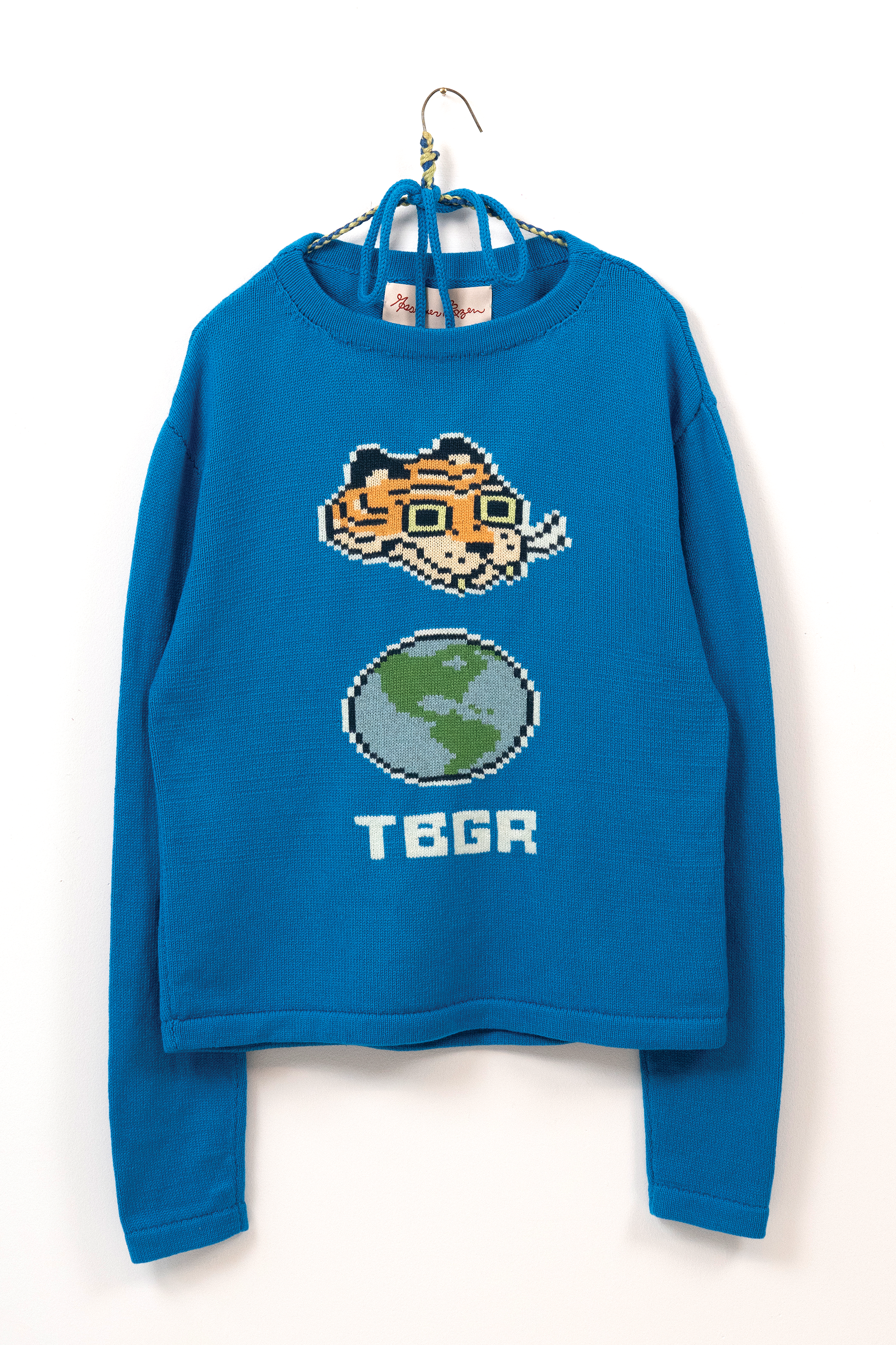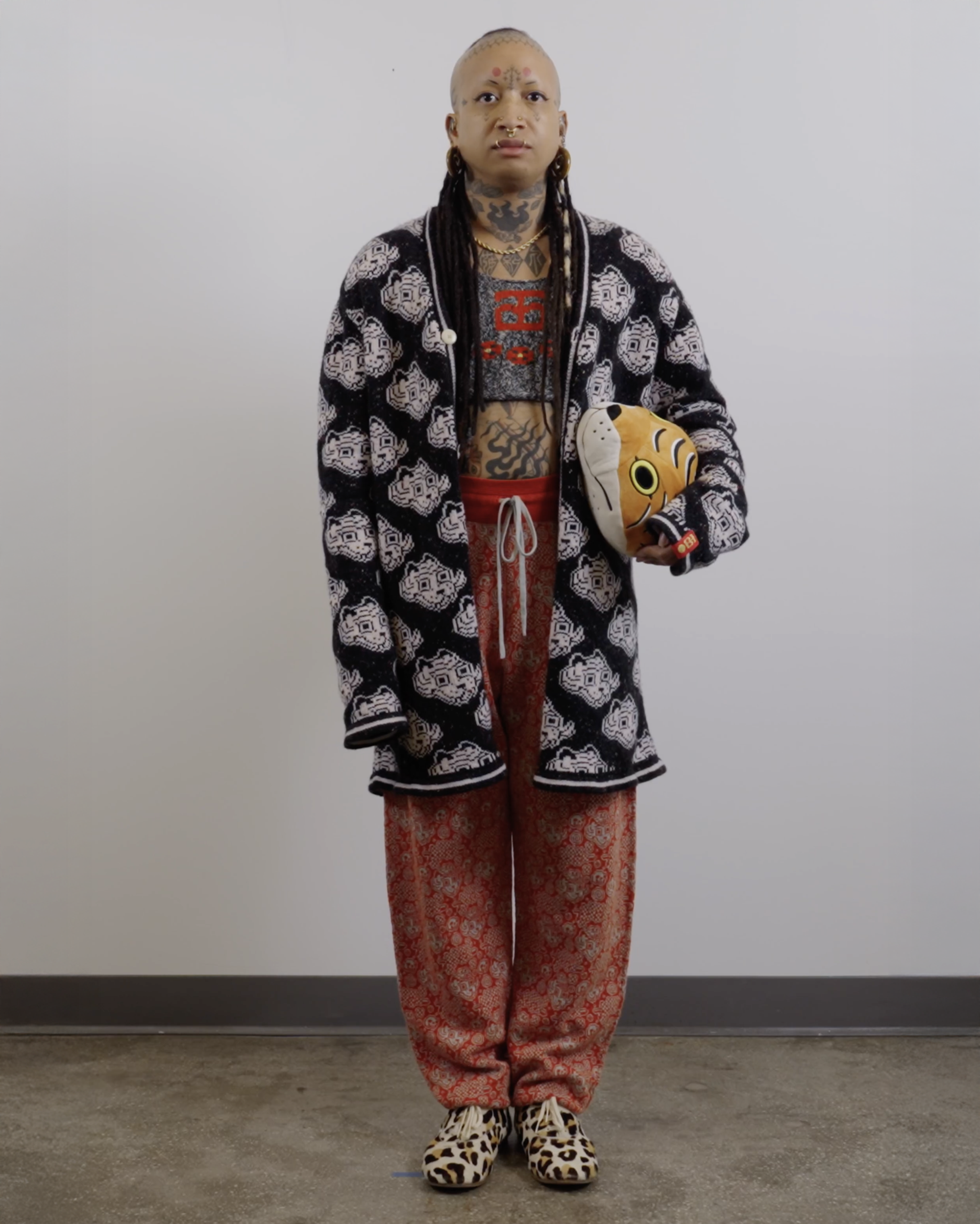 I chose knitting to produce garments and objects because the process allows me to design not only the garment but also the fabric itself. I choose to use the knitting machine, instead of hand knitting, because the process to design and work one row of stitches at a time is interesting to me. The visual pattern on the garment is architectural and becomes a helpful constraint for the body of work. The grid input scales my hand-drawn visual language into a digestible format that works with multiple mediums in my repertoire. The Tigerbob pixel tiger motif was designed with knit outputs in mind.Background