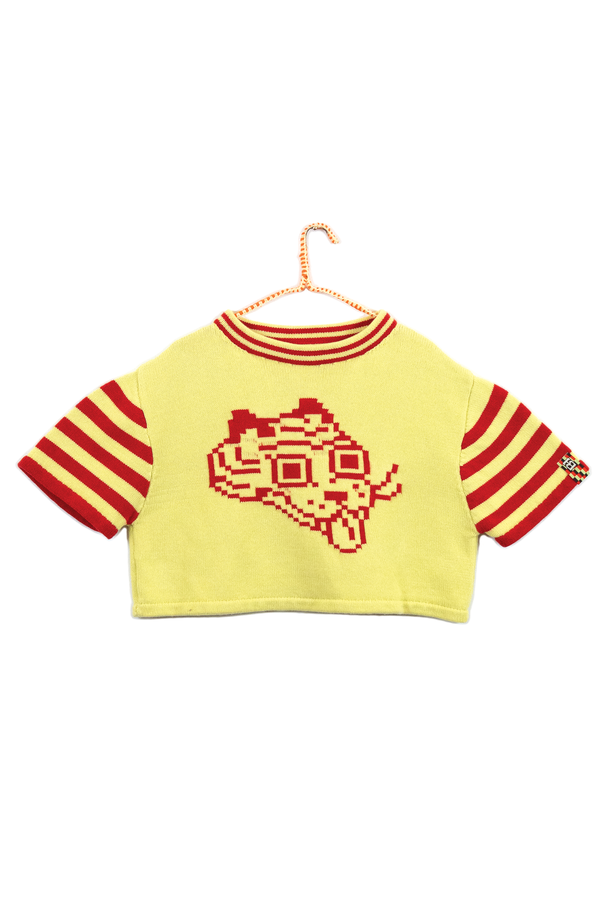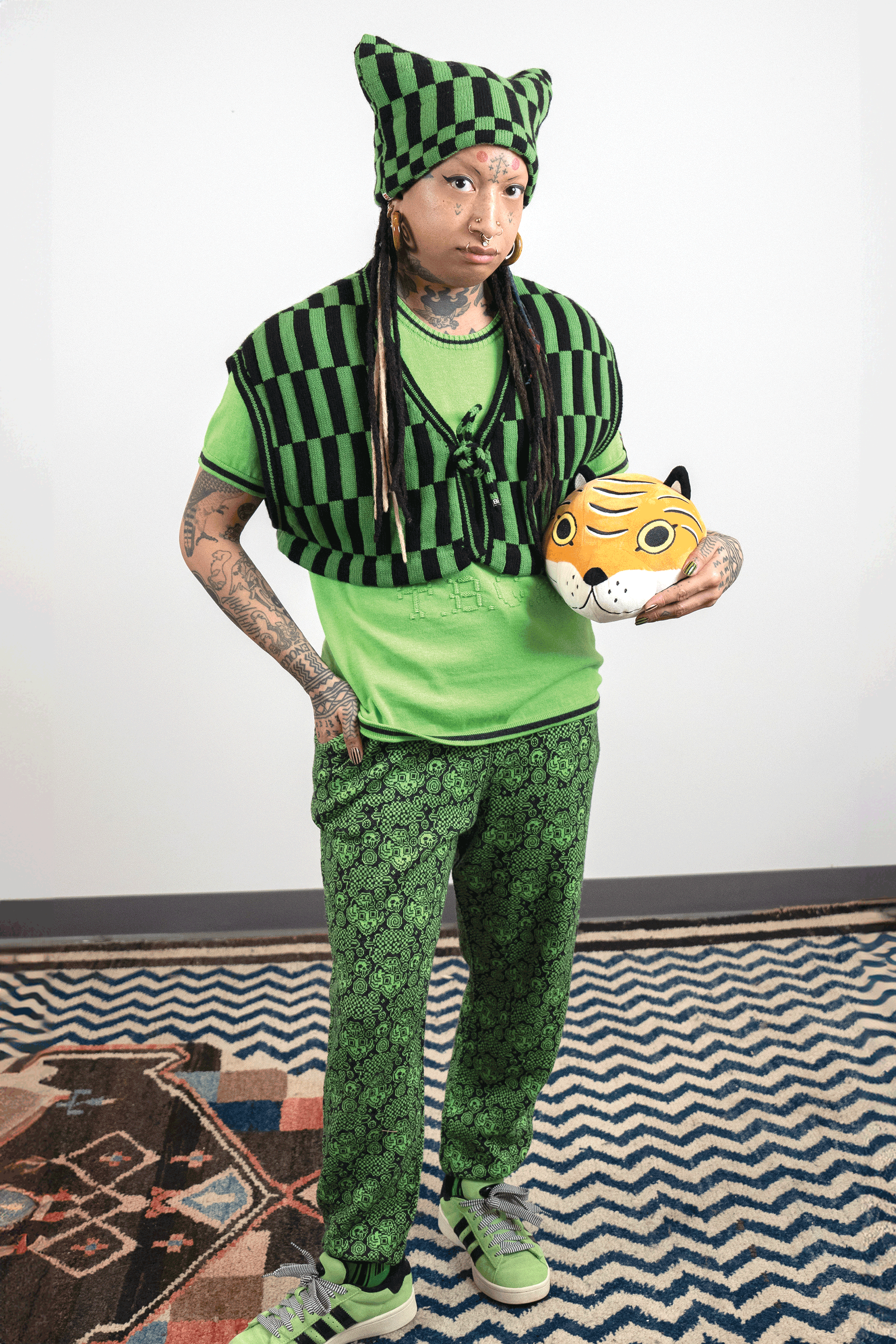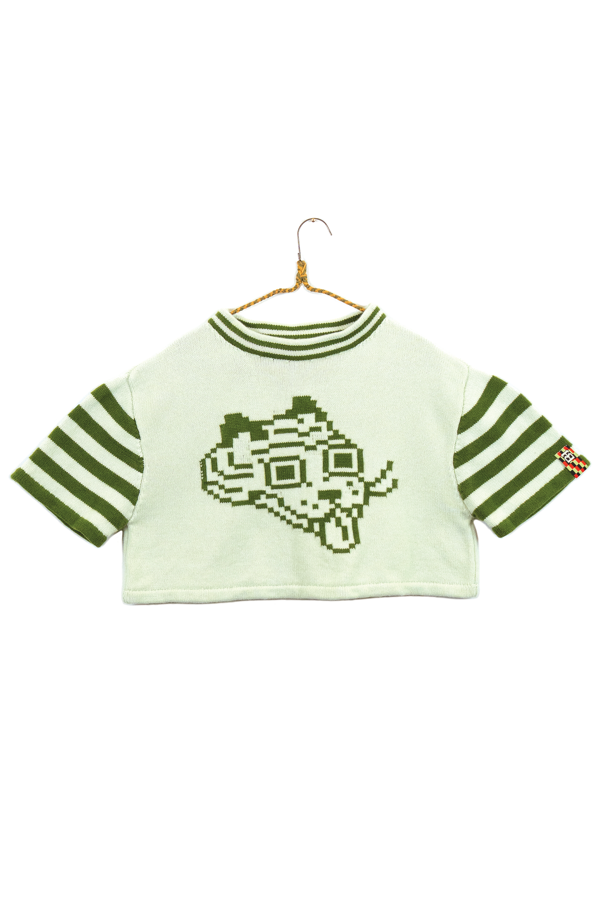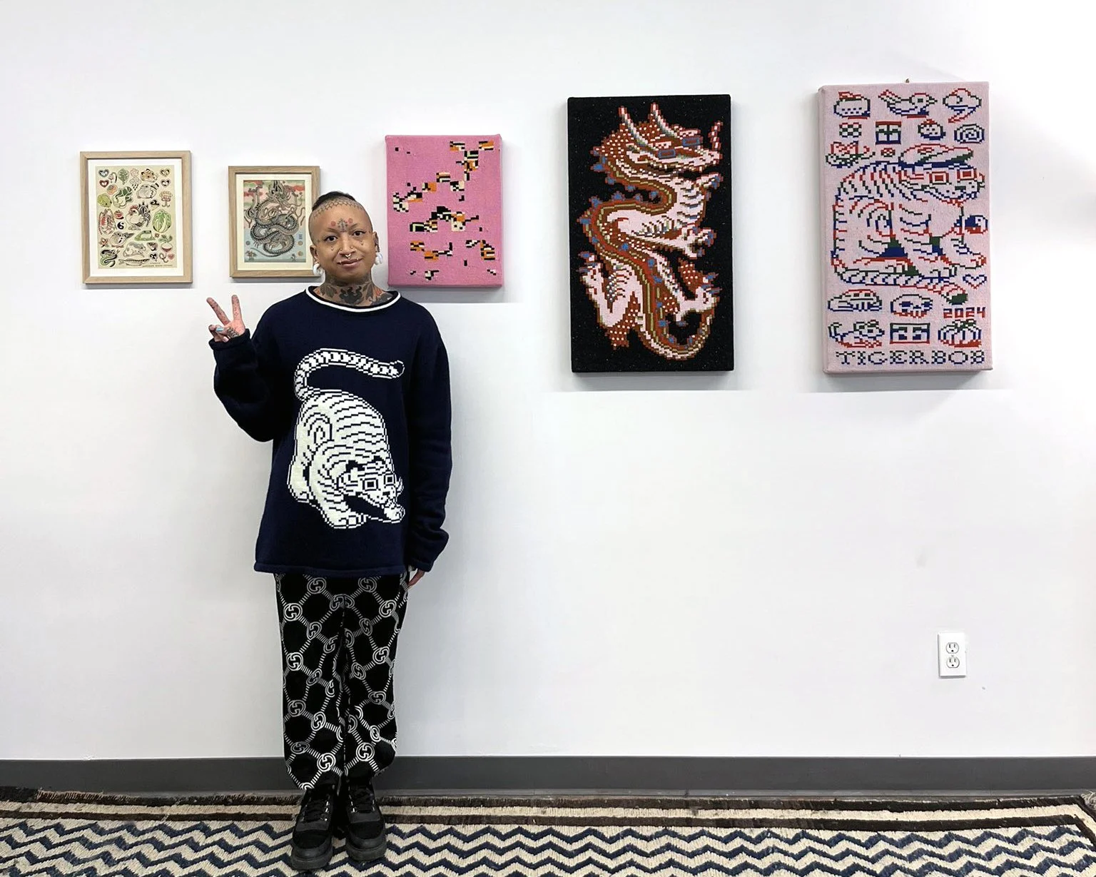 I chose knitting to produce garments and objects because the process allows me to design not only the garment but also the fabric itself. I choose to use the knitting machine, instead of hand knitting, because the process to design and work one row of stitches at a time is interesting to me. The visual pattern on the garment is architectural and becomes a helpful constraint for the body of work. The grid input scales my hand-drawn visual language into a digestible format that works with multiple mediums in my repertoire. The Tigerbob pixel tiger motif was designed with knit outputs in mind.Background