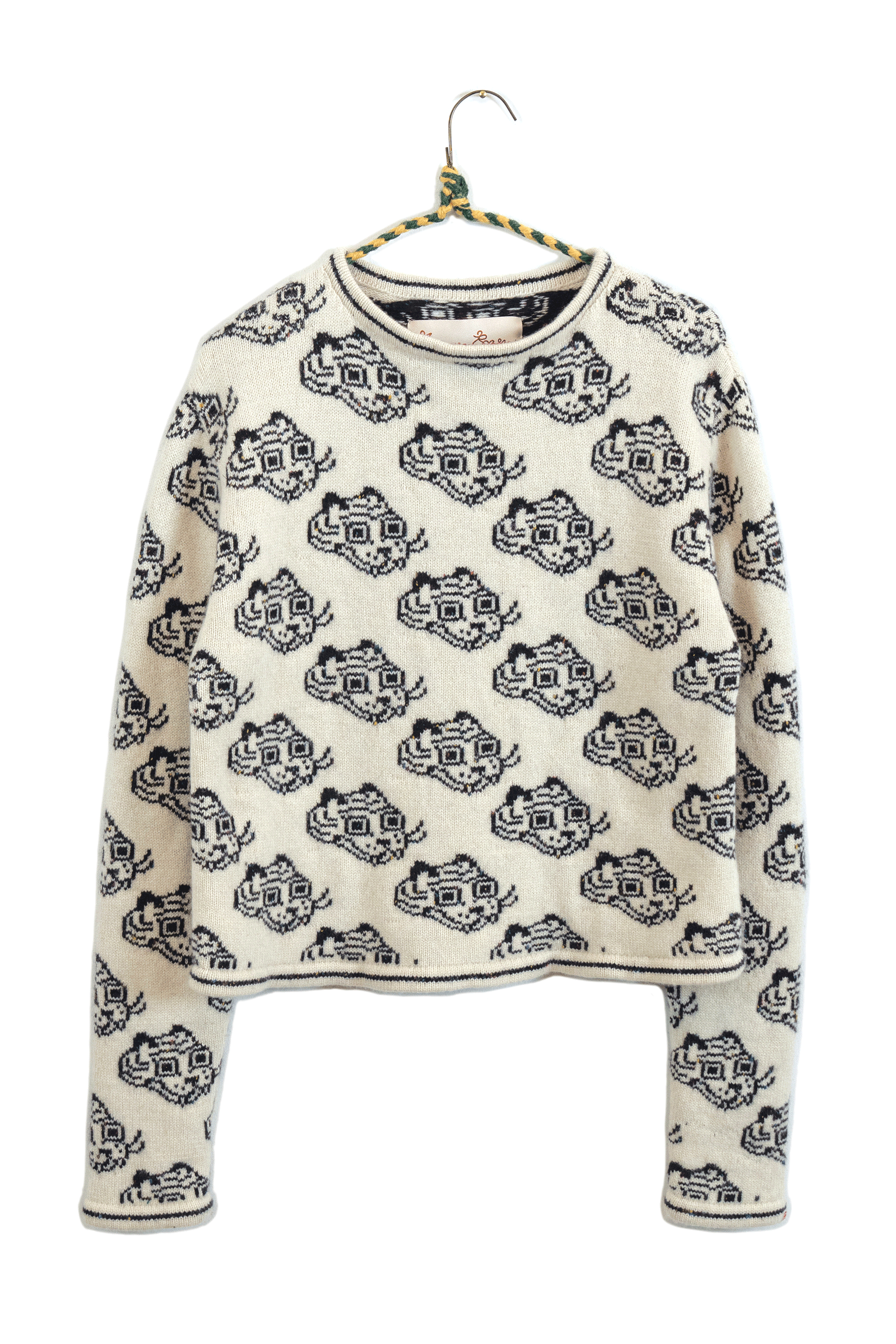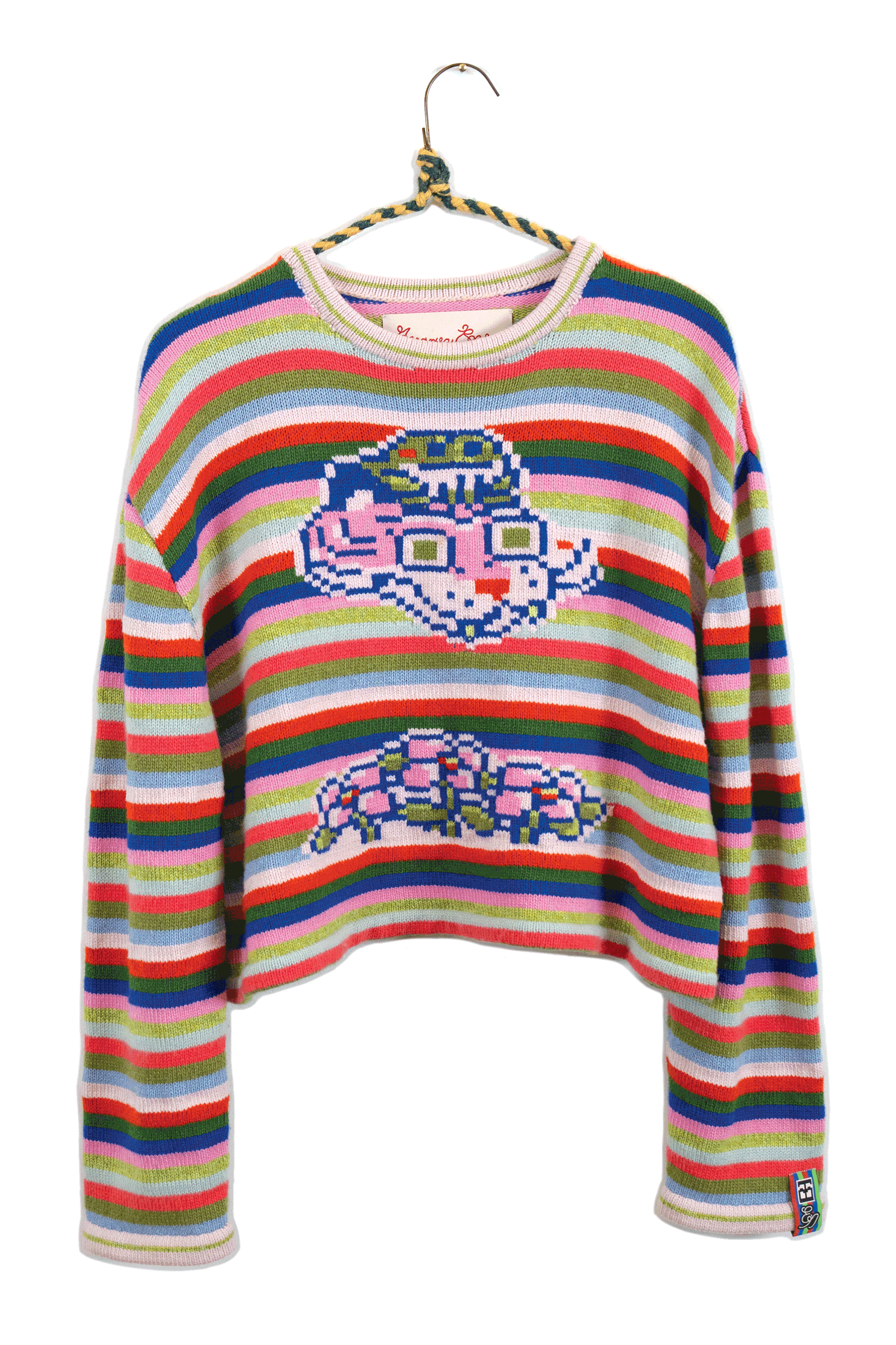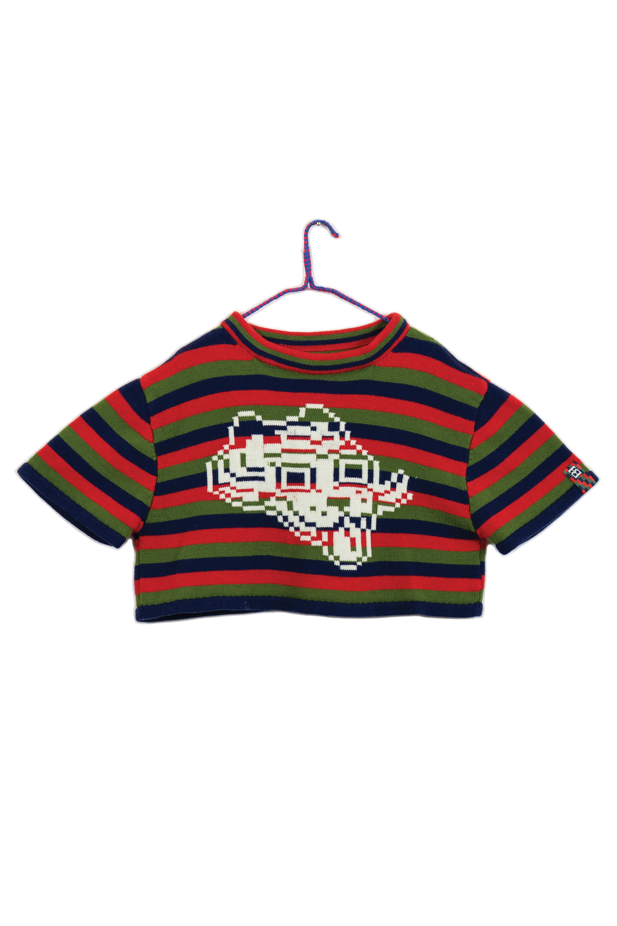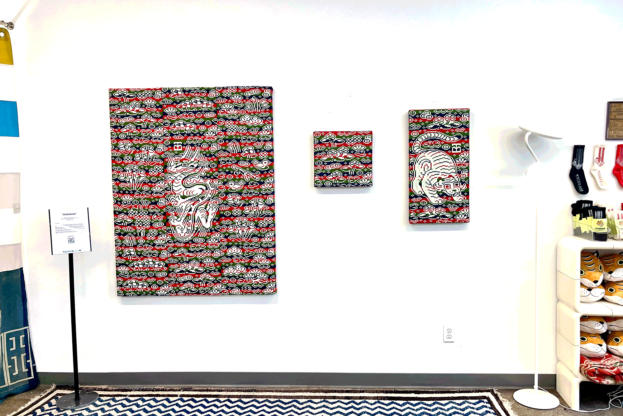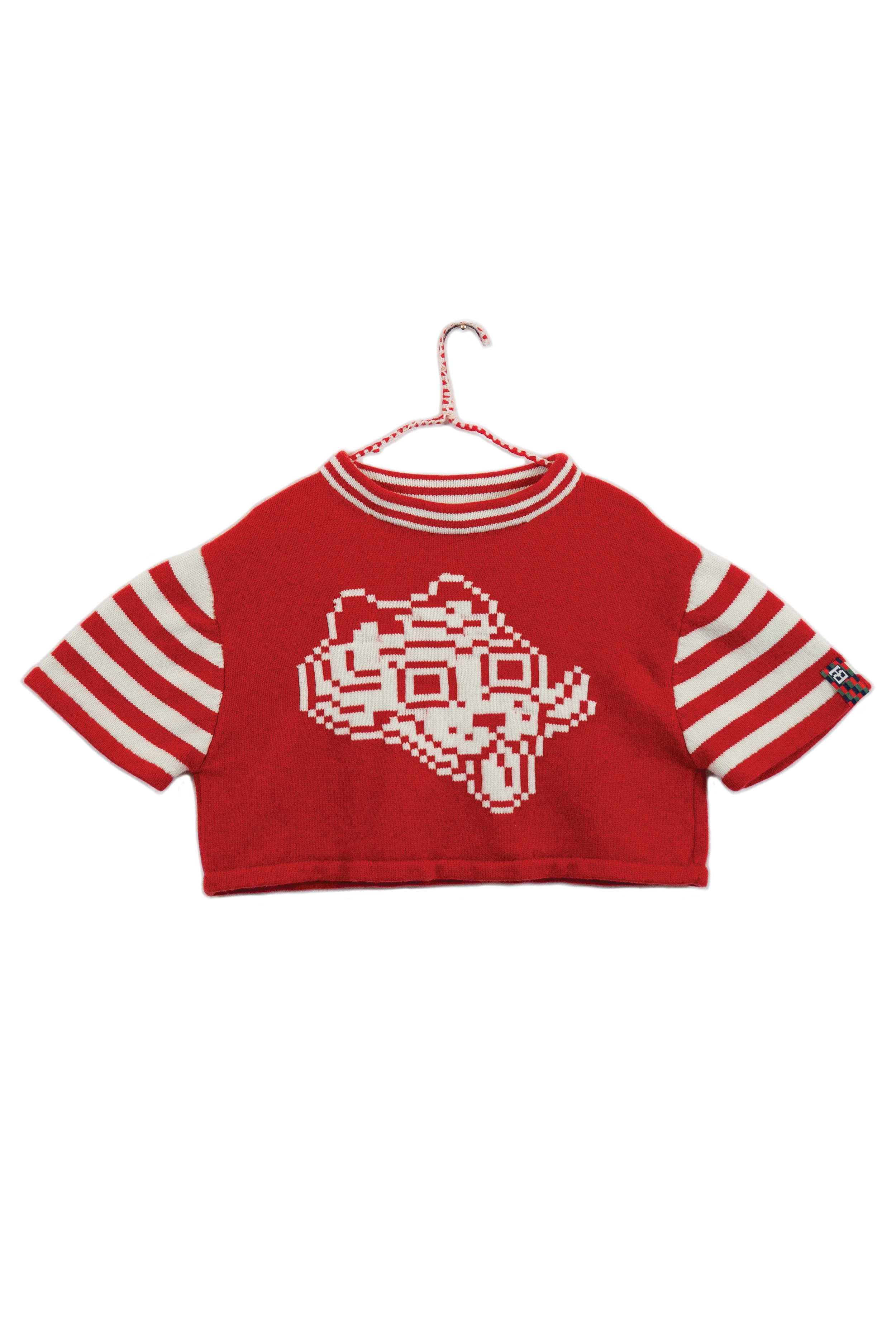 I chose knitting to produce garments and objects because the process allows me to design not only the garment but also the fabric itself. I choose to use the knitting machine, instead of hand knitting, because the process to design and work one row of stitches at a time is interesting to me. The visual pattern on the garment is architectural and becomes a helpful constraint for the body of work. The grid input scales my hand-drawn visual language into a digestible format that works with multiple mediums in my repertoire. The Tigerbob pixel tiger motif was designed with knit outputs in mind.Background